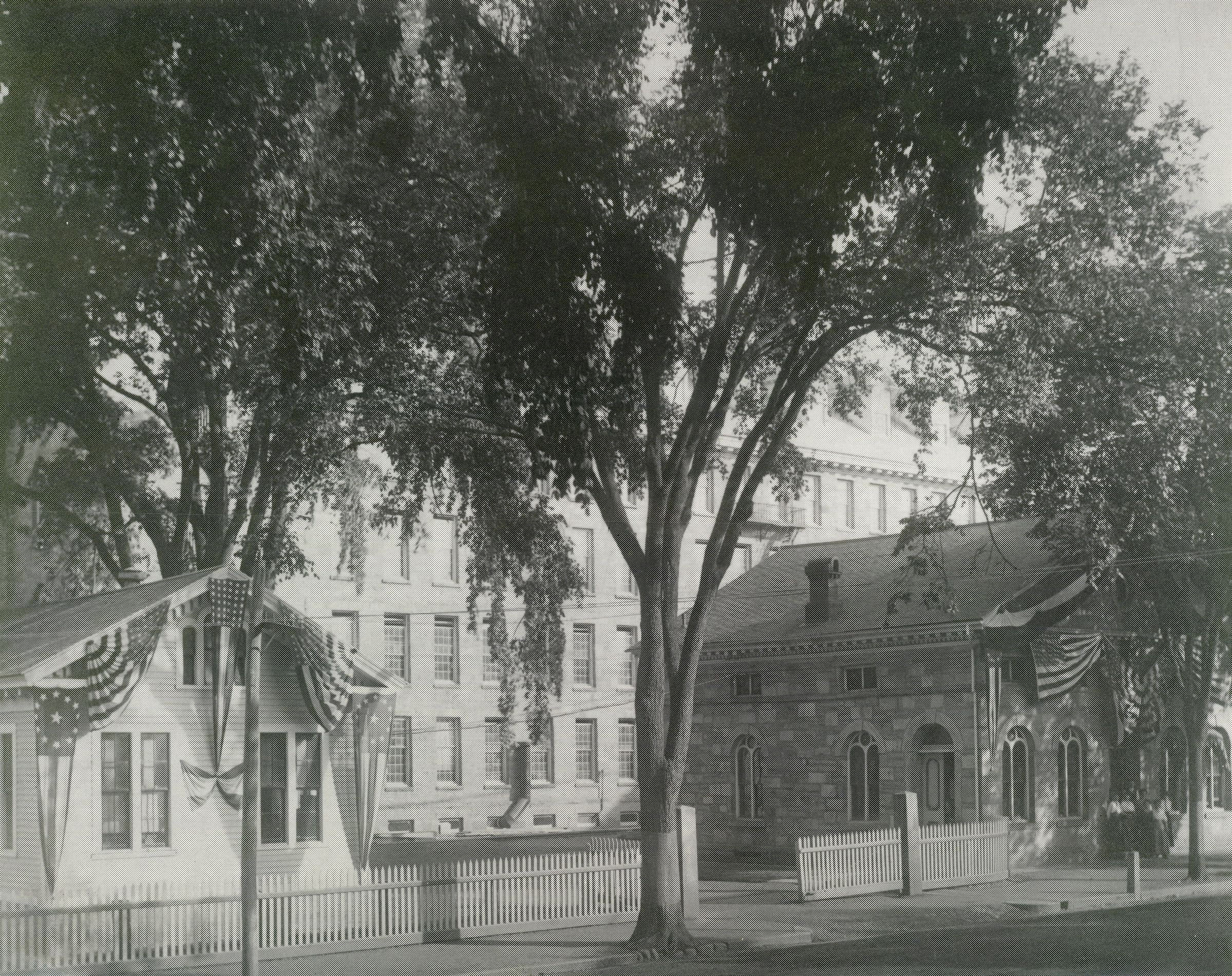 Black and white photographic print of the old stone office building (also known as the personnel office) and adjacent wooden office building, American Thread Company, Main Street, Willimantic, CT. Unknown photographer. Decorated with flags, perhaps for Independence Day. White picket fence instead of the later iron fence. No guardhouse. Mill No. 2 in background. Elm trees. C. 1910.Photograph Details