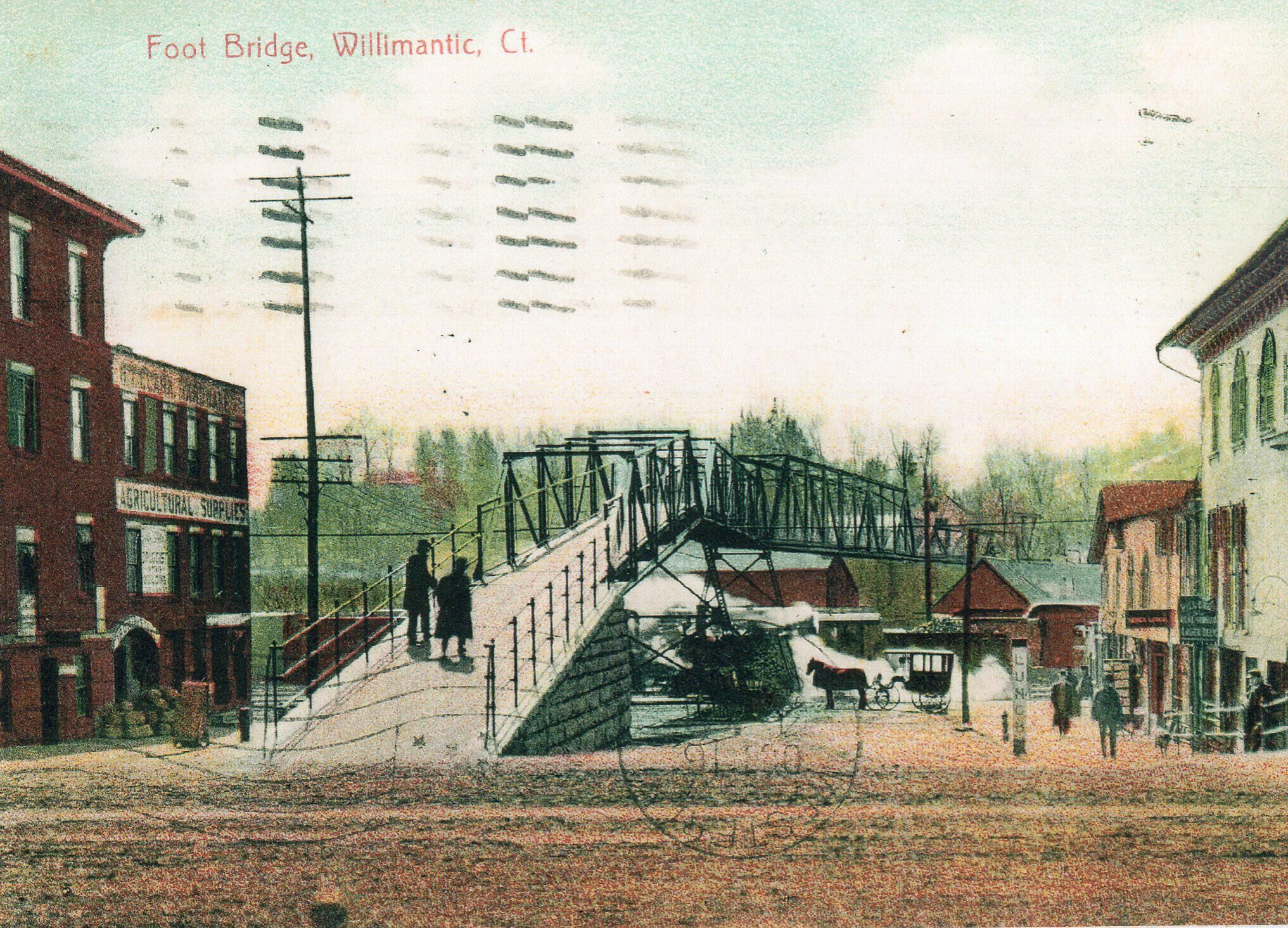 Photograph of a 1900s Postcard. Postcard is of the footbridge in WillimanticPhotograph Details