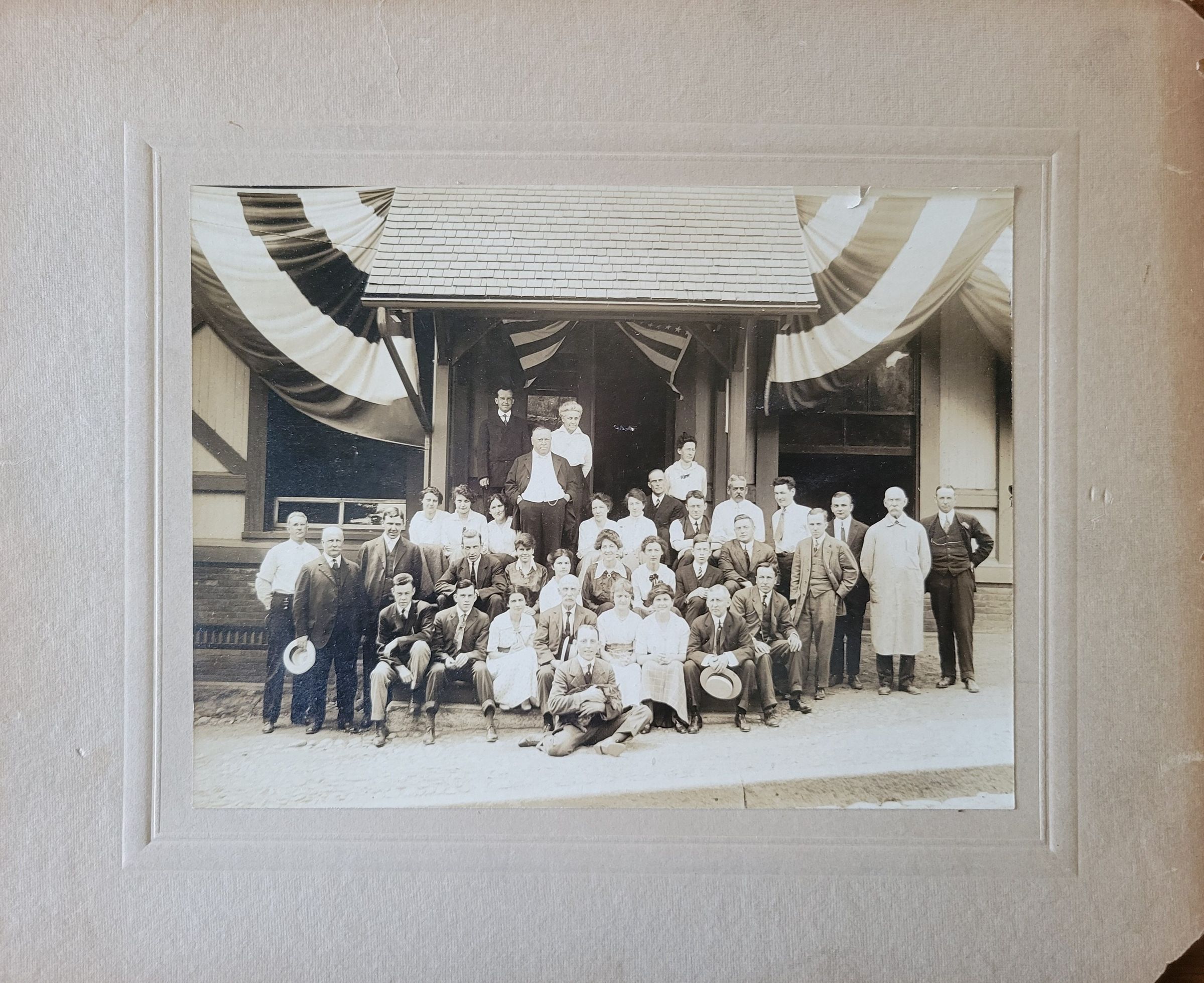 A black and white photograph of a group of men and women outside Dugan Hall's Union St. entrance. The photograph is adhered to a grey mat which is stamped on the back "Devine & Hayes/ Commercial Photographer/ Box 62 St. A. Boston."Photograph Details
