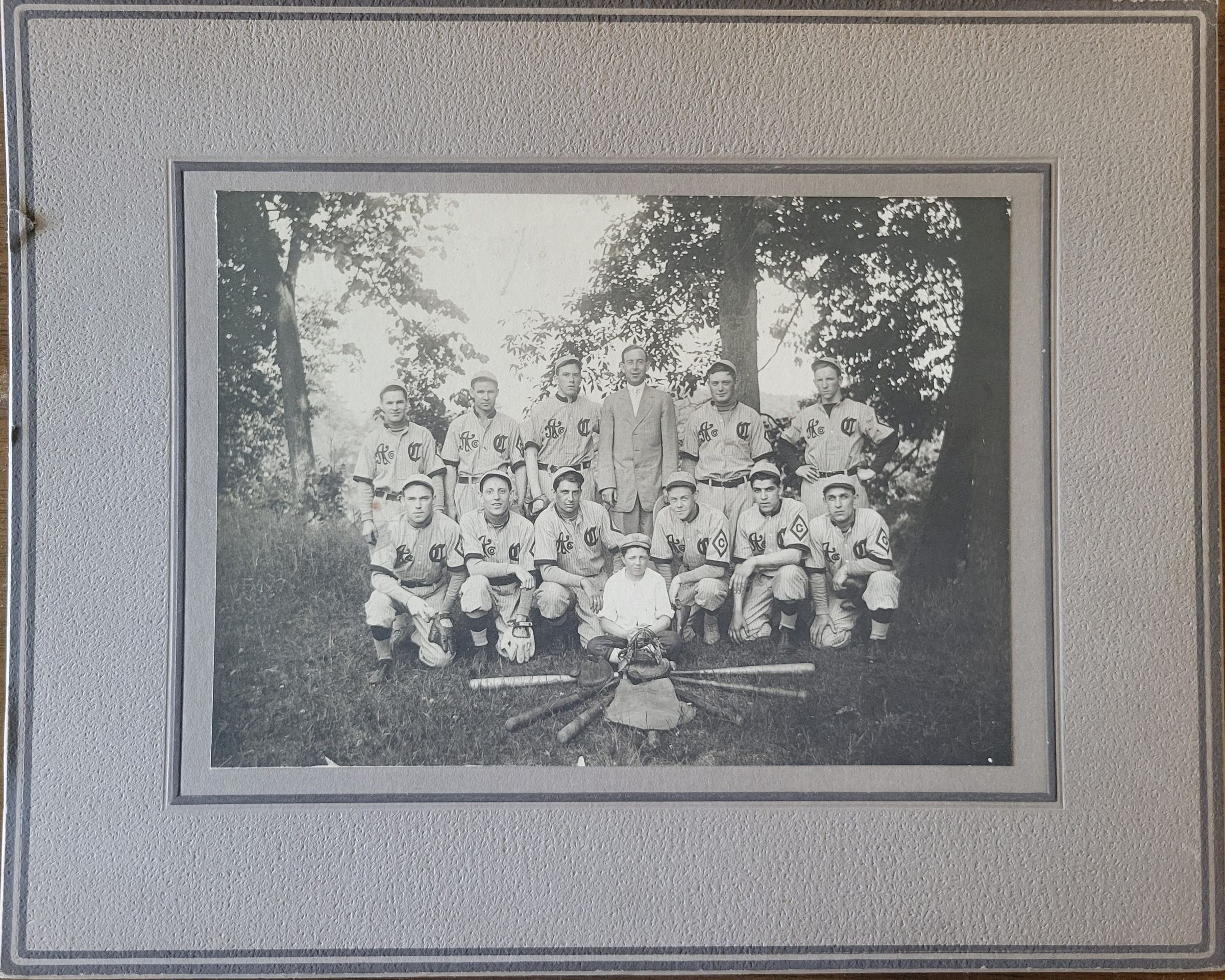 Black and white photograph of 11 baseball players, their coach, and a young boy. Adhered to a grey mat with dark grey pinstriping. The American Thread Company, at the urging of Charles W. Hill, created a baseball league for its employees. Each mill had a team as well as the dye house. Circa 1914.Photograph Details