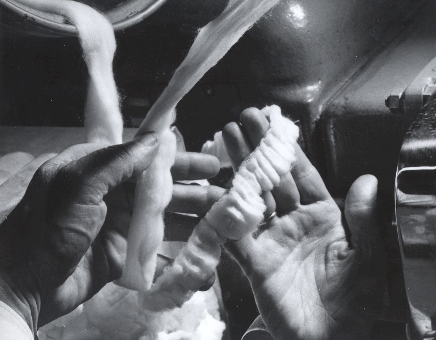 Photograph of the hands of an unknown textile mill worker processing sliver, American Thread Company, Willimantic, CT, c. 1957. Black and white gelatin print. Hugelmeyer Studio, New York, NY.Photograph Details