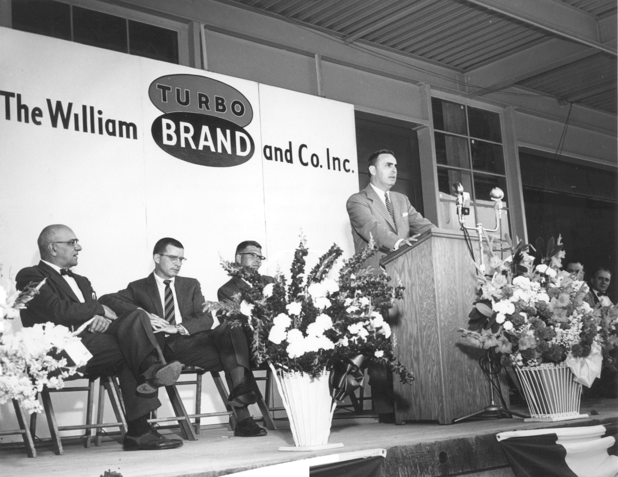Photograph of Connecticut Governor Abraham Ribicoff speaking at the grand opening of the William Brand Company's new factory building on North Street in Willimantic, CT., c. 1955-60. Black and white gelatin print. Graphic Photo Service studio, Willimantic, CT. From left: unknown; Judge Joseph Dannahey; Fred Brand; Governor Ribicoff (in office 1955-61); unknown; Arthur Coutu.Photograph Details