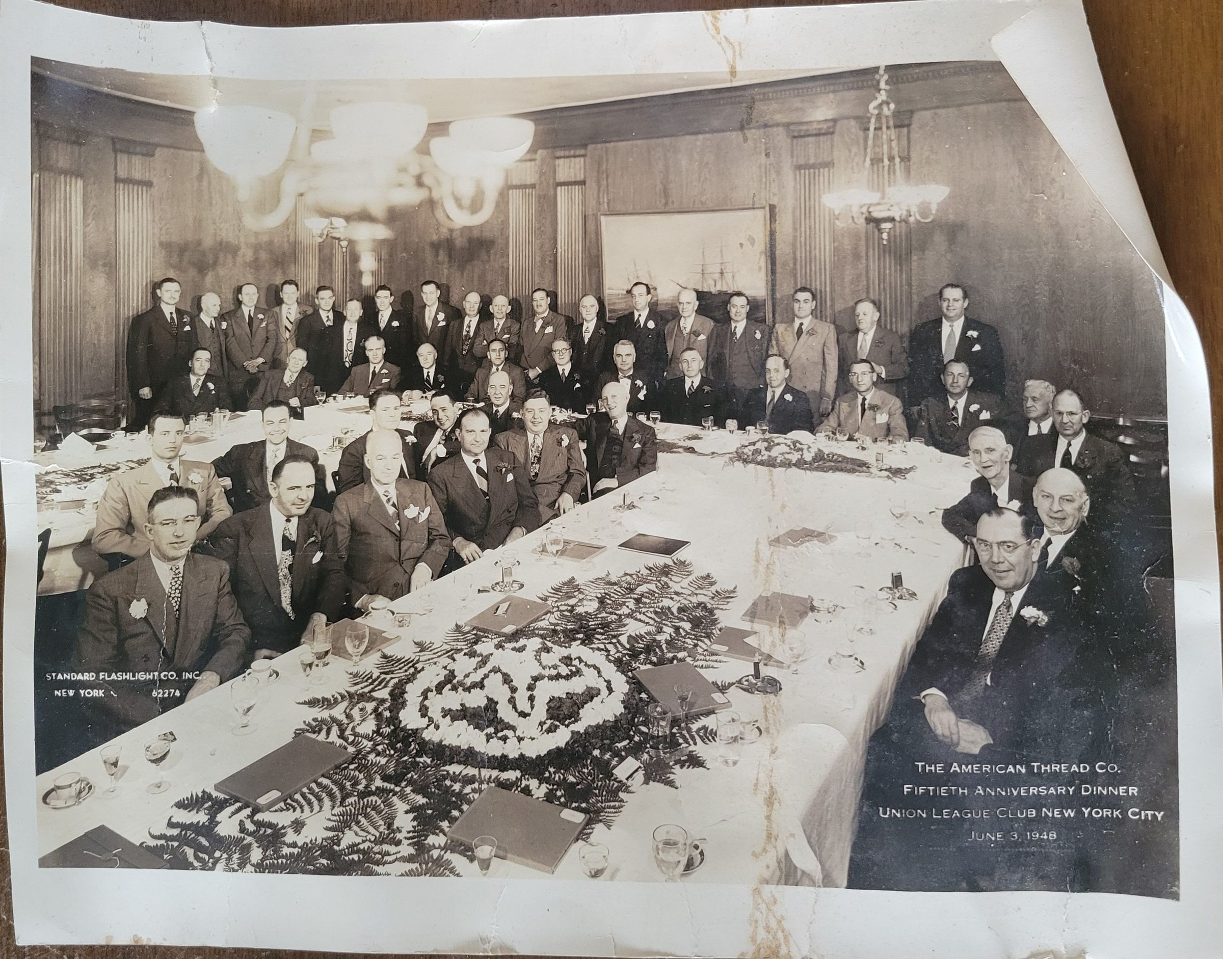A black and white photograph of the American Thread Company's 50th Anniversary Dinner at the Union League Club in New York City. Photograph by the Standard Flashlight Company Inc out of NY and dated June 3rd 1948. Photo is torn and stained at the top edge and badly warped.Photograph Details