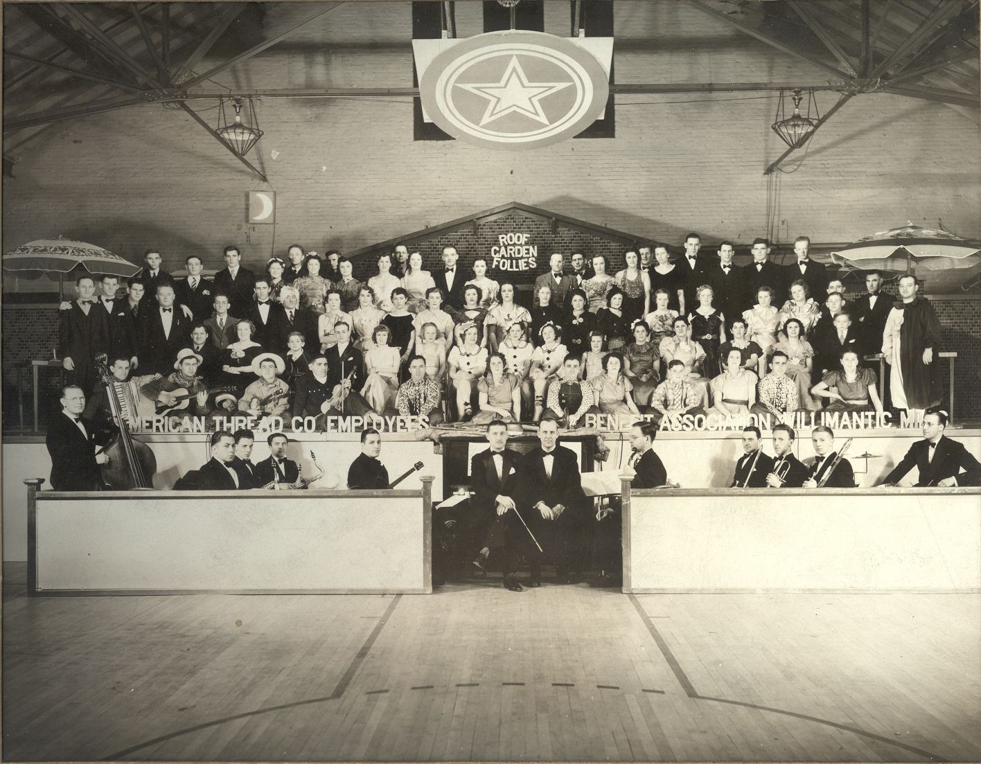 Photograph of the American Thread Company Employees Benefit Association Orchestra performing for the Roof Garden Follies, held in the Willimantic, CT, Armory, c. 1926-33. Black and white gelatin print on glossy paper pasted into a cardboard matte. Unknown photographer. The Armory was located on Pleasant Street. The ATCO Star logo appears affixed to a basketball backboard. The 7th man from the right in the front row is "Matty" Matteson, the orchestra leader, and also the leader of his own dance band. The 8th man is Delphis Dion. Dion is listed in the 1926-32 Willimantic Directories as a clerk at American Thread, but by 1934 he co-owned his own business, Delmar radio Company, selling and servicing radios, washers, and refrigerators at 31 Church Street in Willimantic. He lived at 93 North Street.Photograph Details