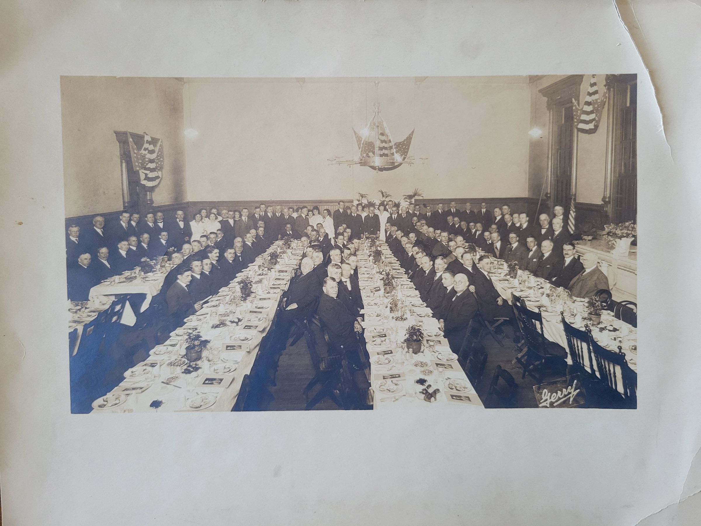 Photograph of the American Thread Company Willimantic Mills banquet in honor of the appointment of Peter J. Hinds as General Superintendent of Manufacturing. Photographed by L.G. Gerry of Willimantic, CT, January 26, 1922. Photograph border is torn on top left corner.Photograph Details