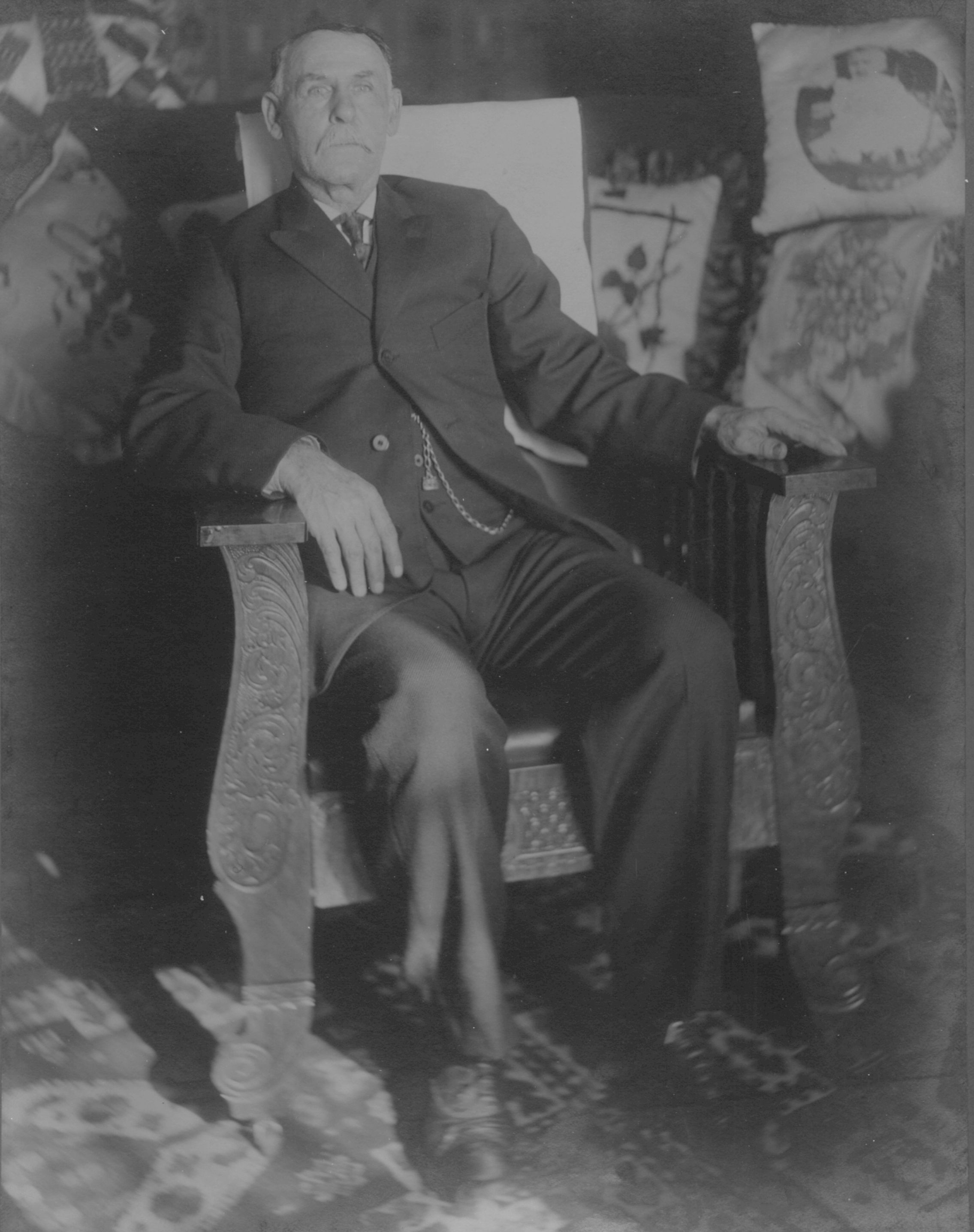 Photograph of George Washington Snow, landlord of the Elms boarding house (owned by the American Thread Company) sitting in a chair in the Elm's parlor, Willimantic, CT, c. 1910-18. Black and white gelatin print pasted onto cardboard. Photo by William E. Weber, a commercial photographer. George W. Snow was married to Julia Lamb Snow, who was the Elms's matron. George W. Snow is listed as a resident of the Elms in the 1910-18 Willimantic Directories. He may have been a retired carriage maker. William E. Weber is listed in the 1910-18 Willimantic Directories as a clerk for the ATC. He lived at 54 Turner St, Willimantic, CT.Photograph Details