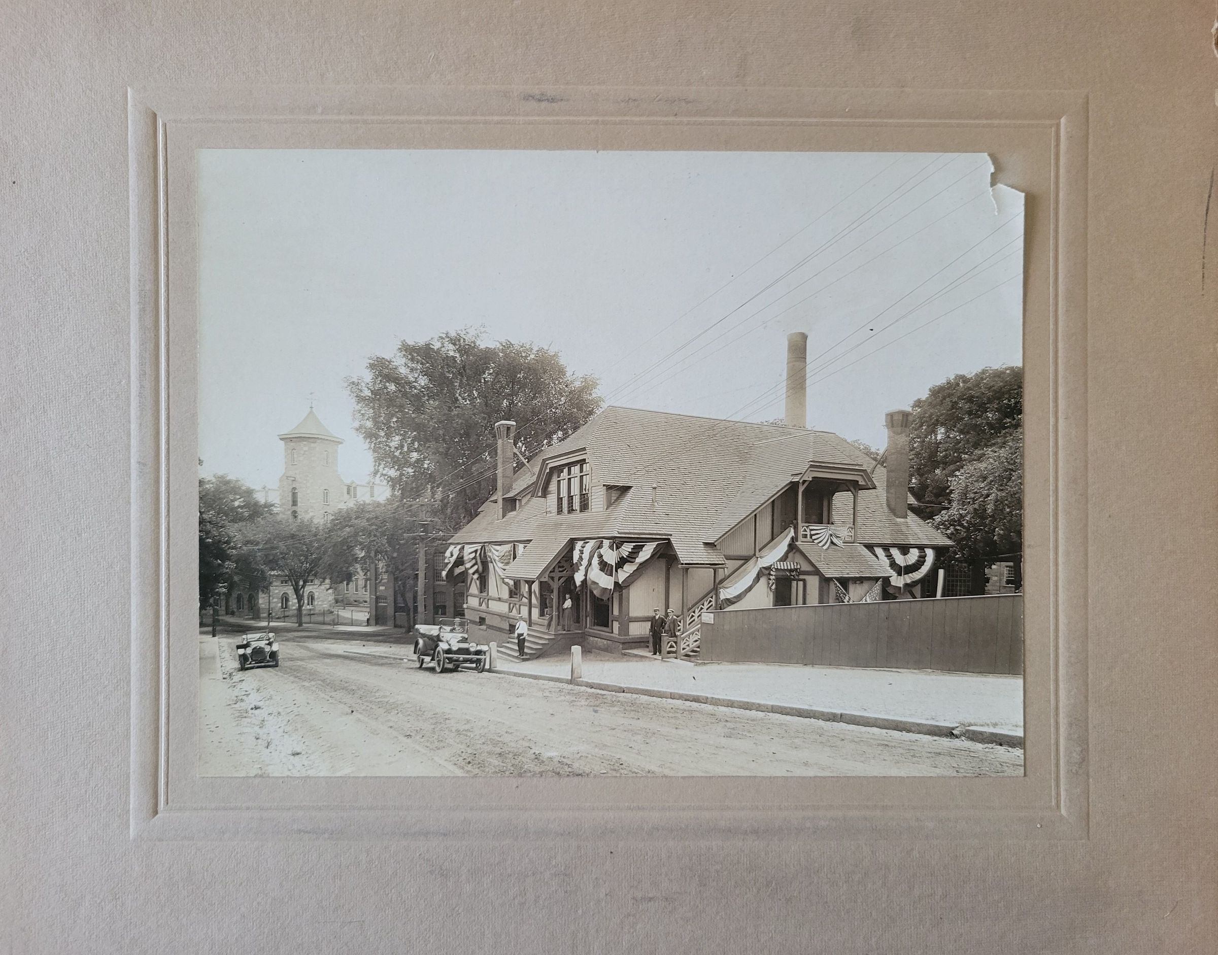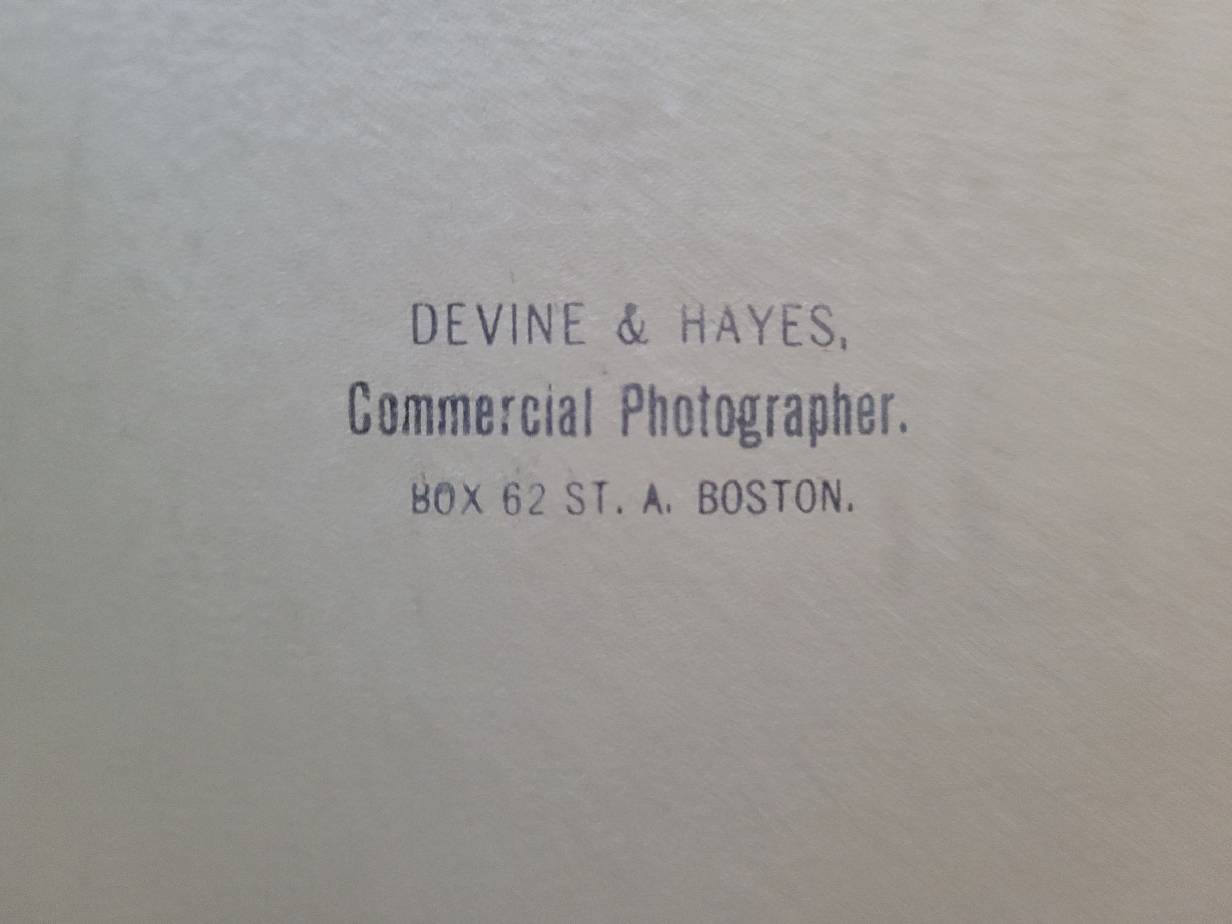 A black and white photograph of Dugan hall from its Union St. entrance. The photograph is adhered to a grey mat which is stamped on the back "Devine & Hayes/ Commercial Photographer/ Box 62 St. A. Boston." Photograph is missing its top right corner.Photograph Details