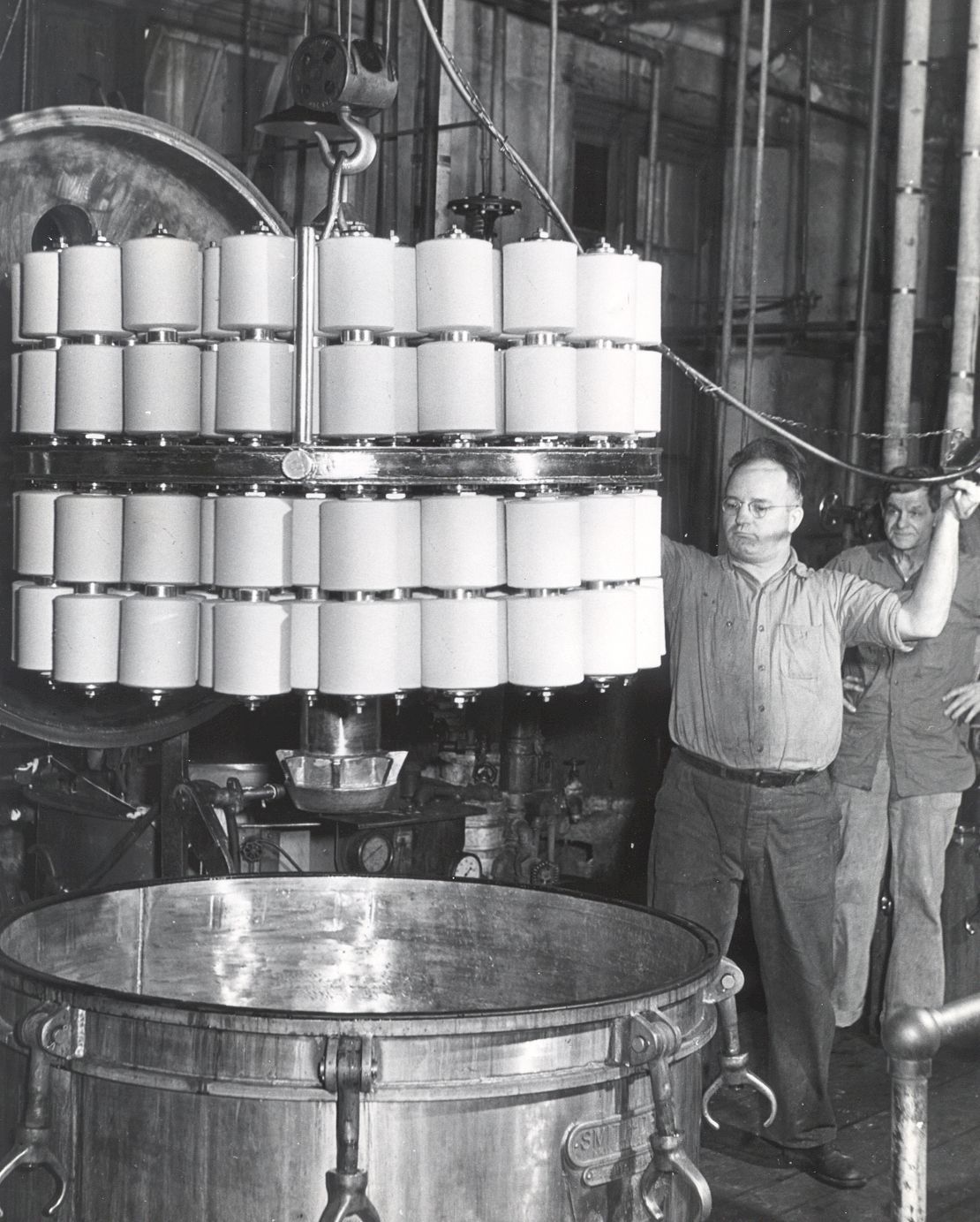 Photograph of Dye Master Victor Turcotte operating a pressure dye vat, American Thread Company, Willimantic, CT, c. 1957. Black and white gelatin print. Hugelmeyer Studio, New York, NY. Pressure dye vats, a 20th-century invention, allowed mills to dye thread already wound onto special steel spools. Leftover dye was dumped into the Willimantic River.Photograph Details