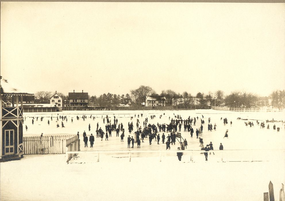 Photograph of ice skating at Recreation Park or Windham County Fairgrounds, depending on the date, Willimantic, CT. Black and white albumen print. Unknown photographer. Unknown date, but possibly c. 1915. The American Thread Company built Recreation Park for its workers and other Willimantic residents on the site of the old Windham County Fairgrounds, which also had been built by ATCO.Photograph Details