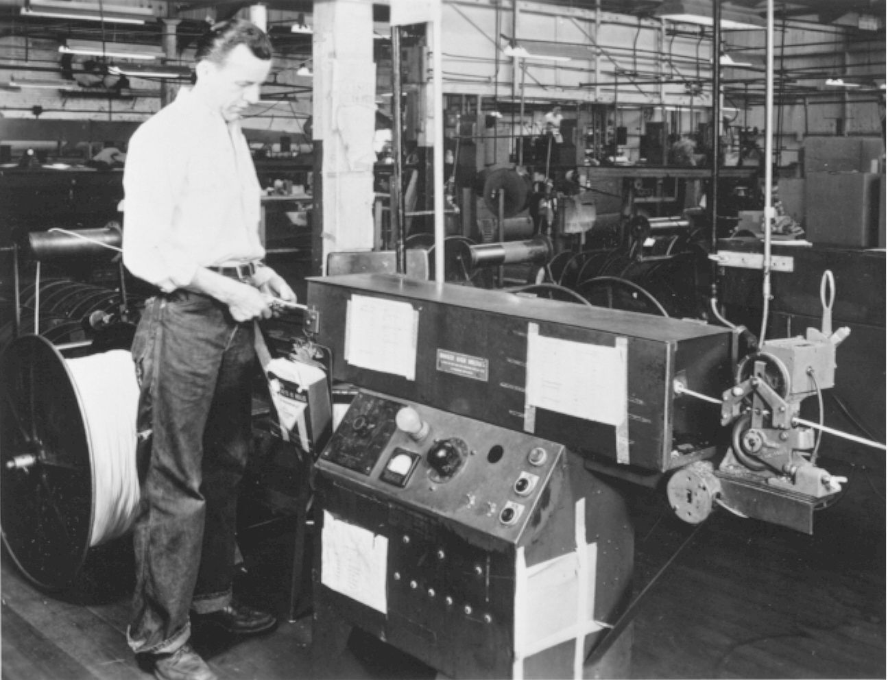 Photograph of worker Norbert Aubin spark testing at the William Brand Company's North Street factory, Willimantic, CT, c. 1955-60. Black and white print. Unknown photographer.Photograph Details