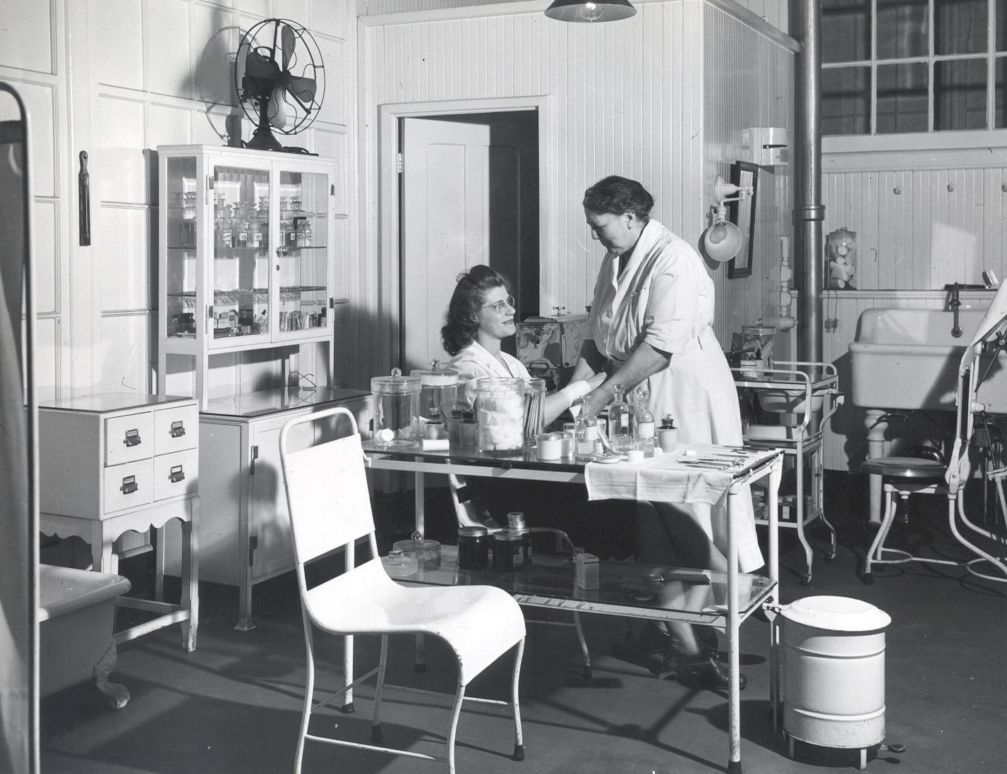Photograph of a textile mill worker and nurse at the American Thread Company's infirmary in Willimantic, CT, c. 1957. Black and white gelatin print. Hugelmeyer studio, New York, NY.Photograph Details