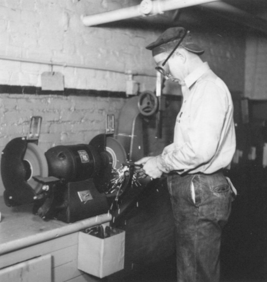 Textile mill worker in machine shop using grinderCollection