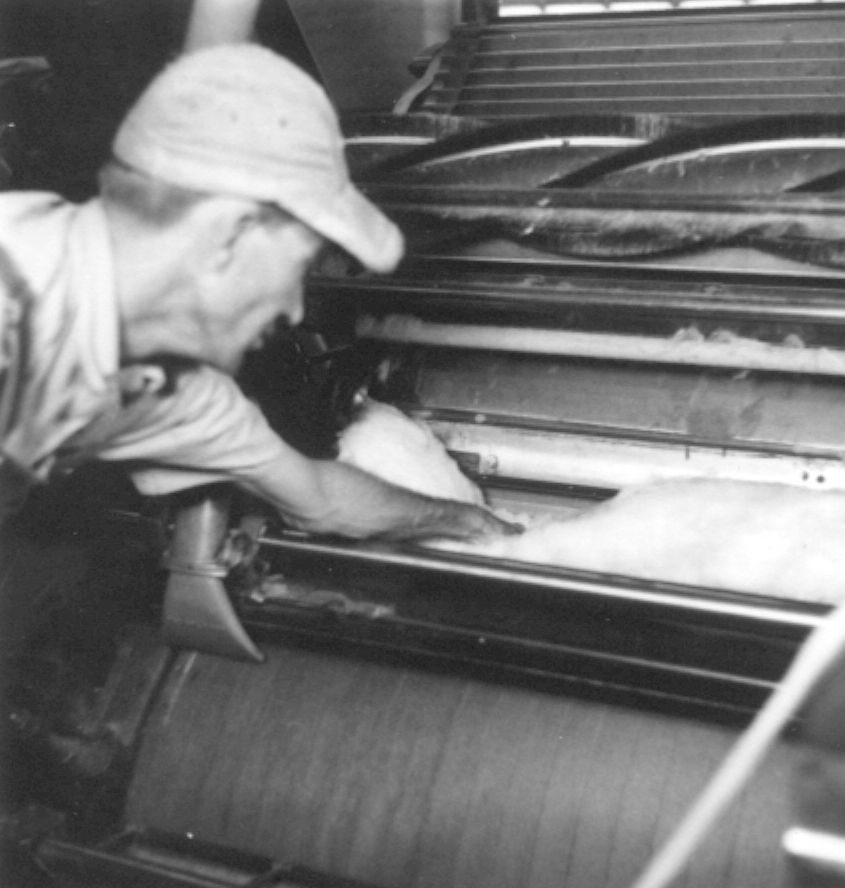 Photograph of unidentified textile mill worker, American Thread Company, Willimantic, CT, 1943. Black and white gelatin print. Unknown photographer. The worker is reaching into a carding machine. This photograph, along with several others taken at the same time, is part of a pair: one photo shows the worker exercising proper safety protocols, while the other shows the same worker doing the same task, but without using the proper safety protocols. This photograph shows the worker doing the wrong thing: reaching into the machine.Photograph Details