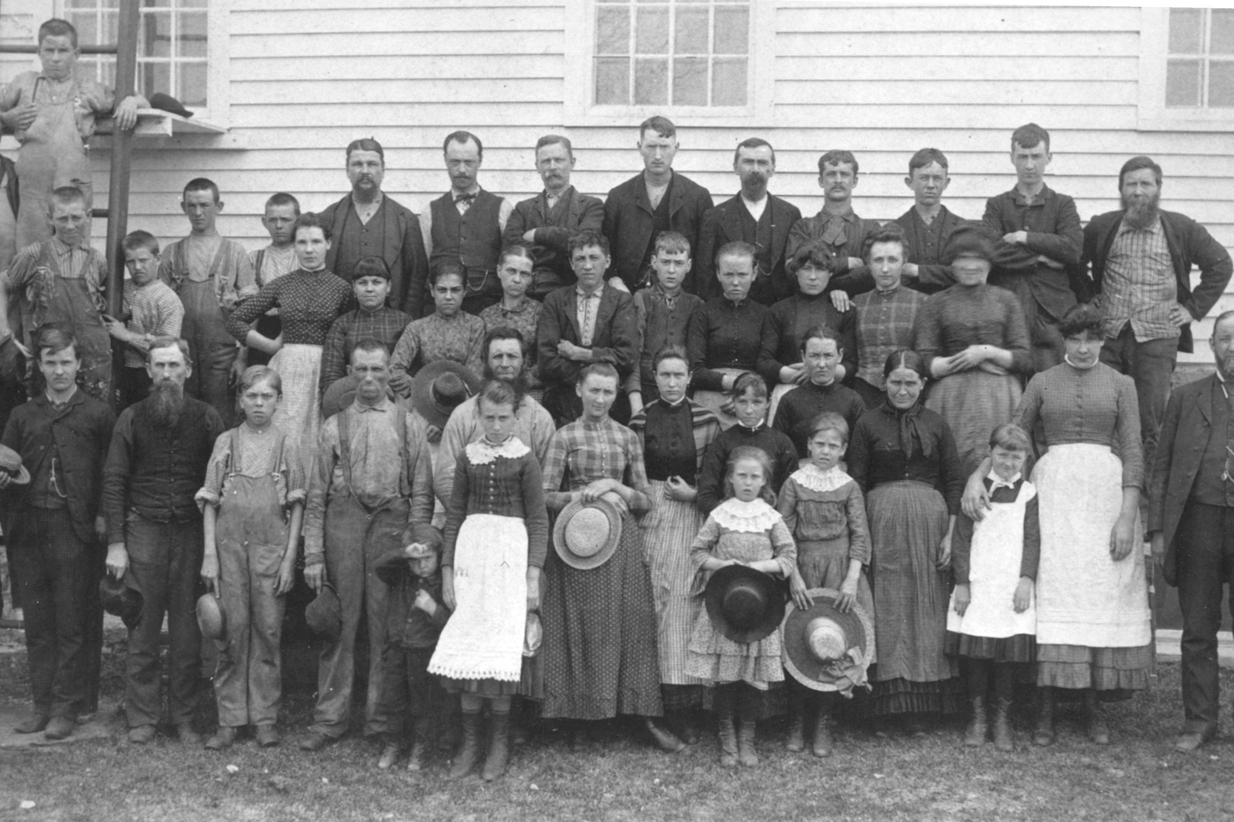 Copy of a photograph of the workforce at the Hop River Mill, a small cotton mill in Columbia, CT, 1879. This is an exhibit-quality image mounted on thick cardboard and was probably part of an exhibit at the Mill Museum in the early 1990s. The Museum has no information about the original photograph.Photograph Details