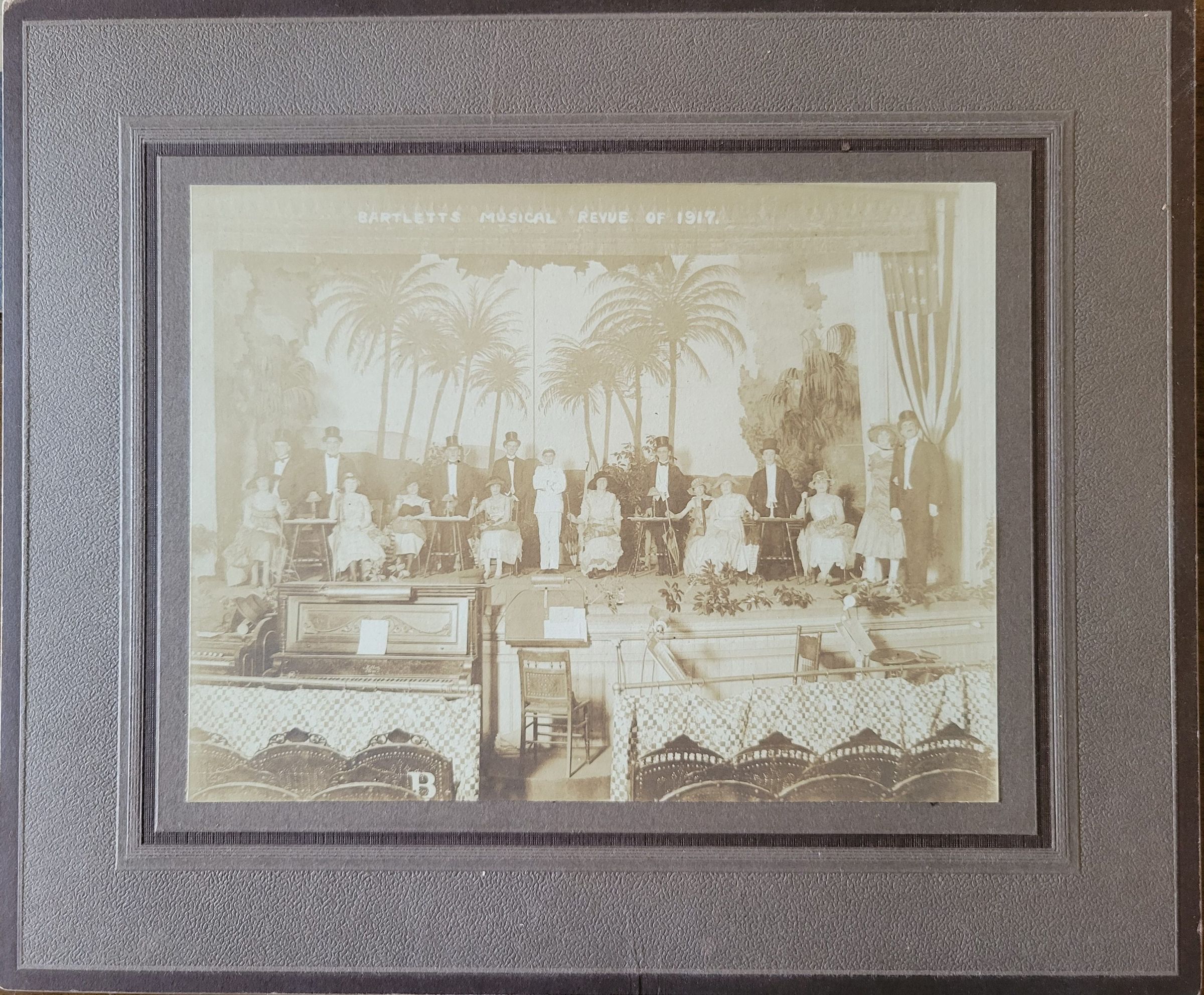A photograph of performers in Bartletts Musical Revue at the Loomer Opera House in Willimantic, CT. At the top is handwritten in white, "Bartletts Musical Revue of 1917". The handwriting is part of the print, not written on top. The photograph is adhered to a black and grey mat. Photographer unknown.Photograph Details
