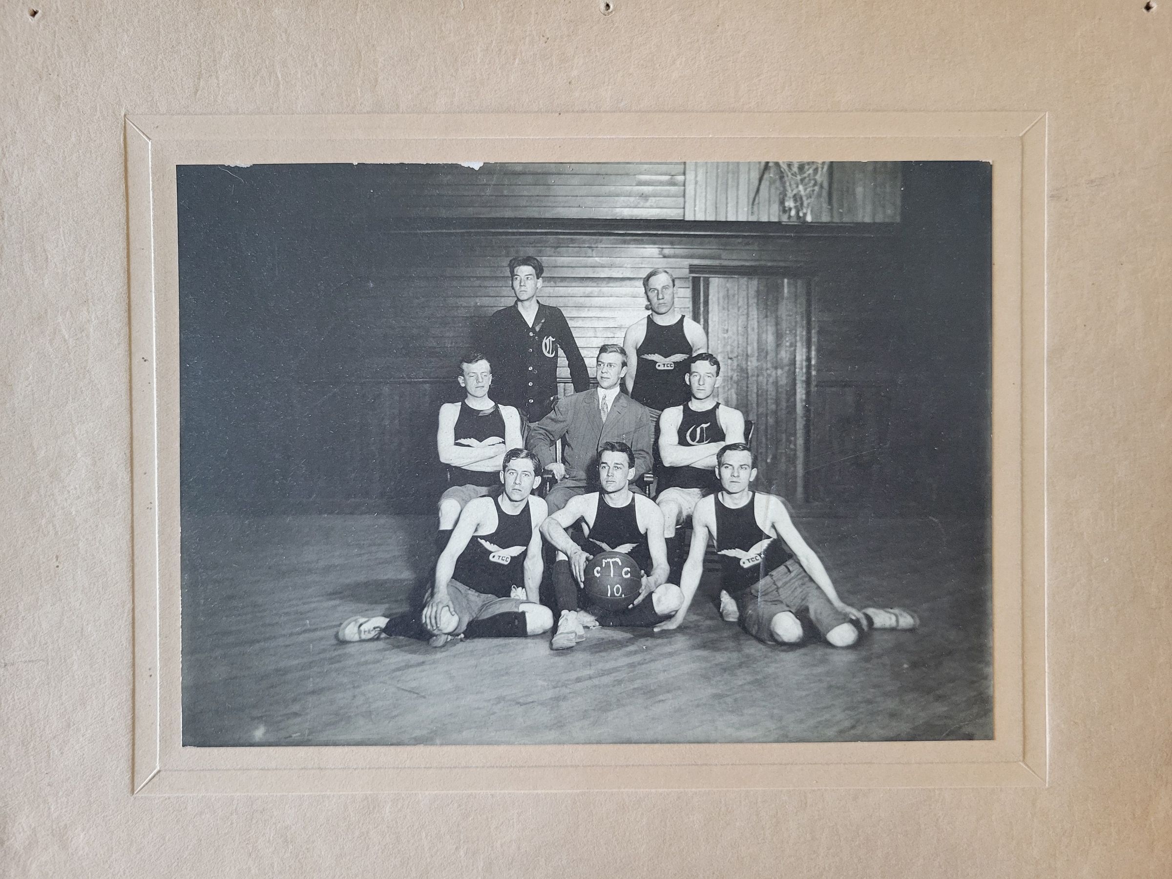 A black and white photograph of the Thread City Cyclers basketball team and their coach. The photograph is adhered to a beige mat which has three pin holes across the top. From 1901 to 1902 the Thread City Cyclers club hosted a basketball team which played games locally in Willimantic, CT as well as out of town. The club hosted a number of other athletic teams but was founded in 1890 strictly as a cycling club. It catered to the local wealthy families since at the time of its inception bicycles were beyond the means of the average mill worker. It still exists as a cycling club as of 2024.Photograph Details