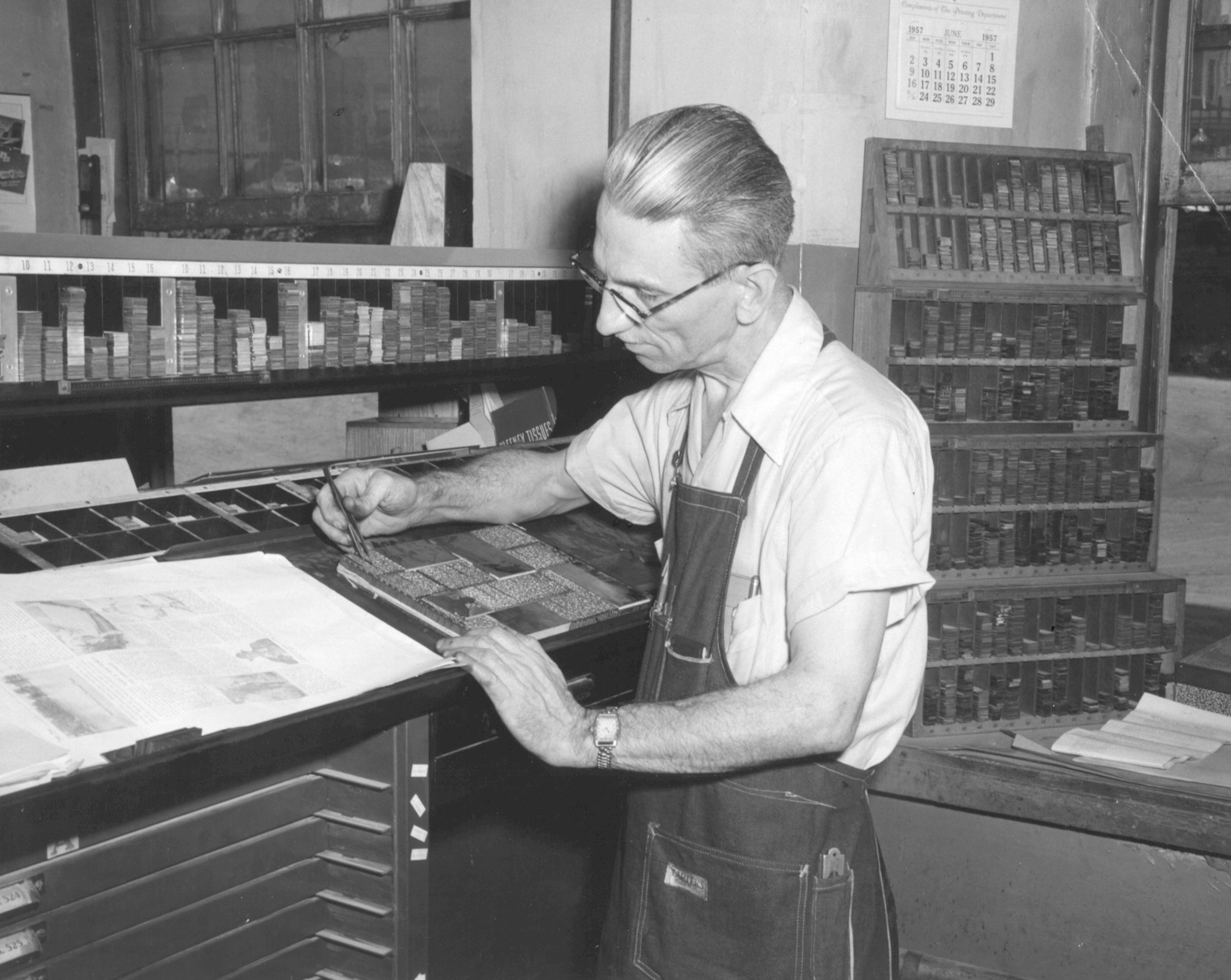 Photograph of unidentified worker in print shop, American Thread Company, Willimantic, CT, 1957.Photograph Details