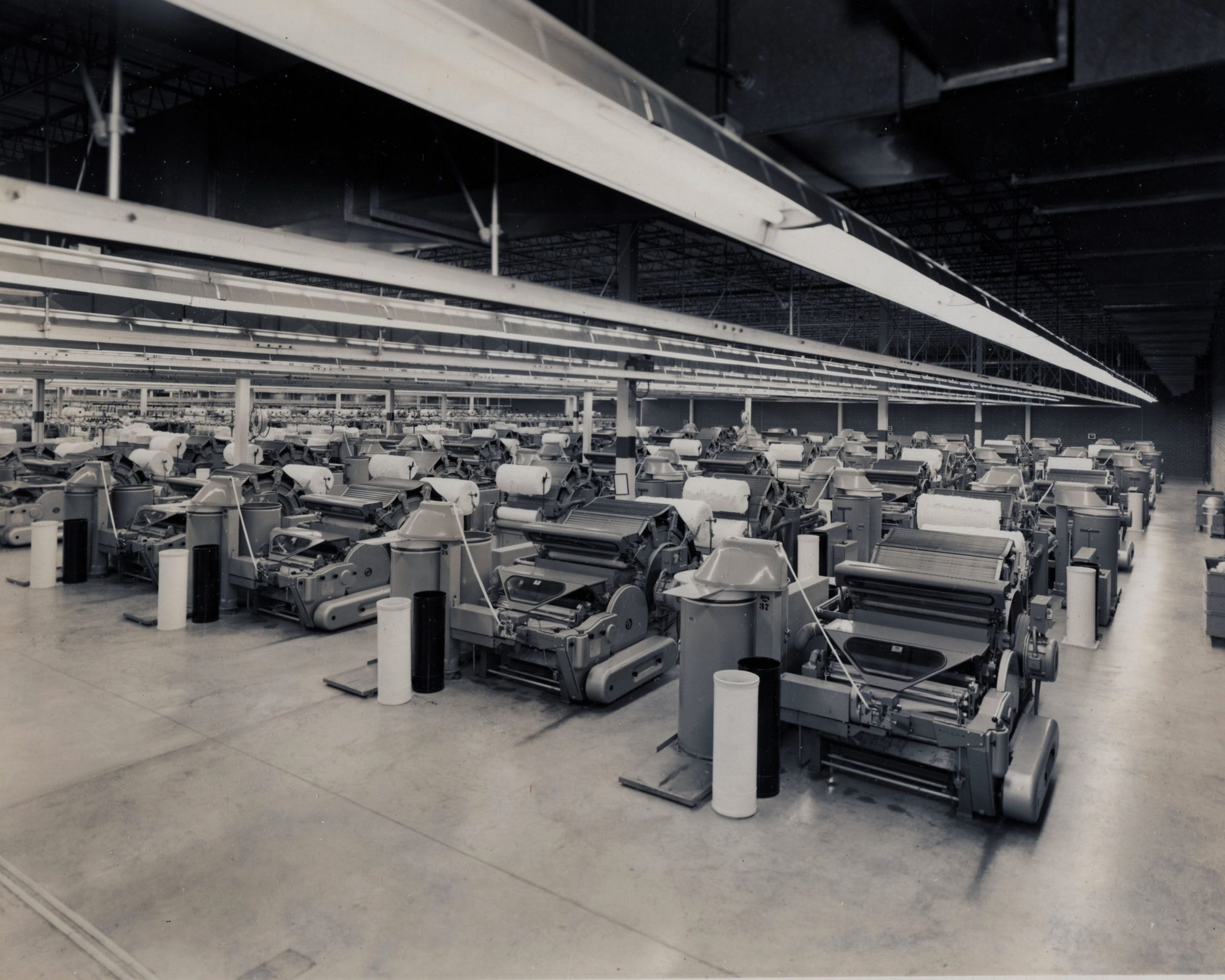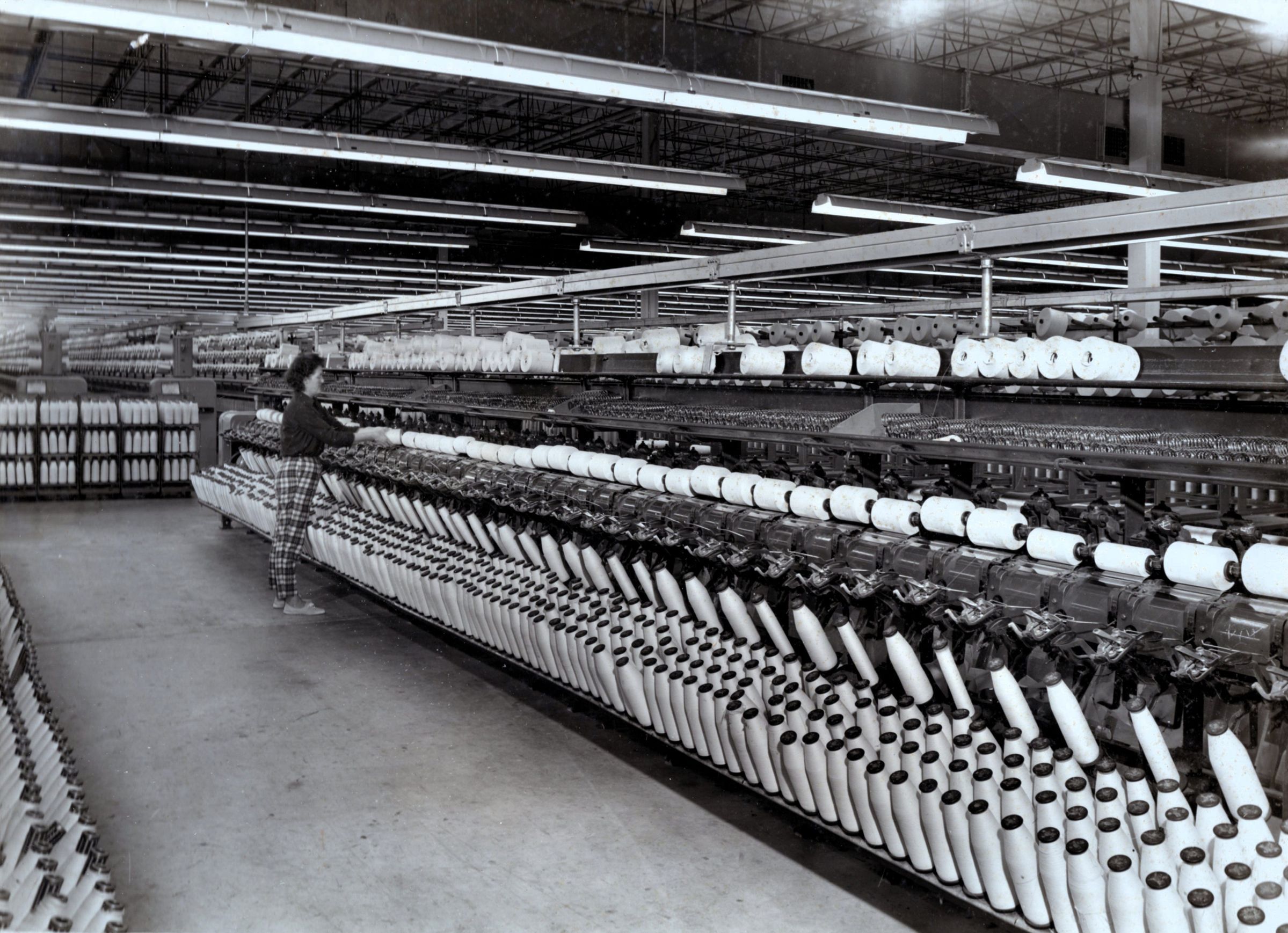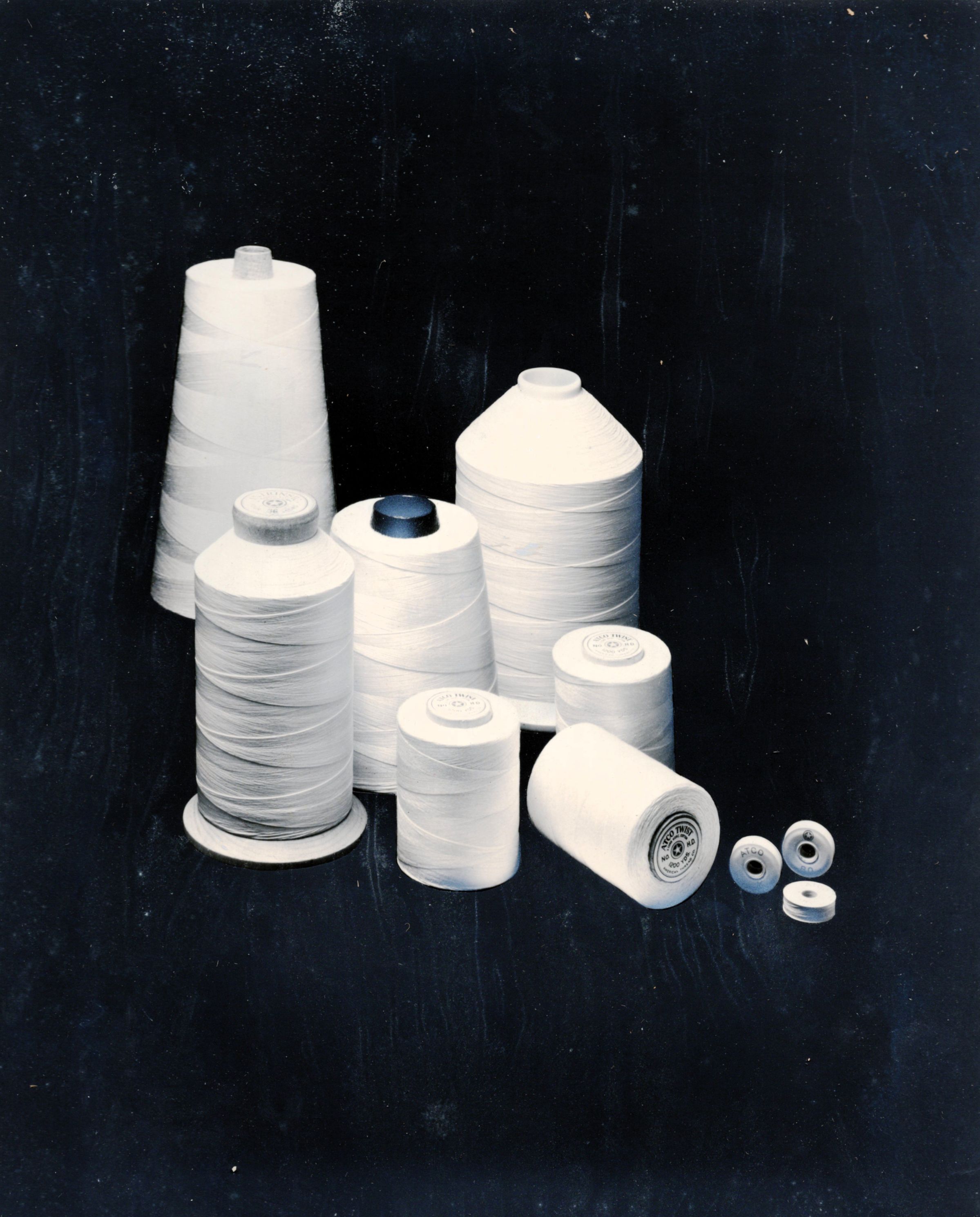Eight professional-quality black-and-white photographs taken at one of the American Thread Company's Southern mills -- probably the mill in Marion, NC, which was not far from Asheville, NC. They were taken in January 1966 by Putnam Photography Studio, 63 Elkmont Drive, Asheville, NC. Seven of the photos are glued to pieces of Bainbridge Board. The eighth (the only one labeled) is matted. On the reverse of the matted photo is written in pencil: "Foster winder -- 10 / Helen Brown -- winder operator -- after twisting, / Yarn is wound on springs or cones prior to packing for shipment / to Sevier for finishing / HELEN BROWN." "Sevier" refers to another one of ATCO's Southern mills, in Tennessee.Photograph Details