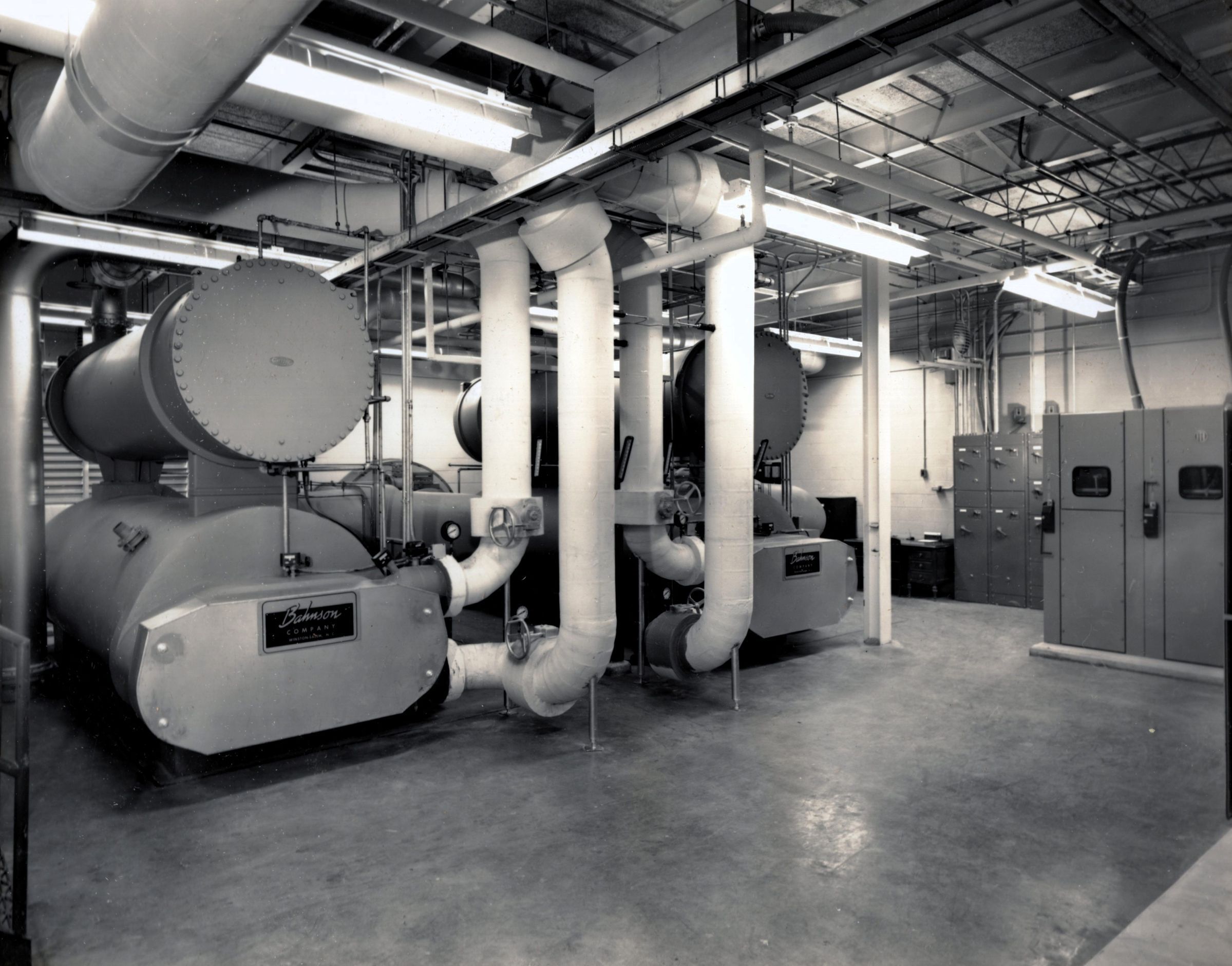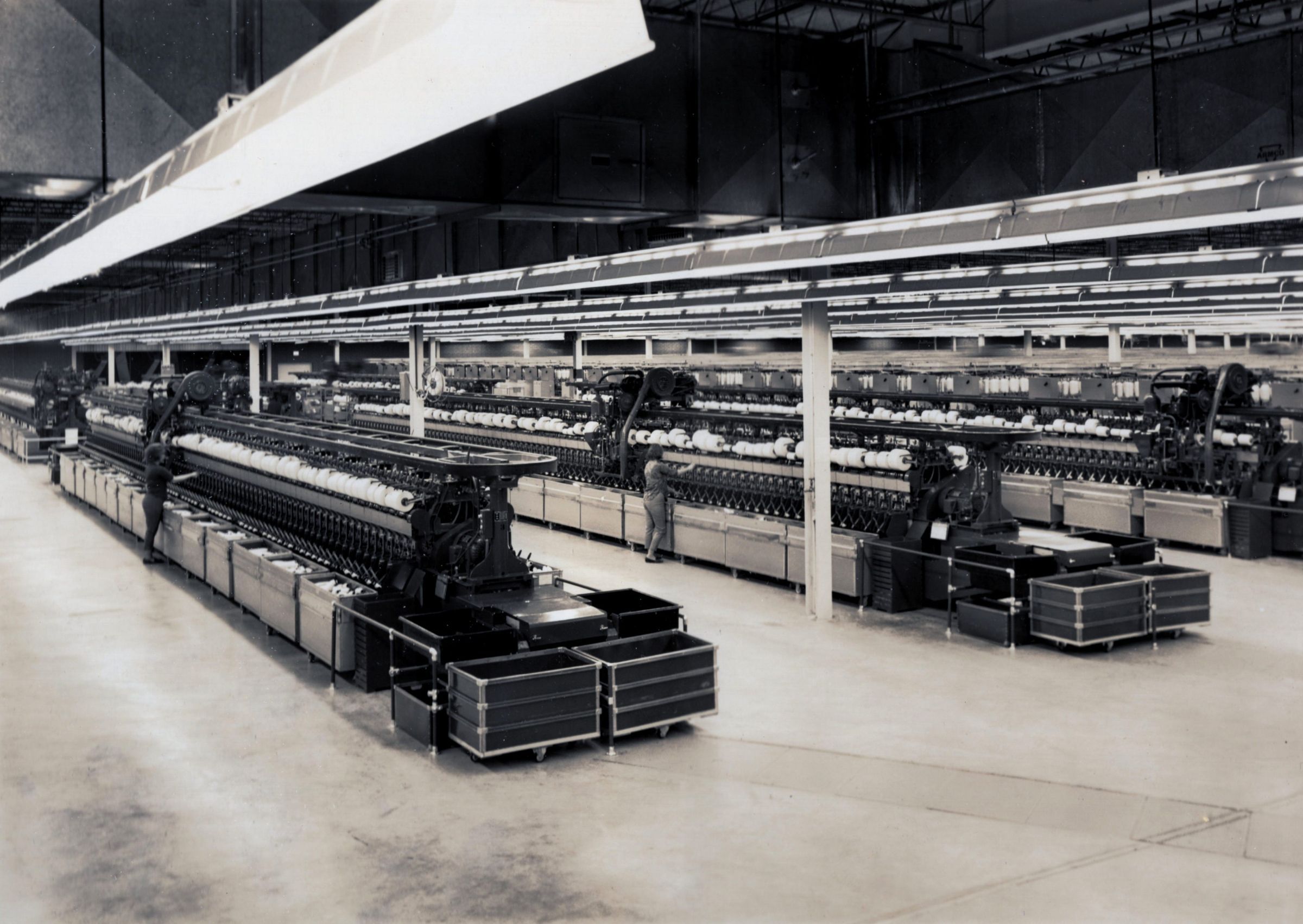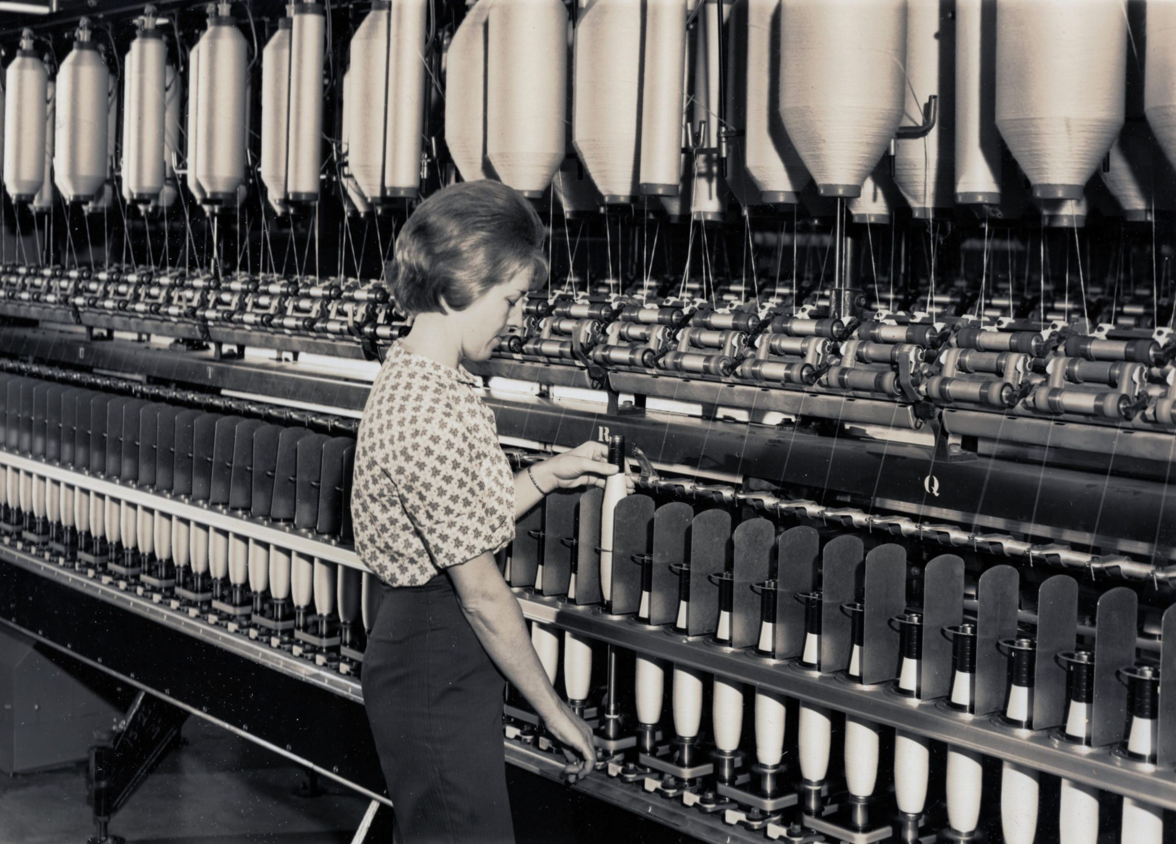 Eight professional-quality black-and-white photographs taken at one of the American Thread Company's Southern mills -- probably the mill in Marion, NC, which was not far from Asheville, NC. They were taken in January 1966 by Putnam Photography Studio, 63 Elkmont Drive, Asheville, NC. Seven of the photos are glued to pieces of Bainbridge Board. The eighth (the only one labeled) is matted. On the reverse of the matted photo is written in pencil: "Foster winder -- 10 / Helen Brown -- winder operator -- after twisting, / Yarn is wound on springs or cones prior to packing for shipment / to Sevier for finishing / HELEN BROWN." "Sevier" refers to another one of ATCO's Southern mills, in Tennessee.Photograph Details