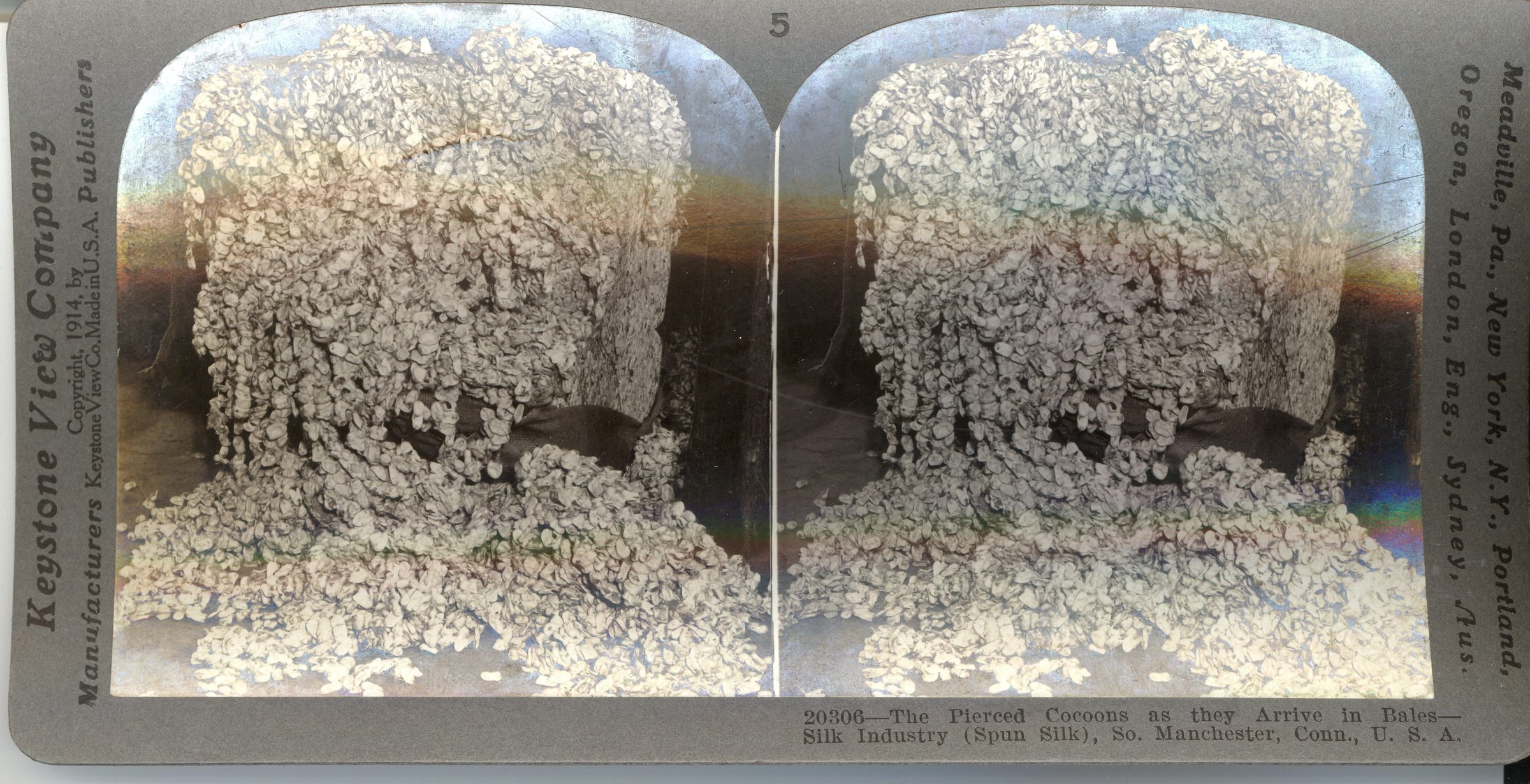 Stereograph of pierced cocoons as they arrive in bales (spun silk) at Cheney Brothers silk mills in South Manchester, CT 1914. Pierced cocoons are those from which the silk worm has emerged as a moth. Black and white print on cardboard. Card is warped. Unknown photographer. Studio: Keystone View Company, Meadville, PA. Serial #20306Photograph Details