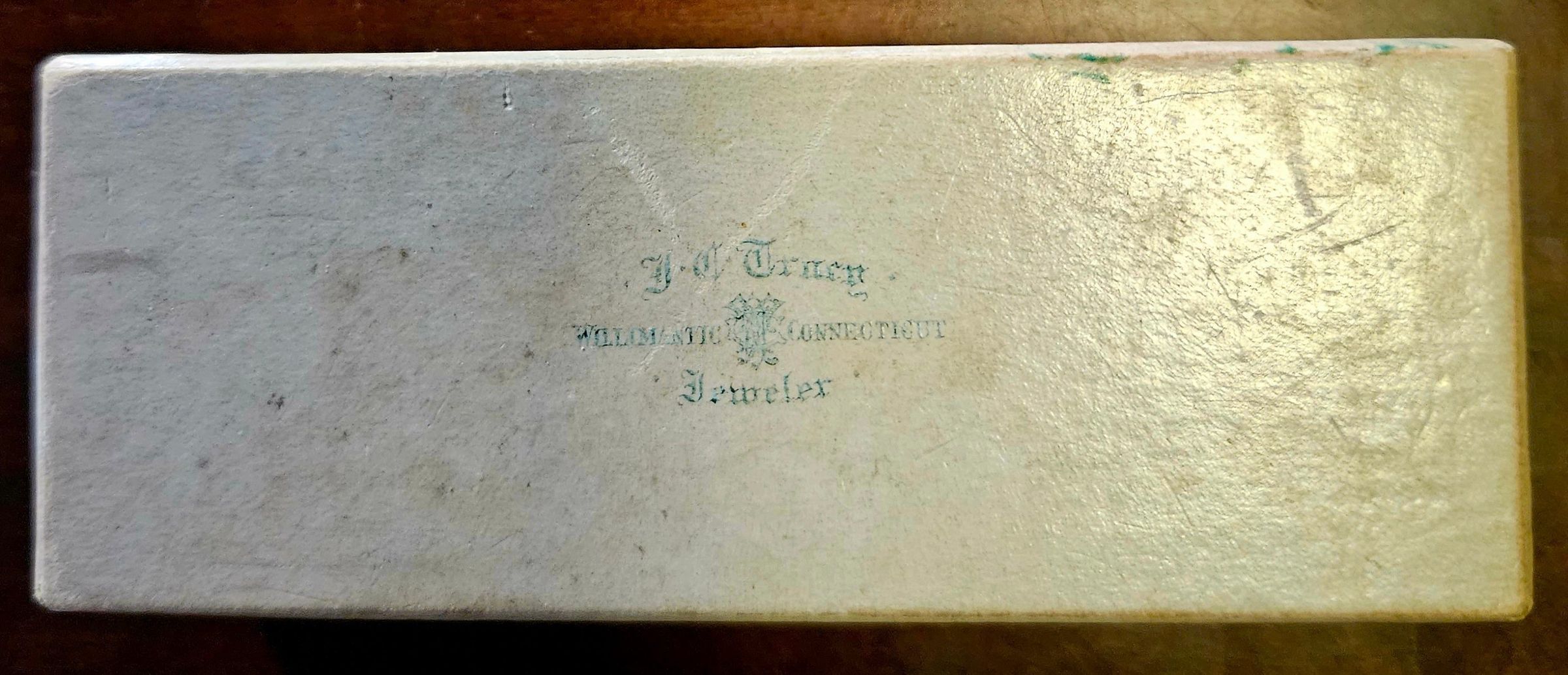 According to the 1912 Willimantic Directory, John C. Tracy was a jeweler and optician with a store or office at 688 Main Street in Willimantic, CT -- on the south side of the street, roughly across from Church Street, a building demolished in the 1970s as part of urban renewal. Tracy's residence was at 125 Summit Street. Tracy had a large advertisement on the cover of the 1912 directory. Although the cover is worn, it can be made out as advertising diamonds, watches, and silverware; French and American clocks.Collection