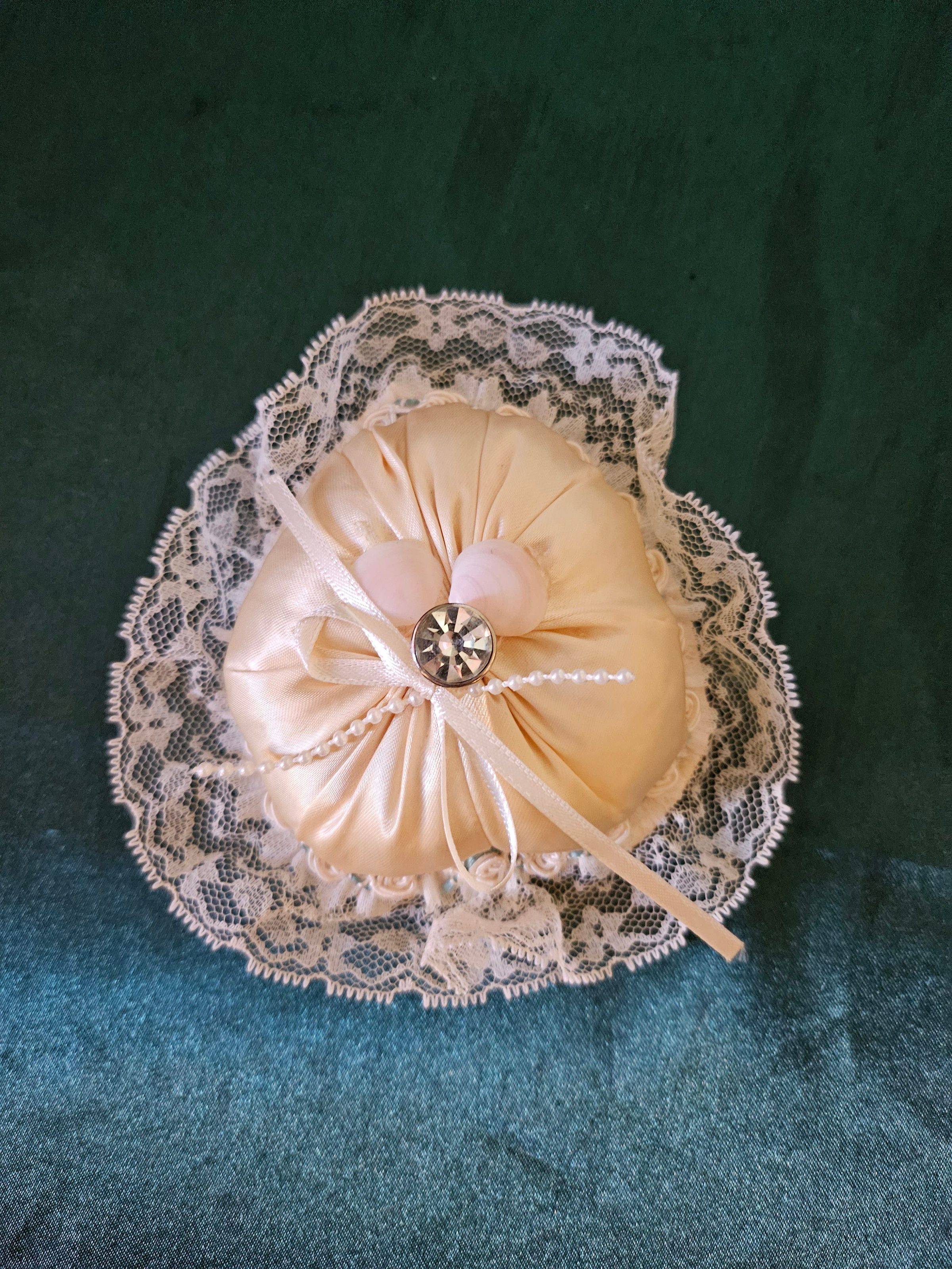 Pin cushion, in the shape of a heart. Peach-colored satin covering. Lace border.Use