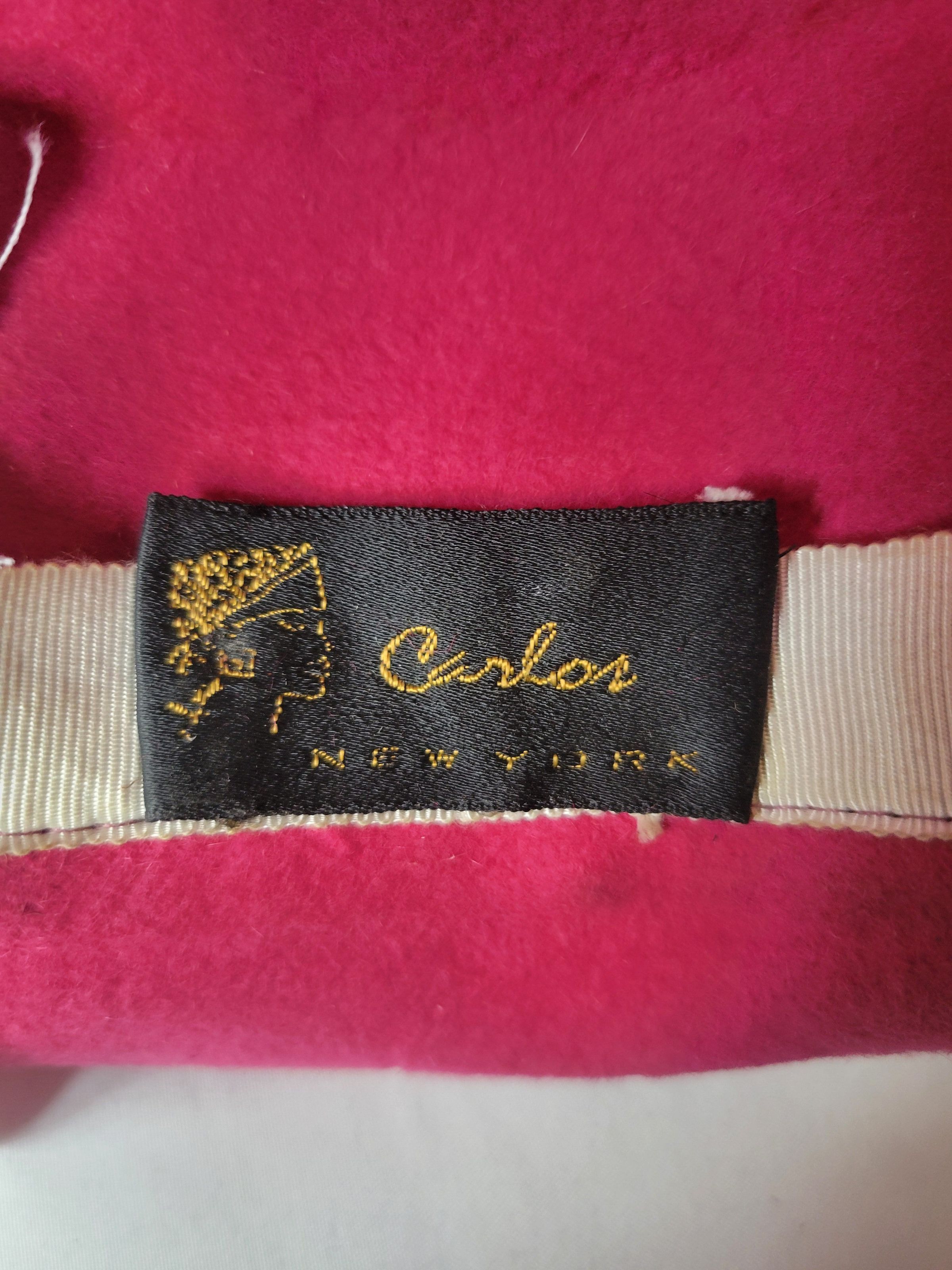 A pink felt hat, modeled after the men's homberg hat, with black woven trim.Collection