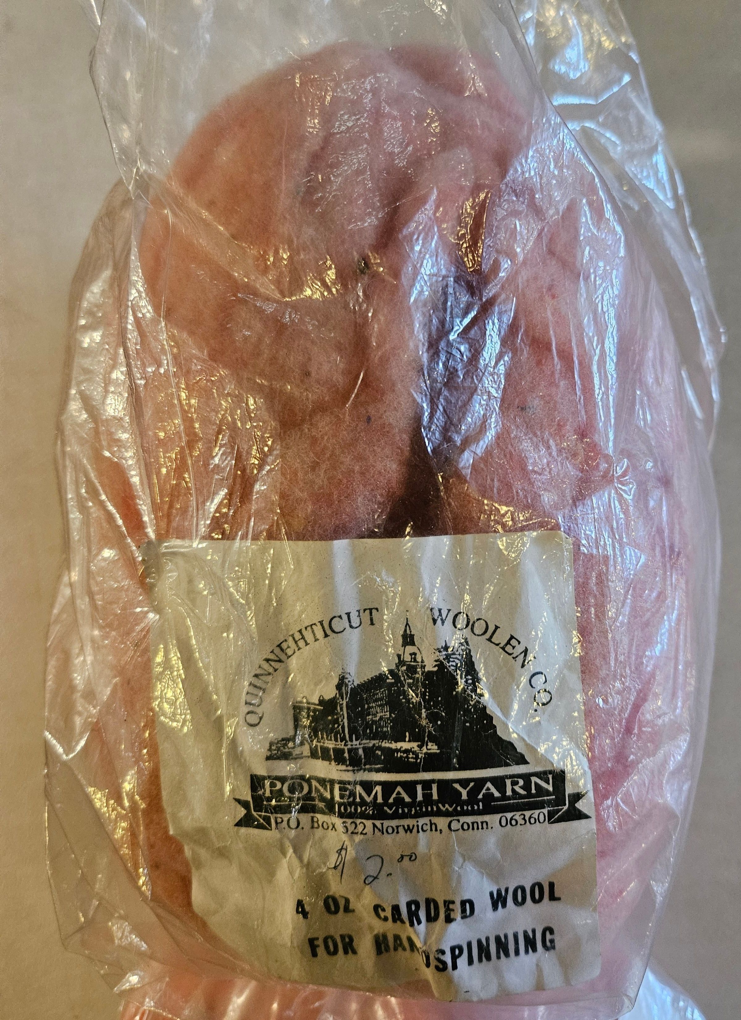 The image shows a clear plastic bag containing wool labeled as "PONEMAH YARN" from the Quinnehticut Woolen Co., displayed prominently along with "100%," suggesting its pure wool content. The packaging is transparent, allowing the wool's hue to be slightly visible, although the focus is primarily on the label's information. The mail address provided is P.O. Box 522, Norwich, Conn. 06360, indicating the location of the yarn provider. The contents weigh four ounces and are specifically noted as being carded wool intended for hand spinning, giving insight into its purpose for crafting or textile work. The bag is slightly crinkled, adding a touch of texture to the image. Set against a plain background, the focus stays firmly on the product itself.