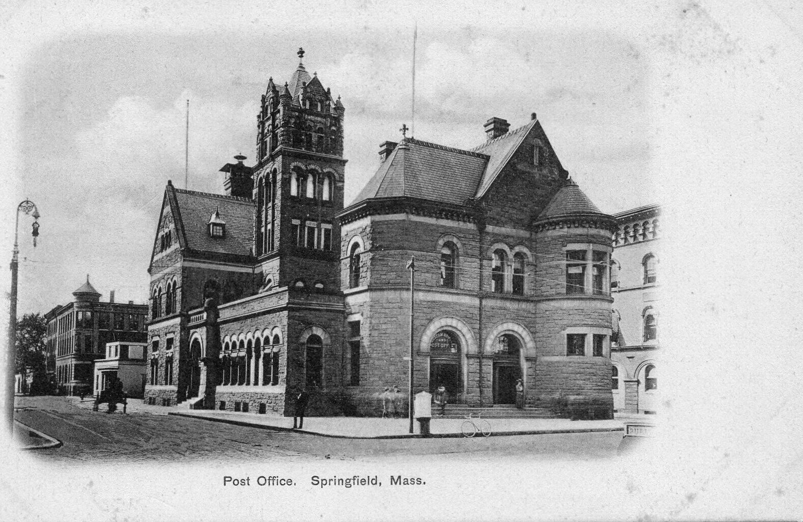 A black and white postcard of the post office in Springfield, Mass.Condition