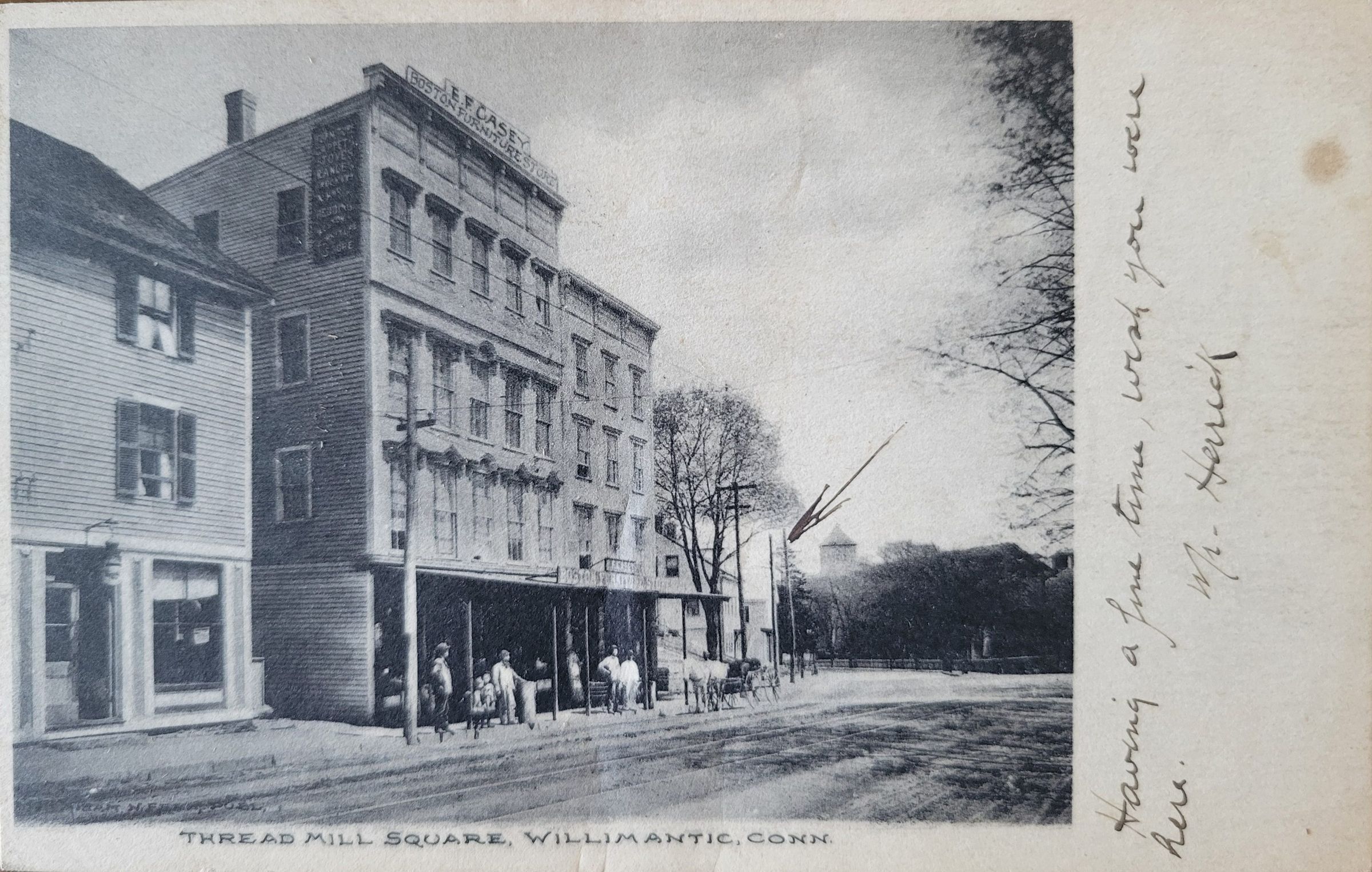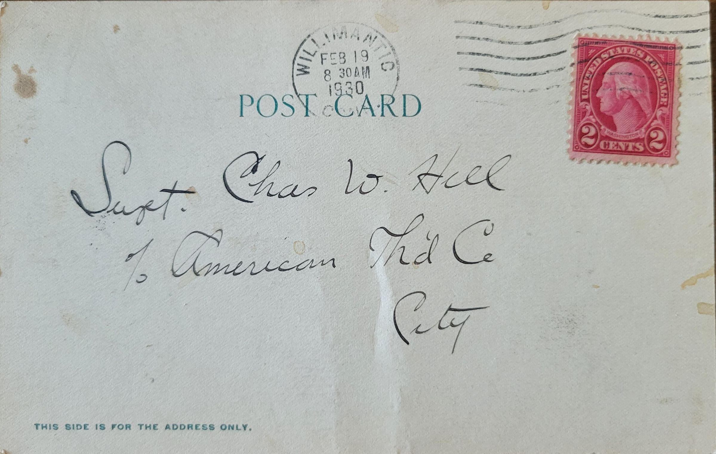 A postcard showing "Thread Mill Square, Willimantic, Conn" with a hand written message. The address side of the card features a red two cent stamp and a Willimantic postmark from February 19, 1930, 8:30am. It is addressed to Supt. Chas W. Hill care of the American Thread Company.Subject Place