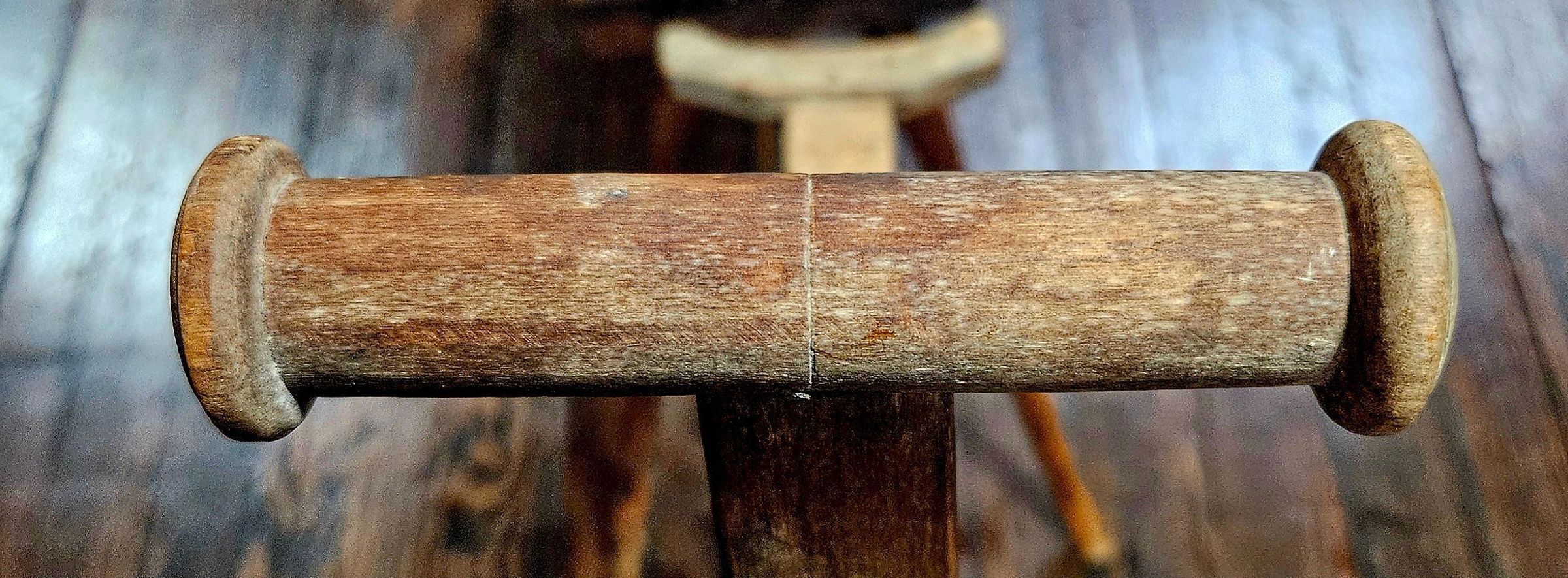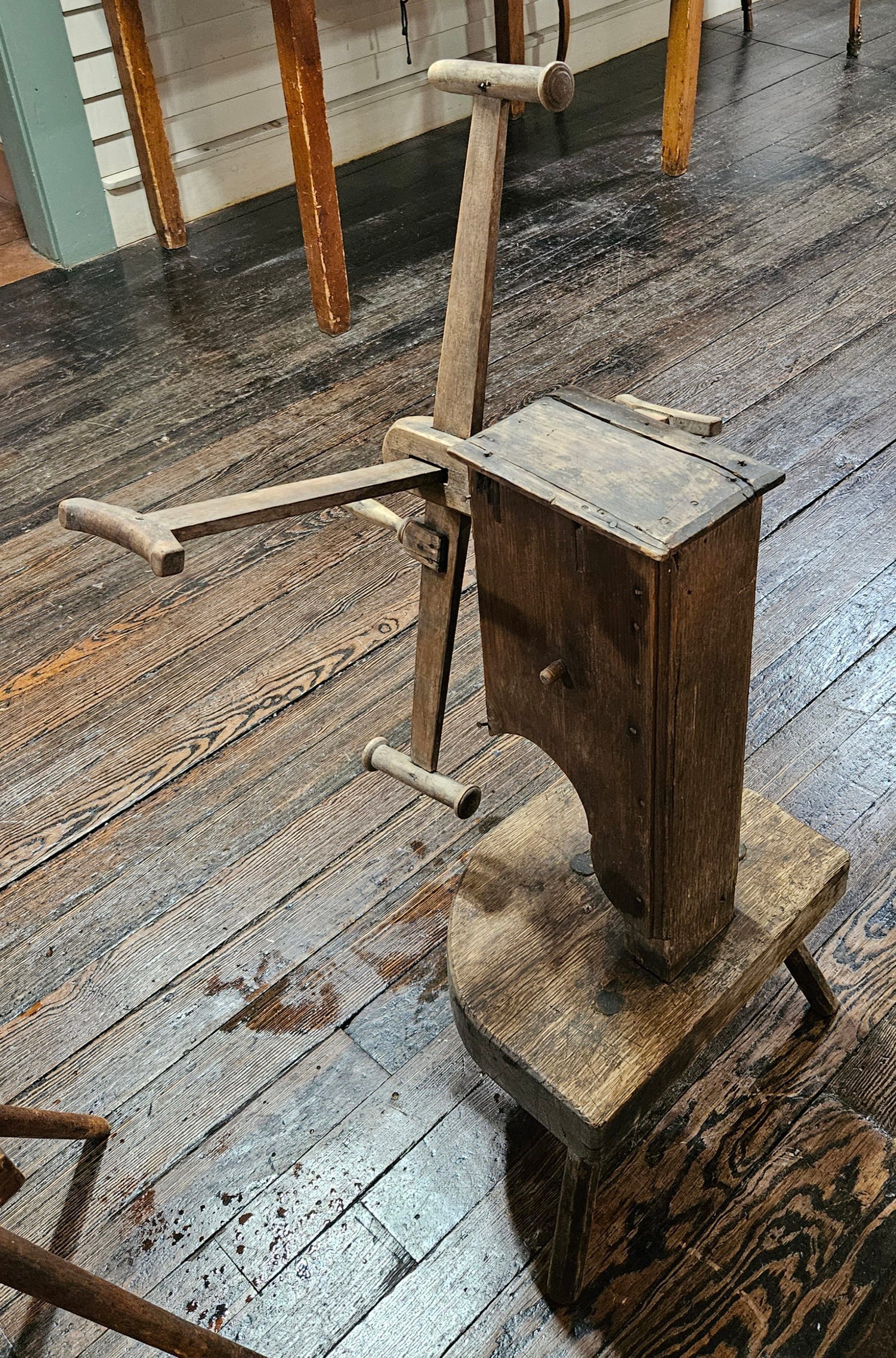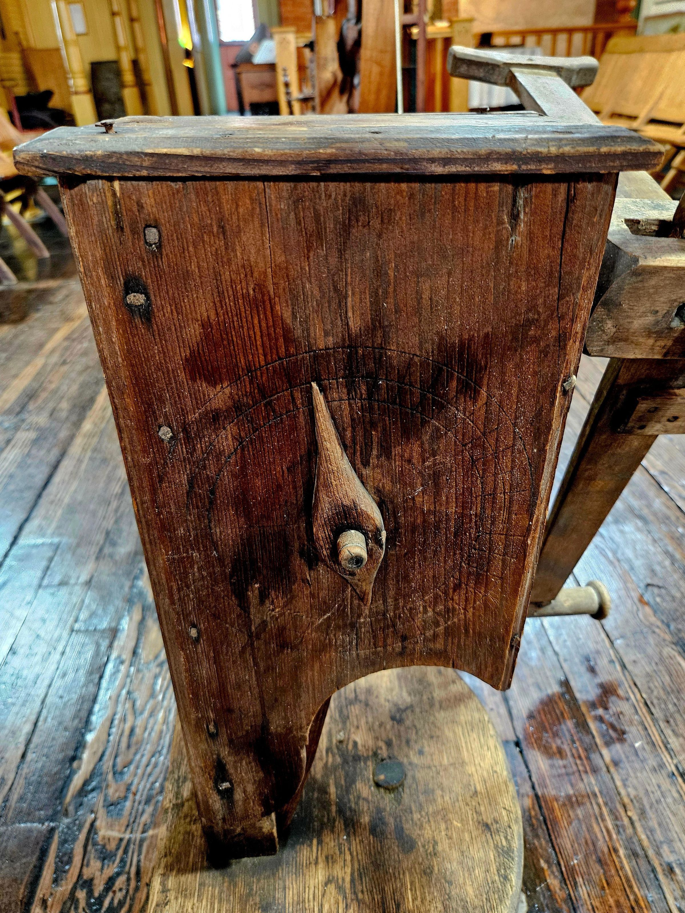 Preindustrial click reel yarn skein winder. Late 1700s. Internal gearing turns a "pointer" hand on the side of the gear box that counts the number of revolutions, thus keeping track of the number of yards of yarn wound. Once around the reel is two yards. Constructed of hardwood and iron nails. More modern nails on the top of the gear box (along with damage to the gear box lid) indicate that the lid had been removed at some time in the past, most likely to repair or clean the gearing.Use