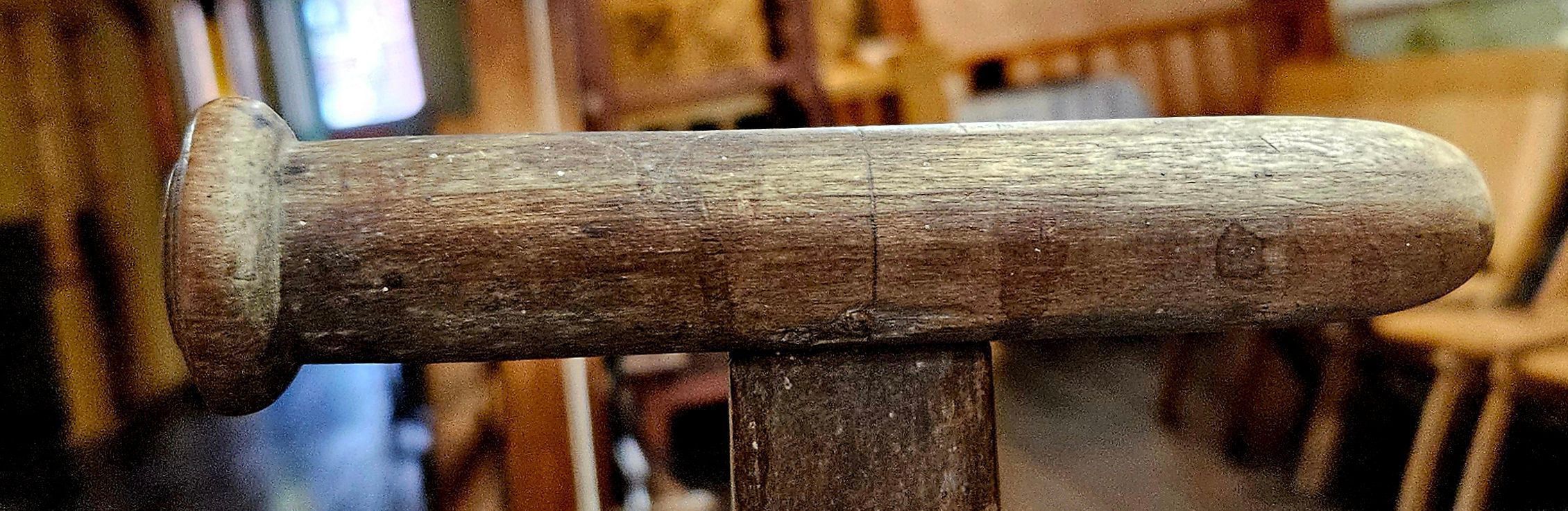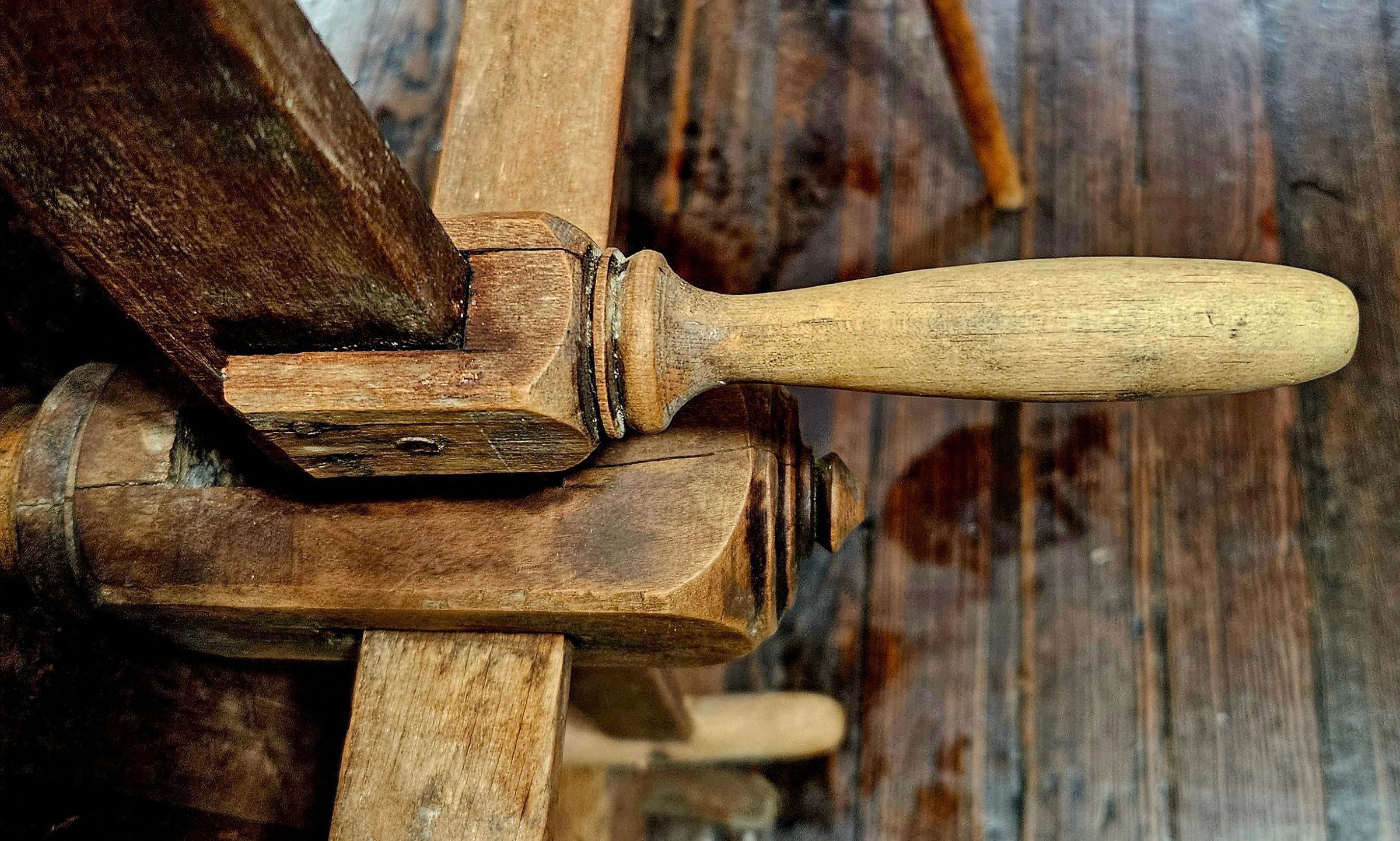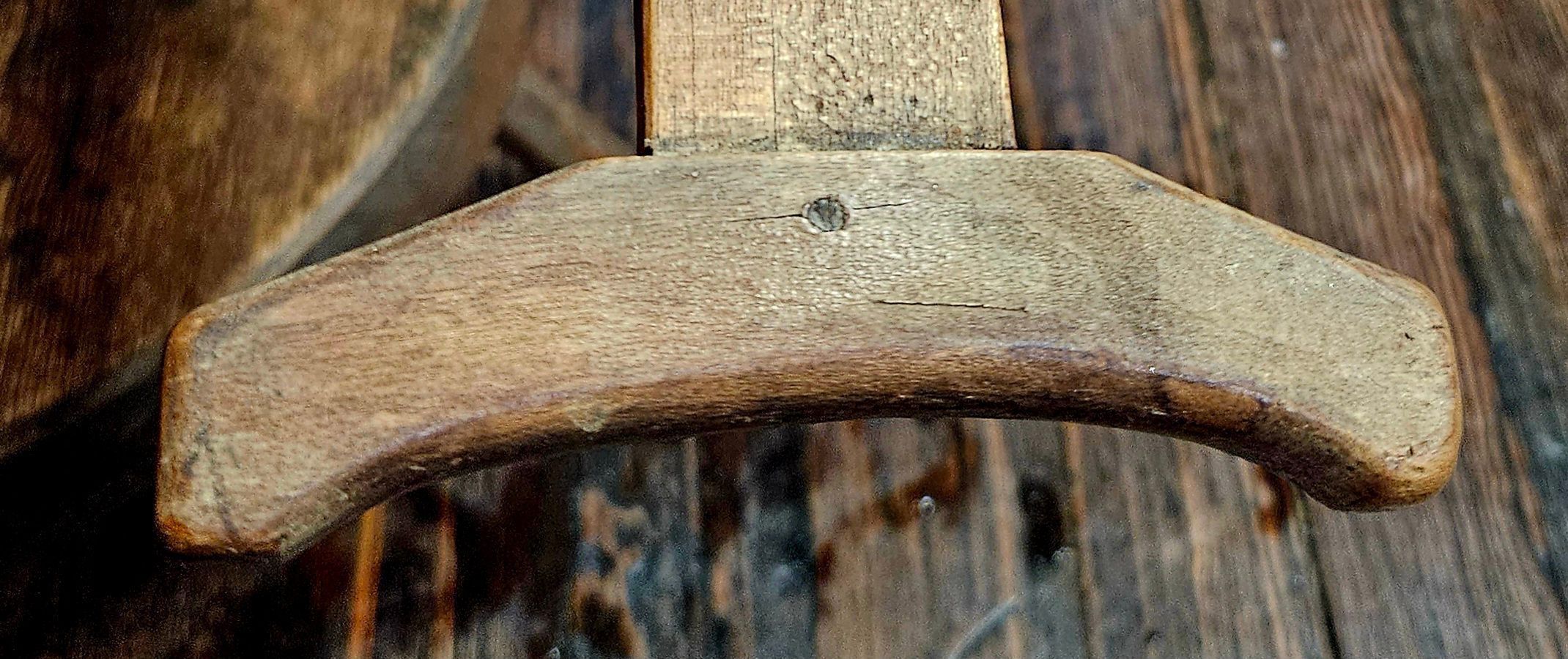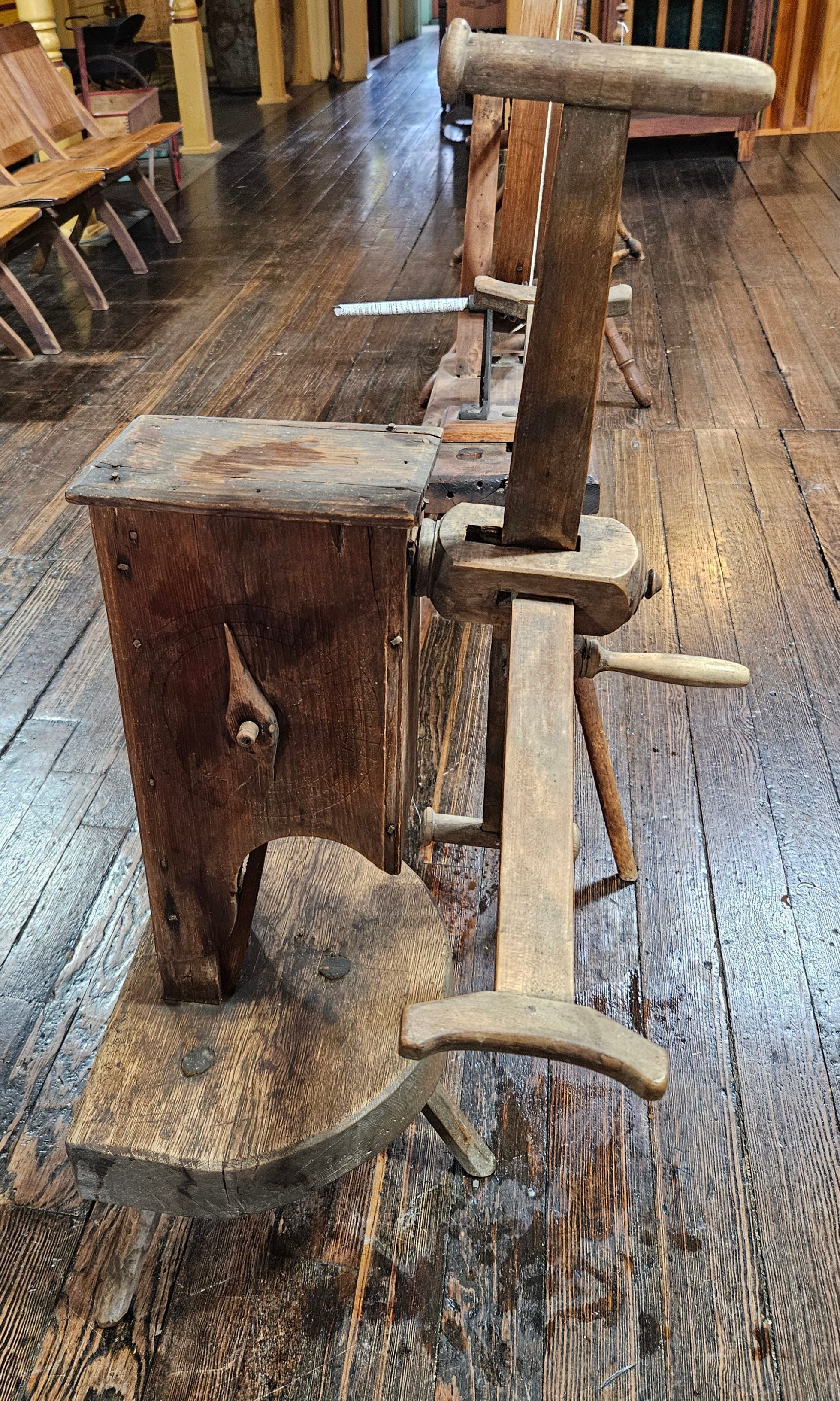 Preindustrial click reel yarn skein winder. Late 1700s. Internal gearing turns a "pointer" hand on the side of the gear box that counts the number of revolutions, thus keeping track of the number of yards of yarn wound. Once around the reel is two yards. Constructed of hardwood and iron nails. More modern nails on the top of the gear box (along with damage to the gear box lid) indicate that the lid had been removed at some time in the past, most likely to repair or clean the gearing.Use