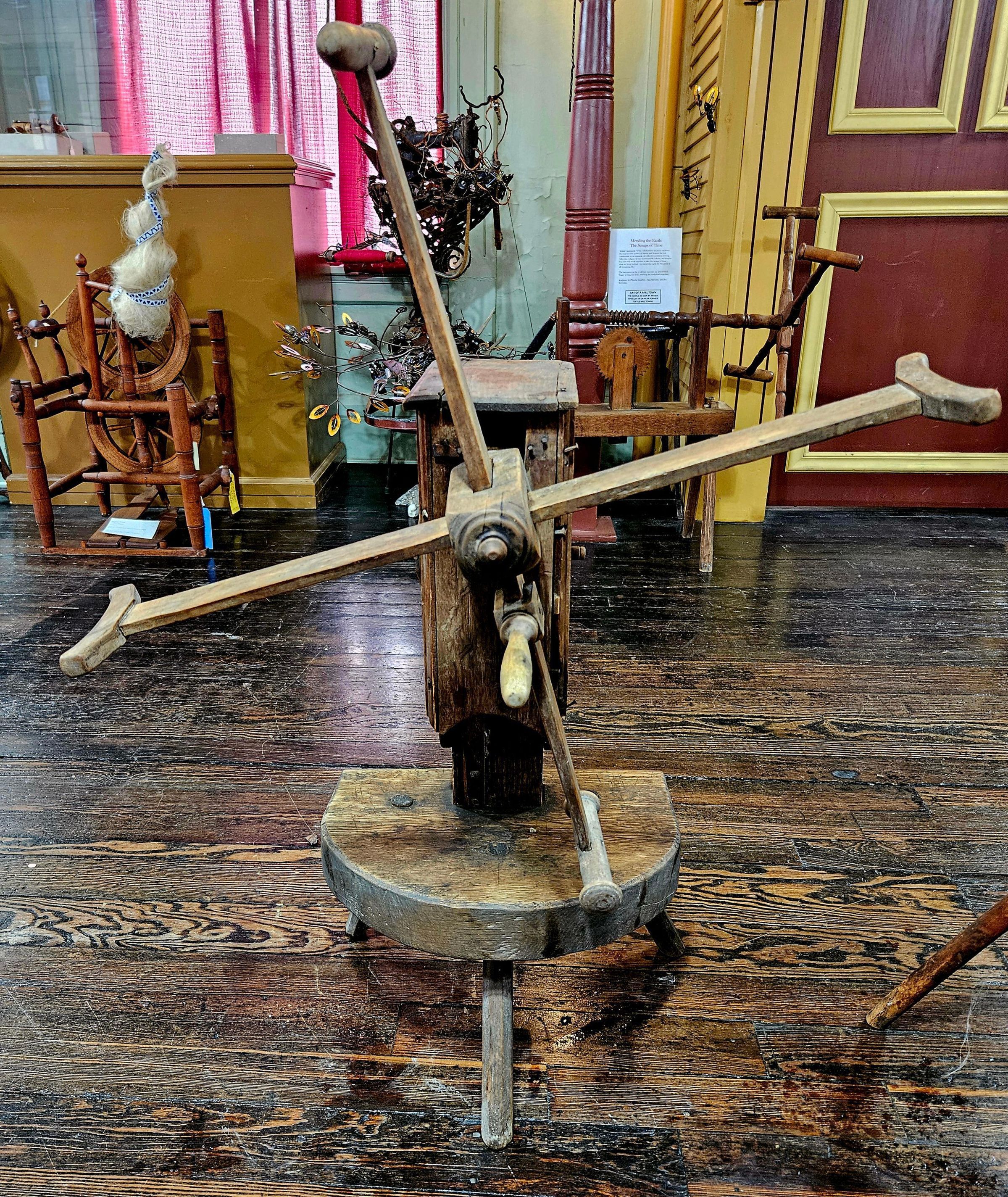 Before the Industrial Revolution, spinners wound spun yarn onto devices designed to measure it into skeins. There were several types of winders: niddy noddies, swifts, and reels. This winder is a click reel. According to Wikipedia: "A spinner's weasel or clock [or click] reel is a mechanical yarn-measuring device consisting of a spoked wheel with gears attached to a pointer on a marked face (which resembles a clock) and an internal mechanism that makes a "pop" [or "click"] sound after the desired length of yarn is measured (usually a skein). The pointer allows the spinner to see how close they are to reaching a skein. The weasel's gear ratio is typically 40 to 1, and the circumference of the reel is usually two yards, thus producing an 80-yard skein when the weasel pops (after 40 revolutions)." [The device is the origin of the nursery rhyme, "Pop Goes the Weasel."] https://en.wikipedia.org/wiki/Spinner%27s_weasel.Collection