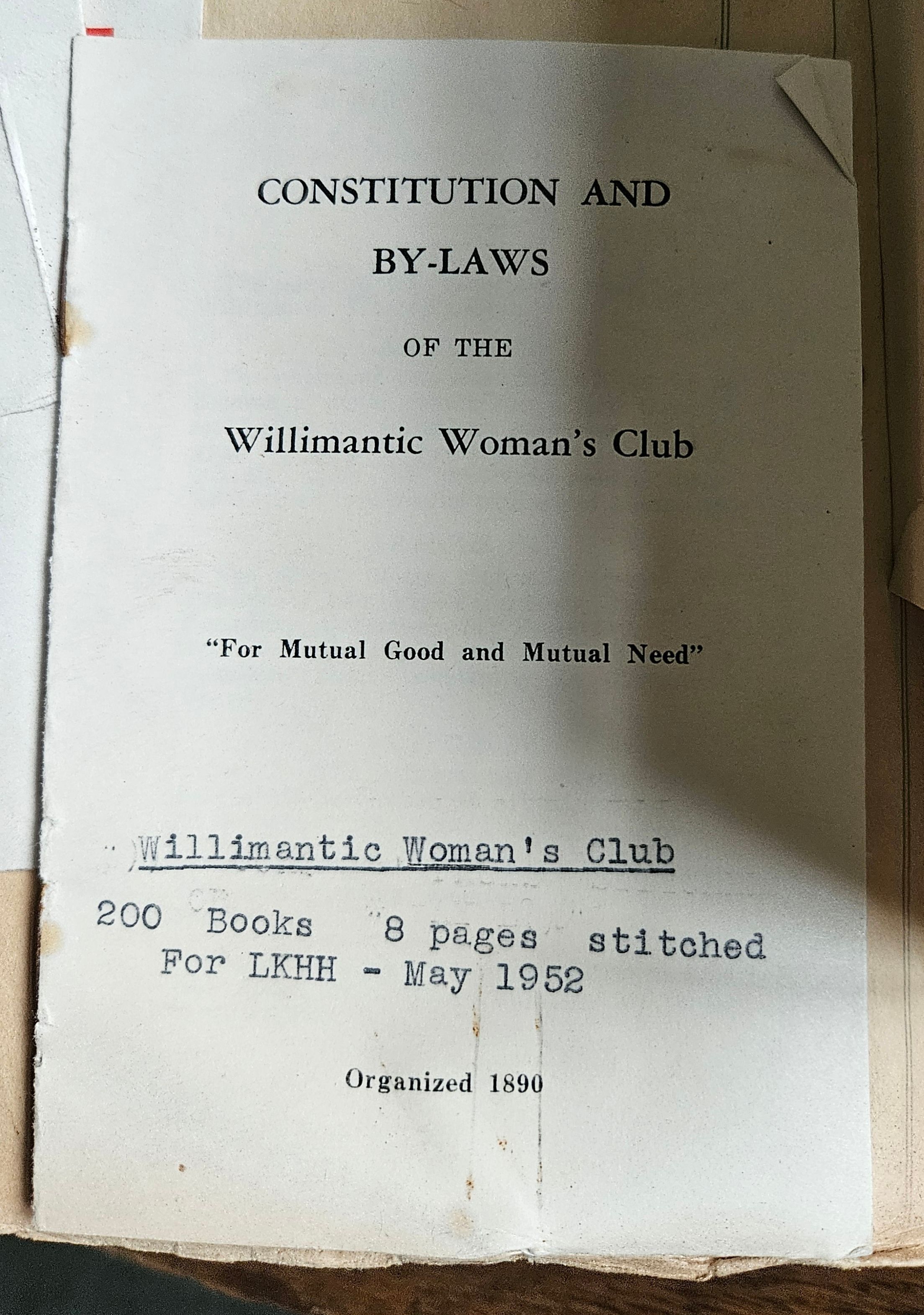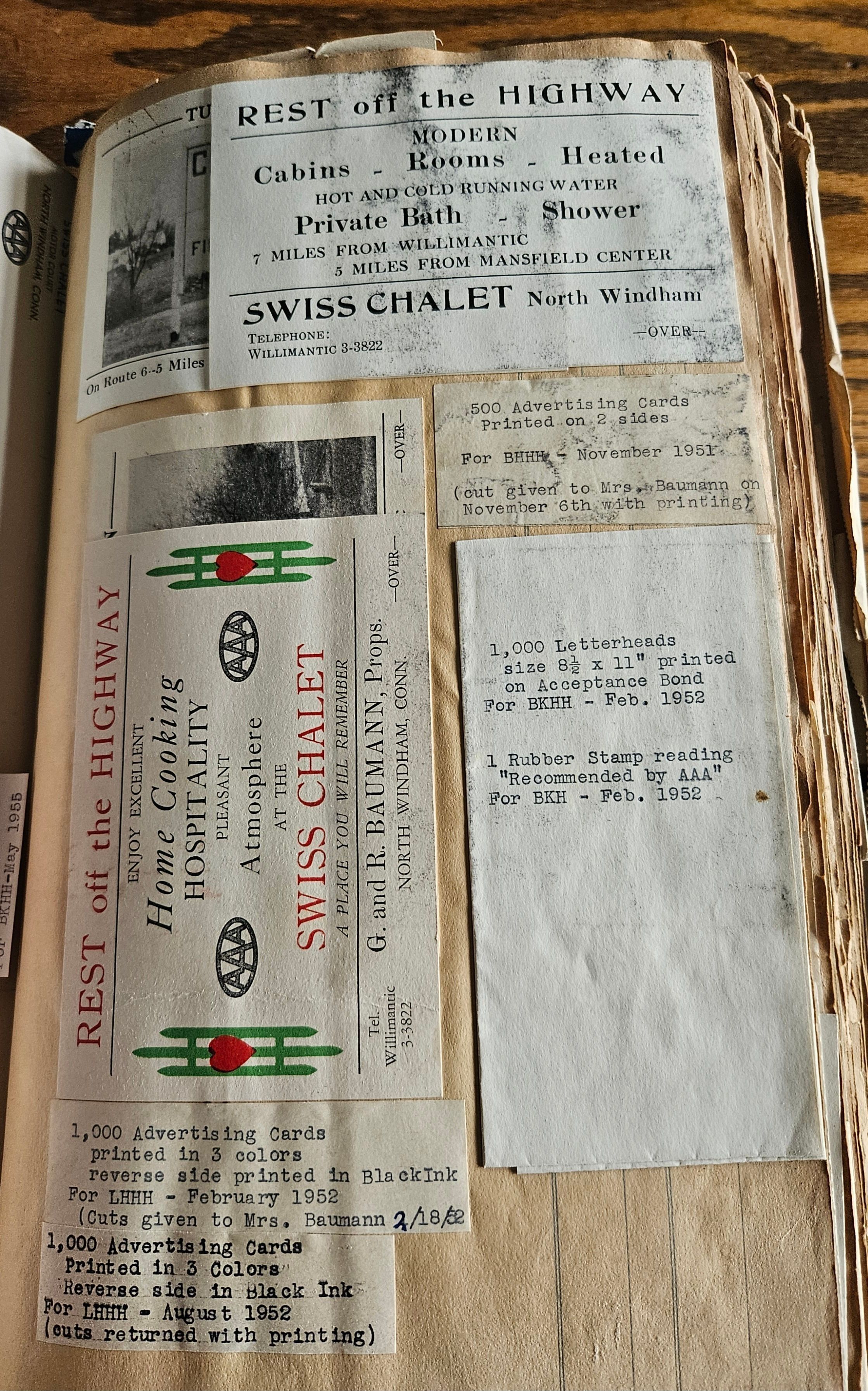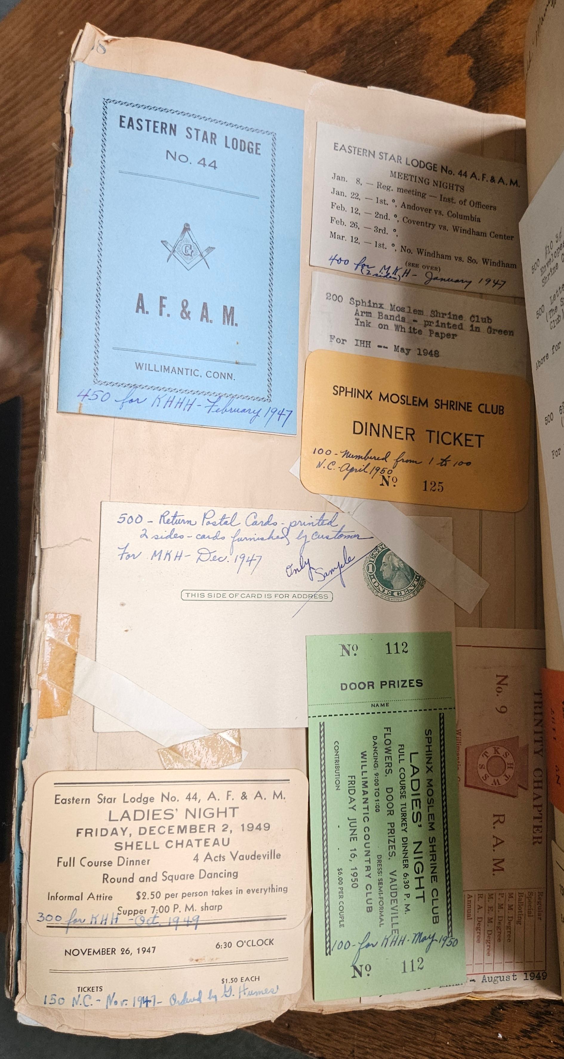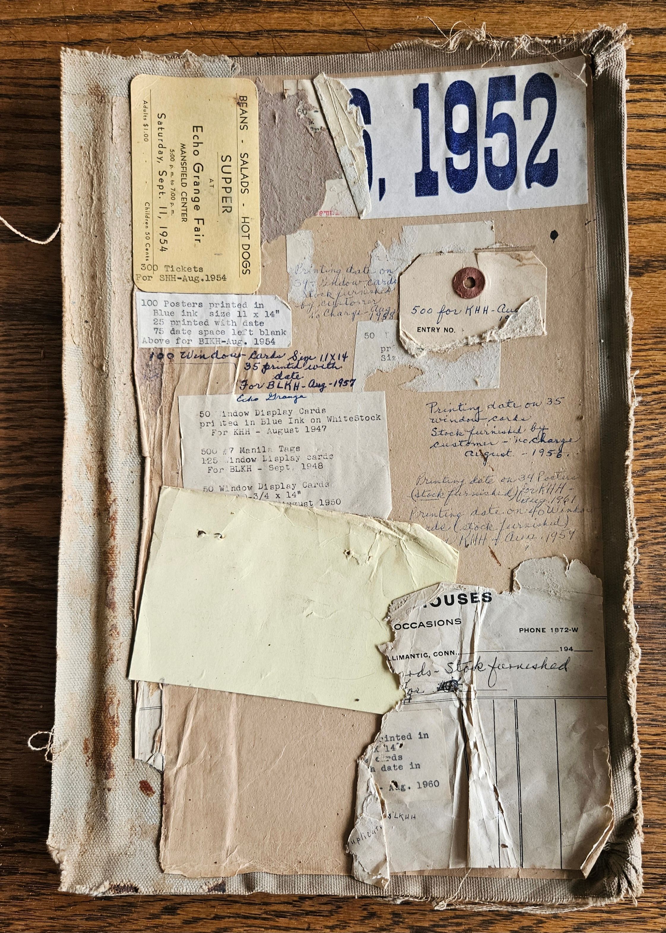 A cloth-bound ledger or record book with blank, ruled pages, containing pasted-in printer's proofs for customers in the greater Willimantic, CT area. Also contains a hand-written index. The cloth cover is faded green with black design work. Customers include a wide variety of local businesses, churches, clubs, political groups, etc. Entries are date from c. 1940 to c. 1965. The name of the printer is not noted, but is hypothesized to be the Hall and Bill Company, Willimantic largest printer during that period. The company opened in the late 1800s and closed in the early 1990s.Use