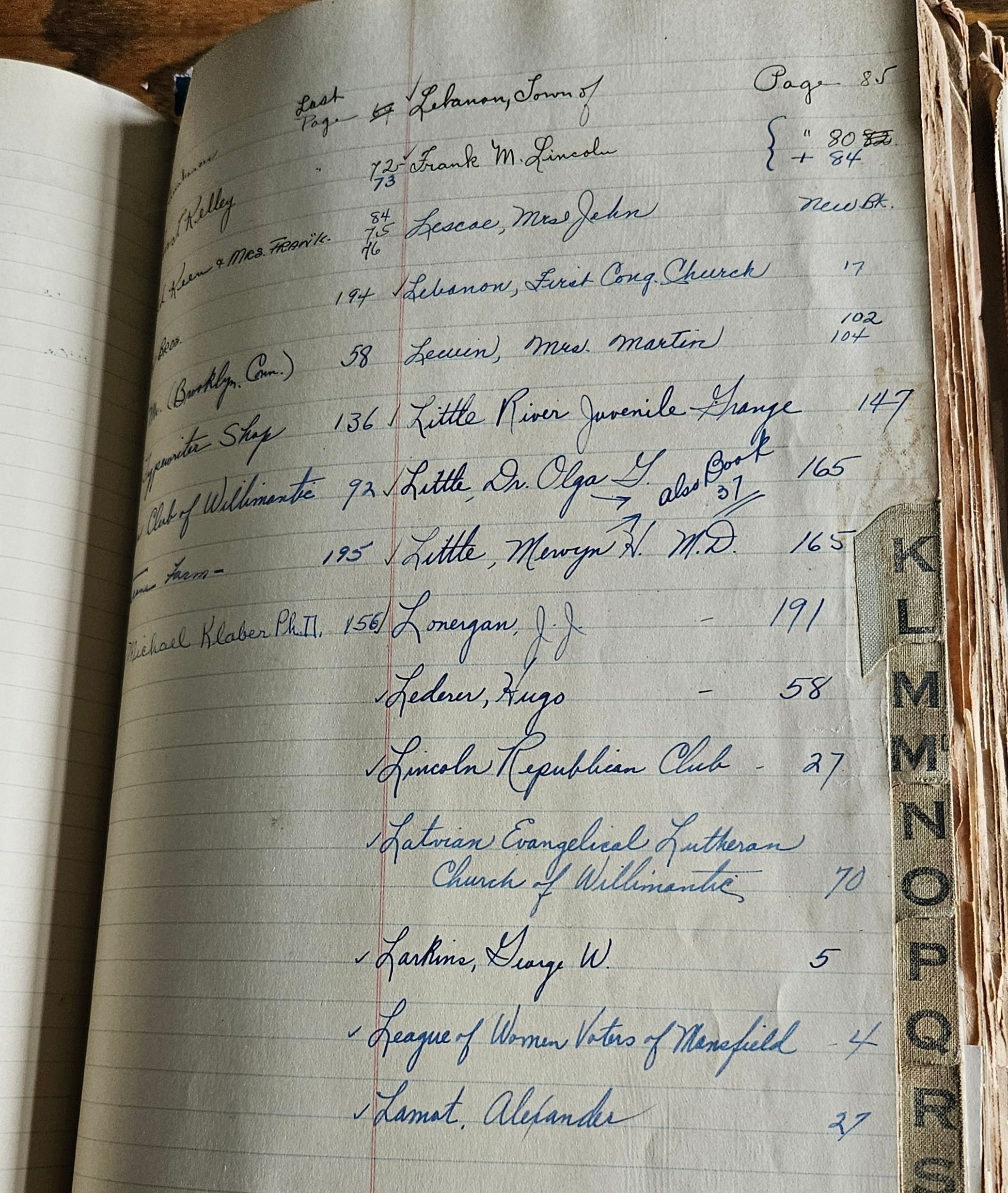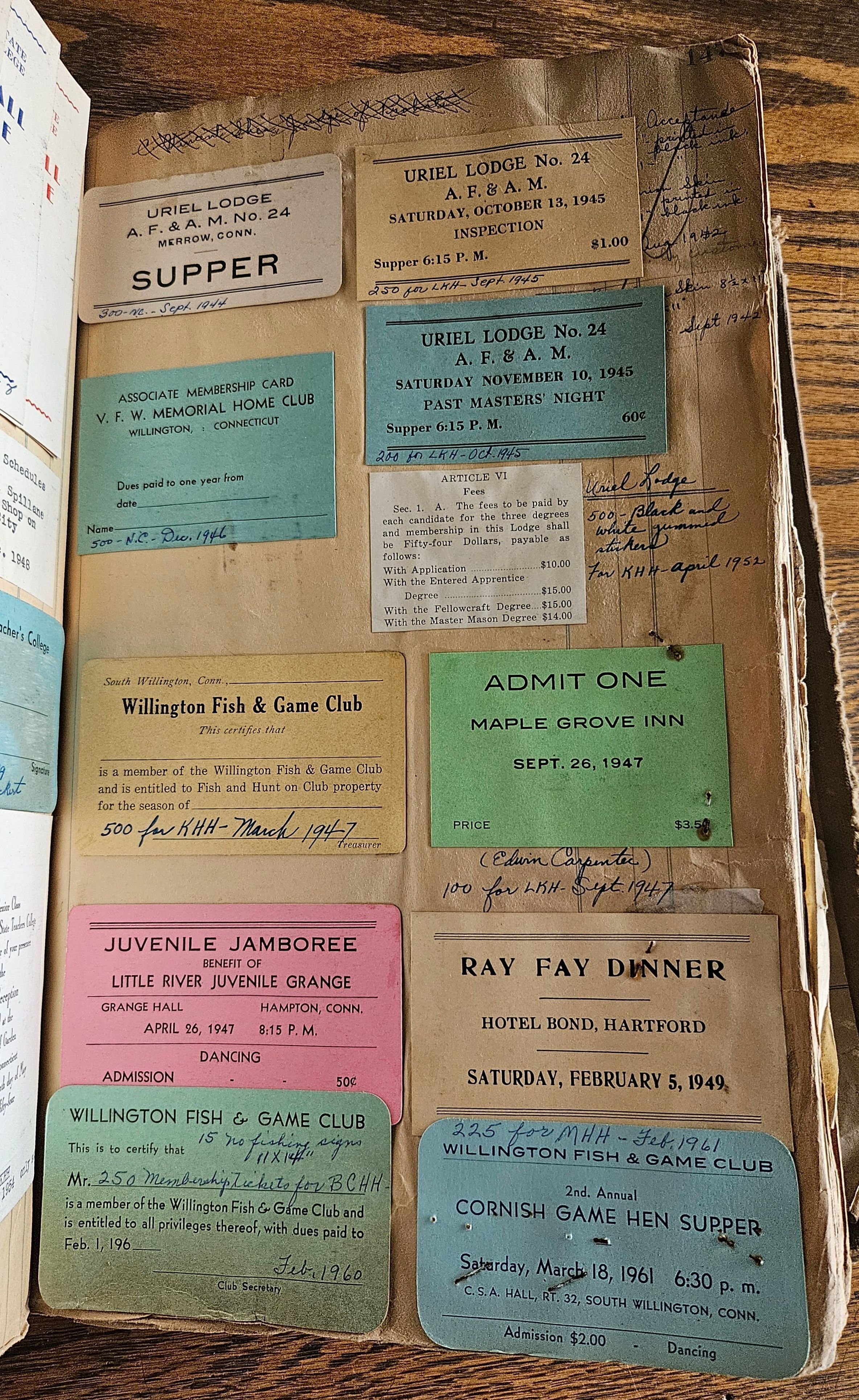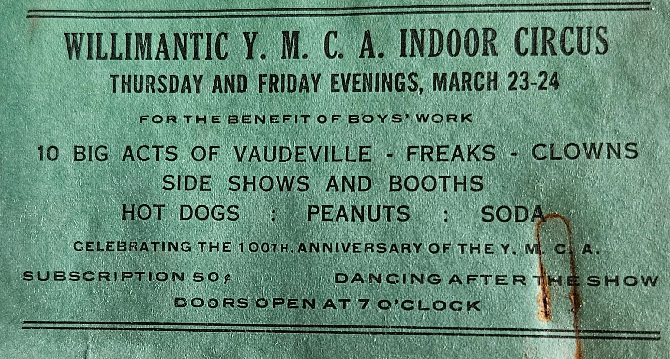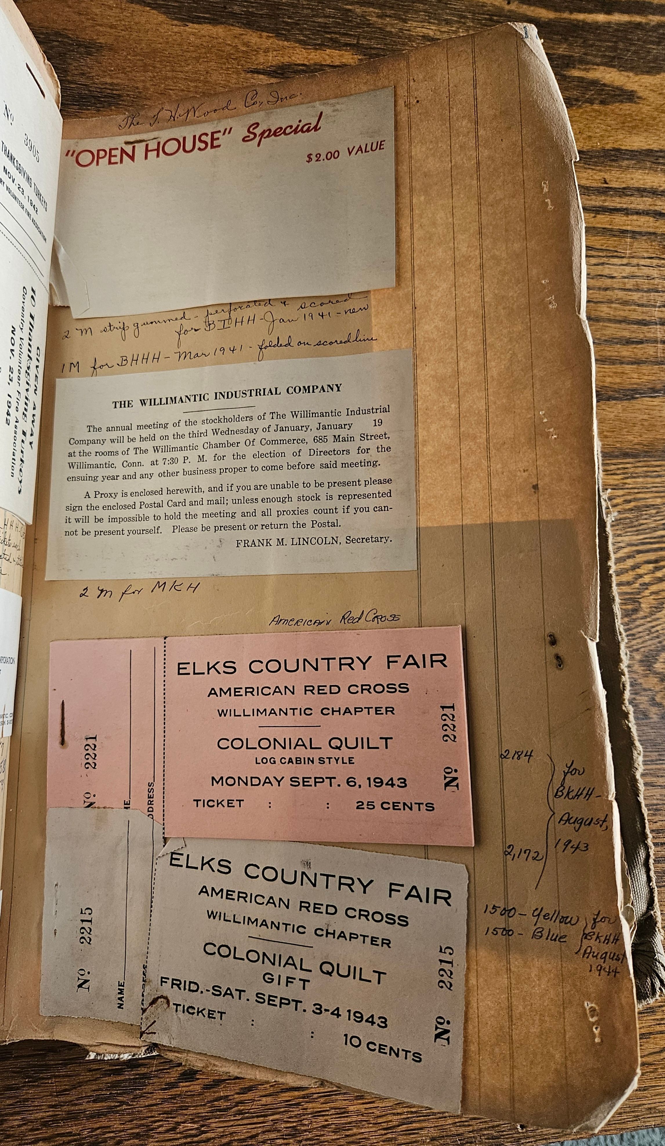 A cloth-bound ledger or record book with blank, ruled pages, containing pasted-in printer's proofs for customers in the greater Willimantic, CT area. Also contains a hand-written index. The cloth cover is faded green with black design work. Customers include a wide variety of local businesses, churches, clubs, political groups, etc. Entries are date from c. 1940 to c. 1965. The name of the printer is not noted, but is hypothesized to be the Hall and Bill Company, Willimantic largest printer during that period. The company opened in the late 1800s and closed in the early 1990s.Use