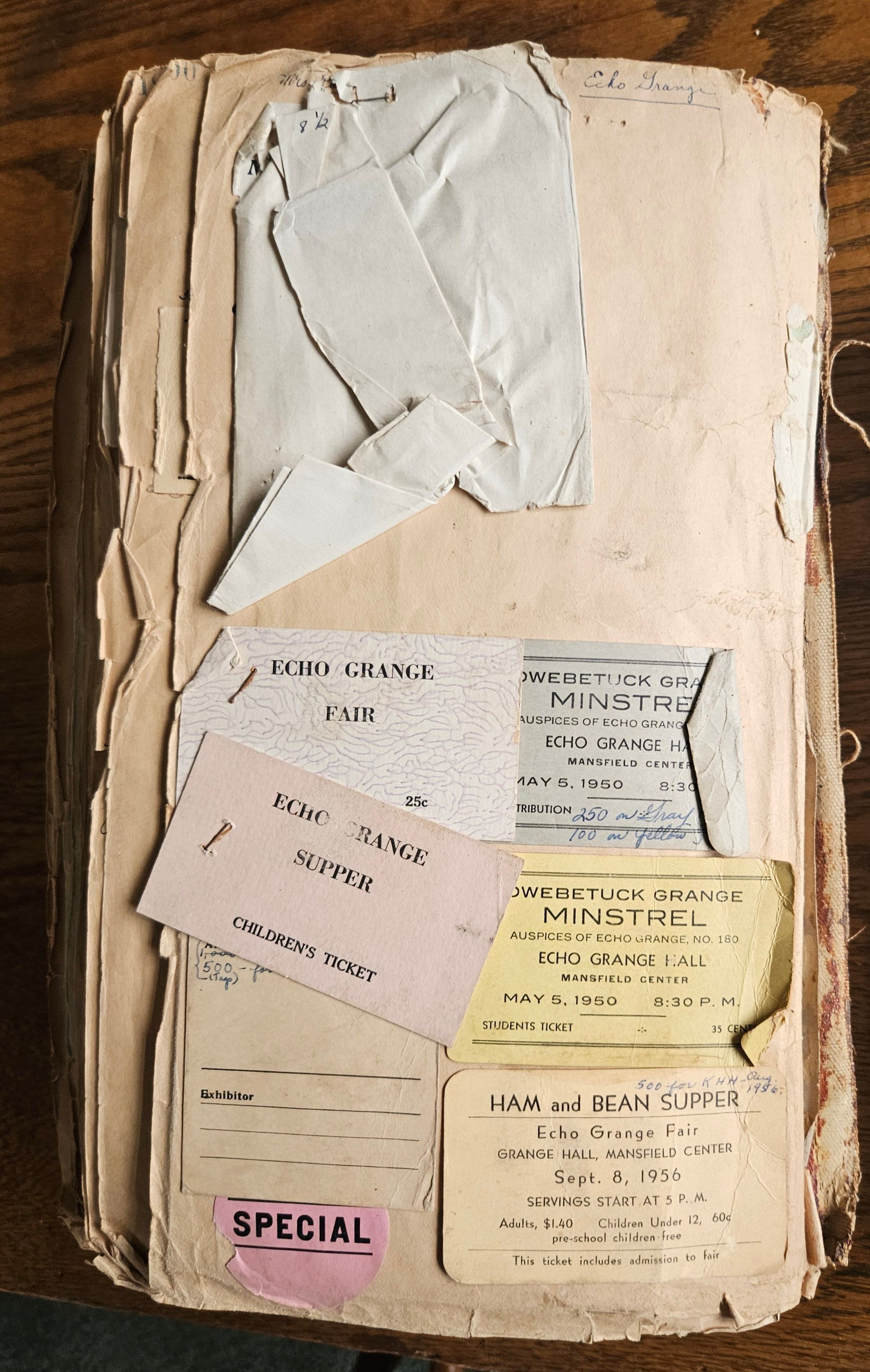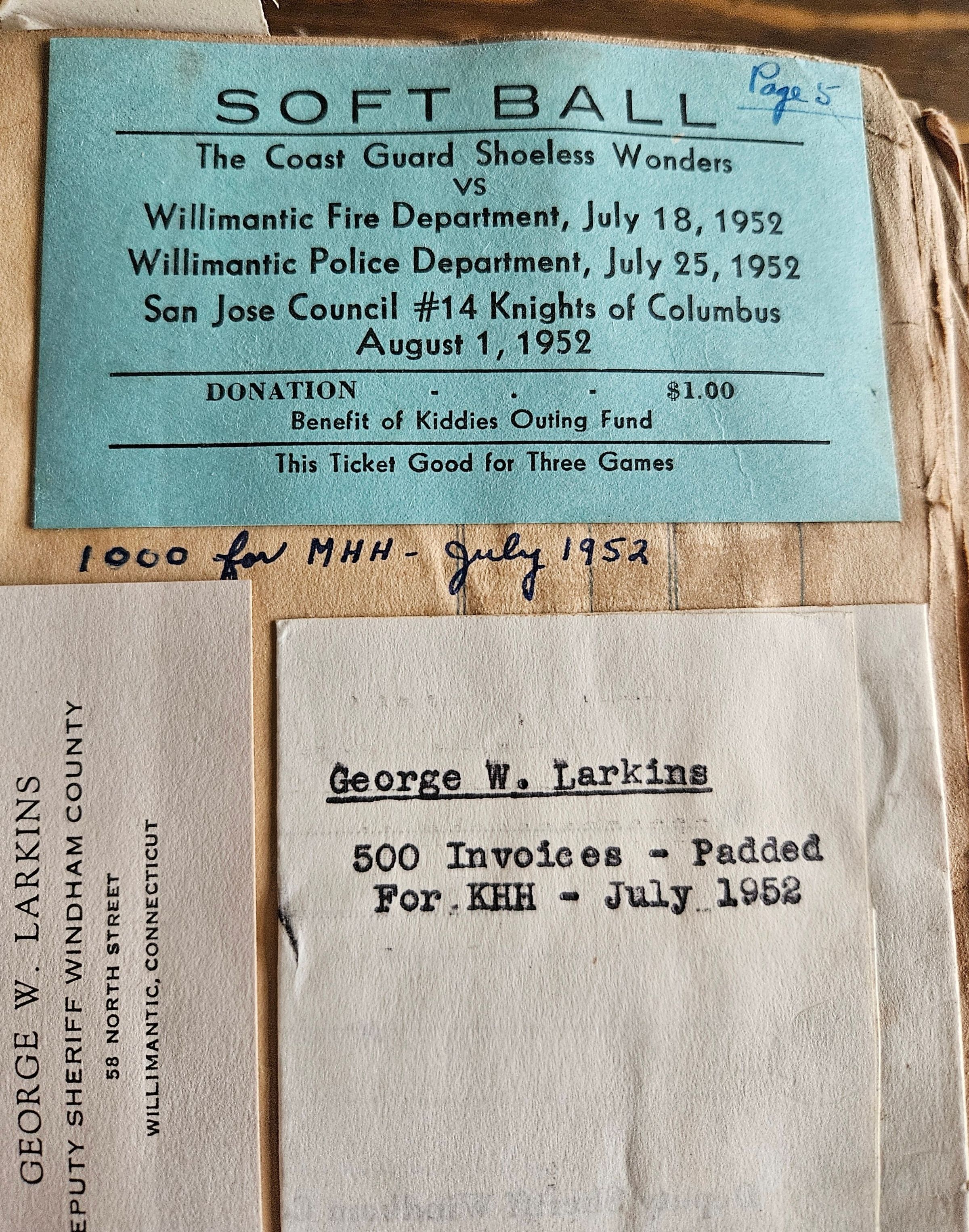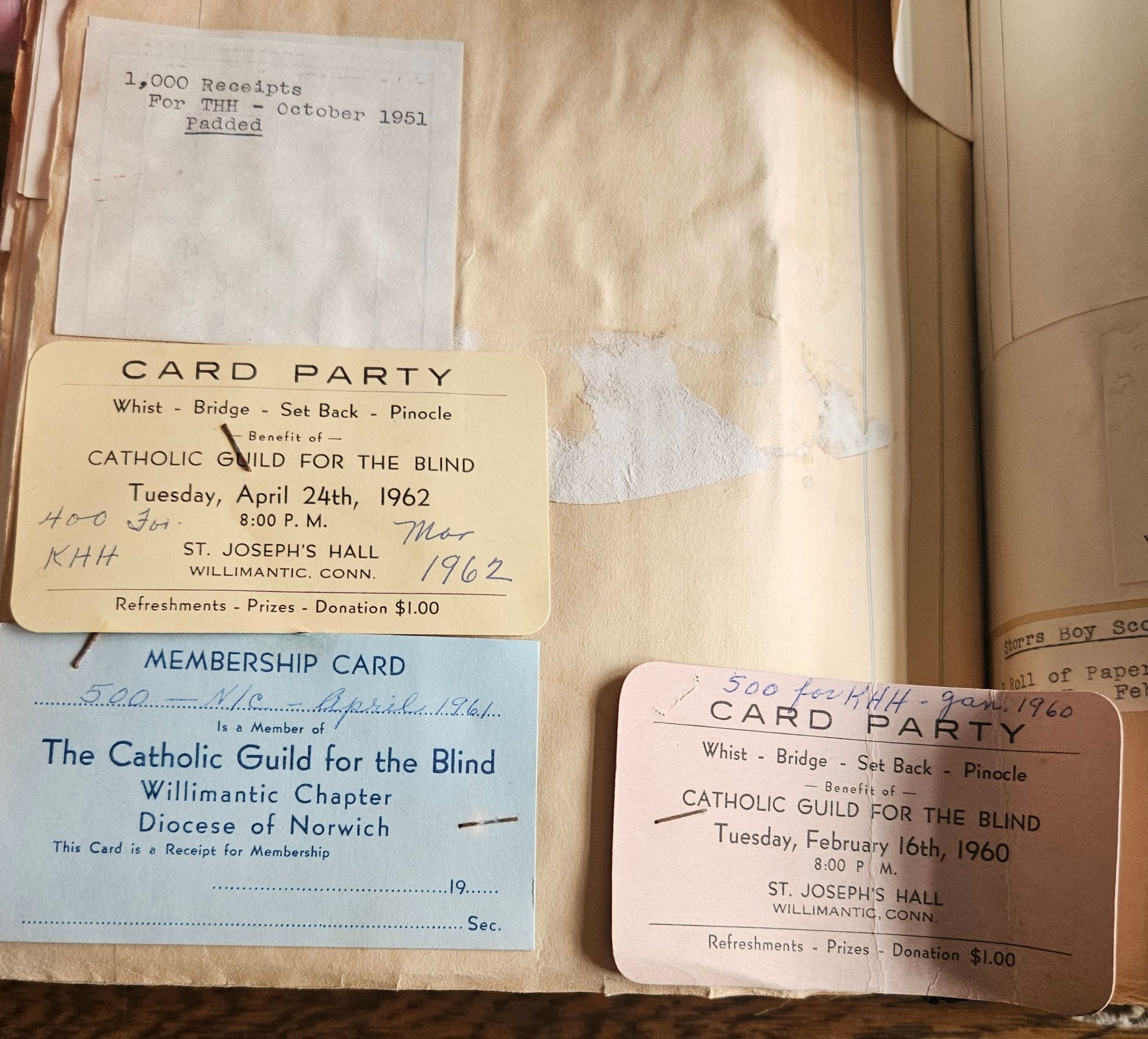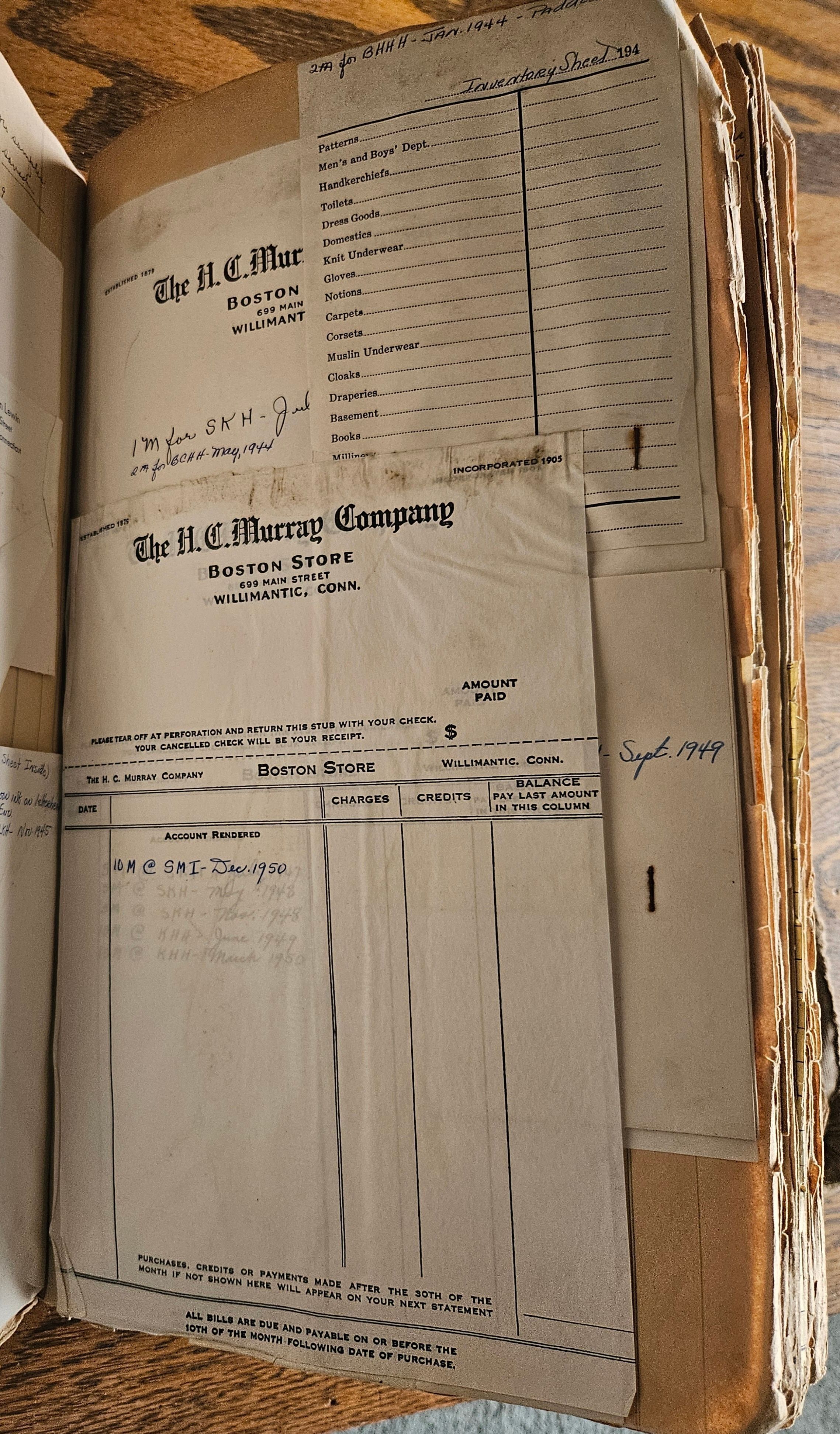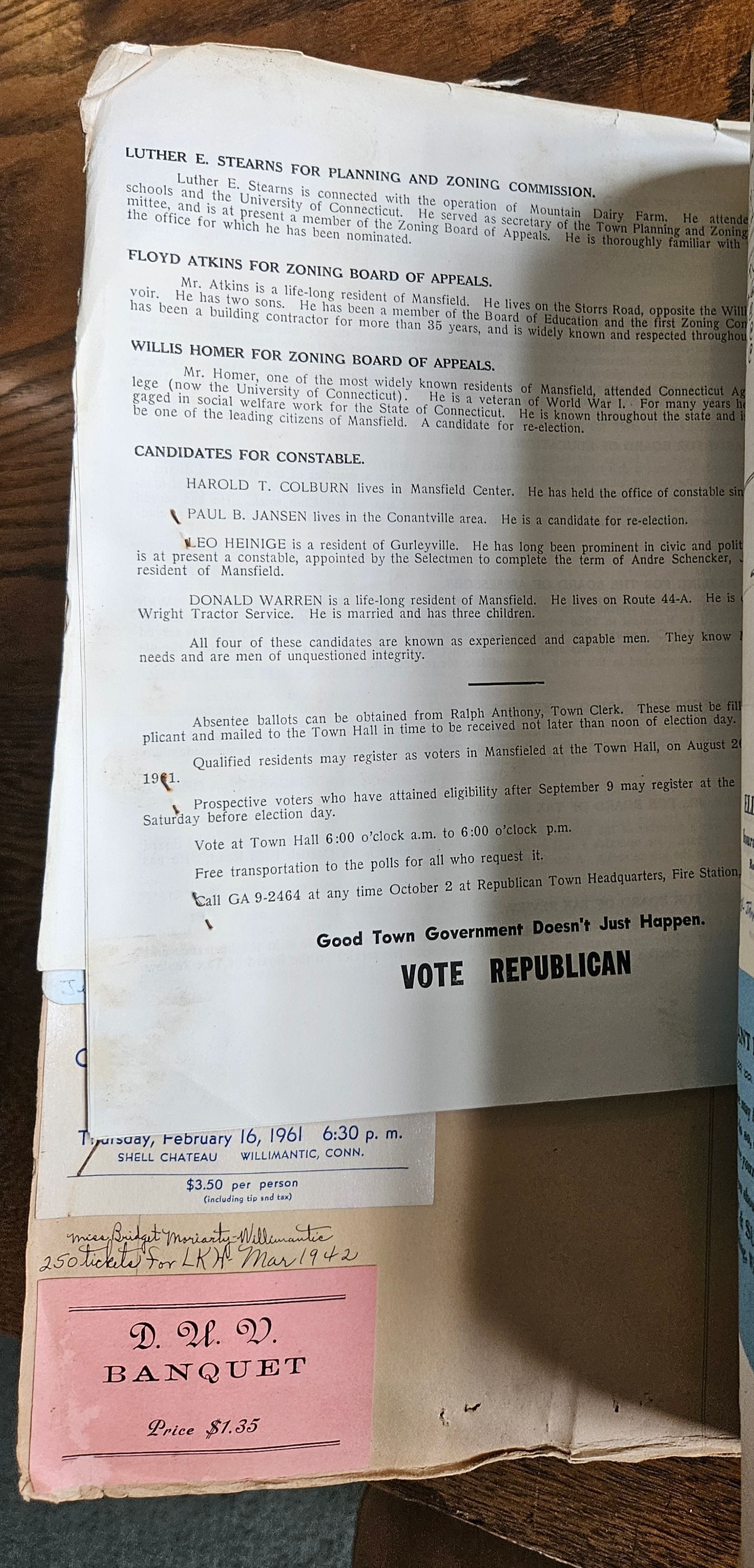 A cloth-bound ledger or record book with blank, ruled pages, containing pasted-in printer's proofs for customers in the greater Willimantic, CT area. Also contains a hand-written index. The cloth cover is faded green with black design work. Customers include a wide variety of local businesses, churches, clubs, political groups, etc. Entries are date from c. 1940 to c. 1965. The name of the printer is not noted, but is hypothesized to be the Hall and Bill Company, Willimantic largest printer during that period. The company opened in the late 1800s and closed in the early 1990s.Use