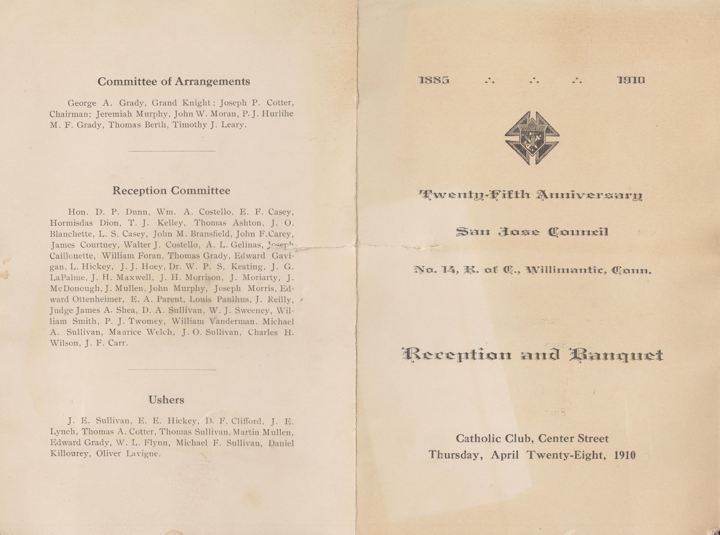 Program for the 25th anniversary reception and banquet of the San Jose Council, No. 15, Knights of Columbus, Willimantic. William Cornelius Smith was a member. 1910.Collection