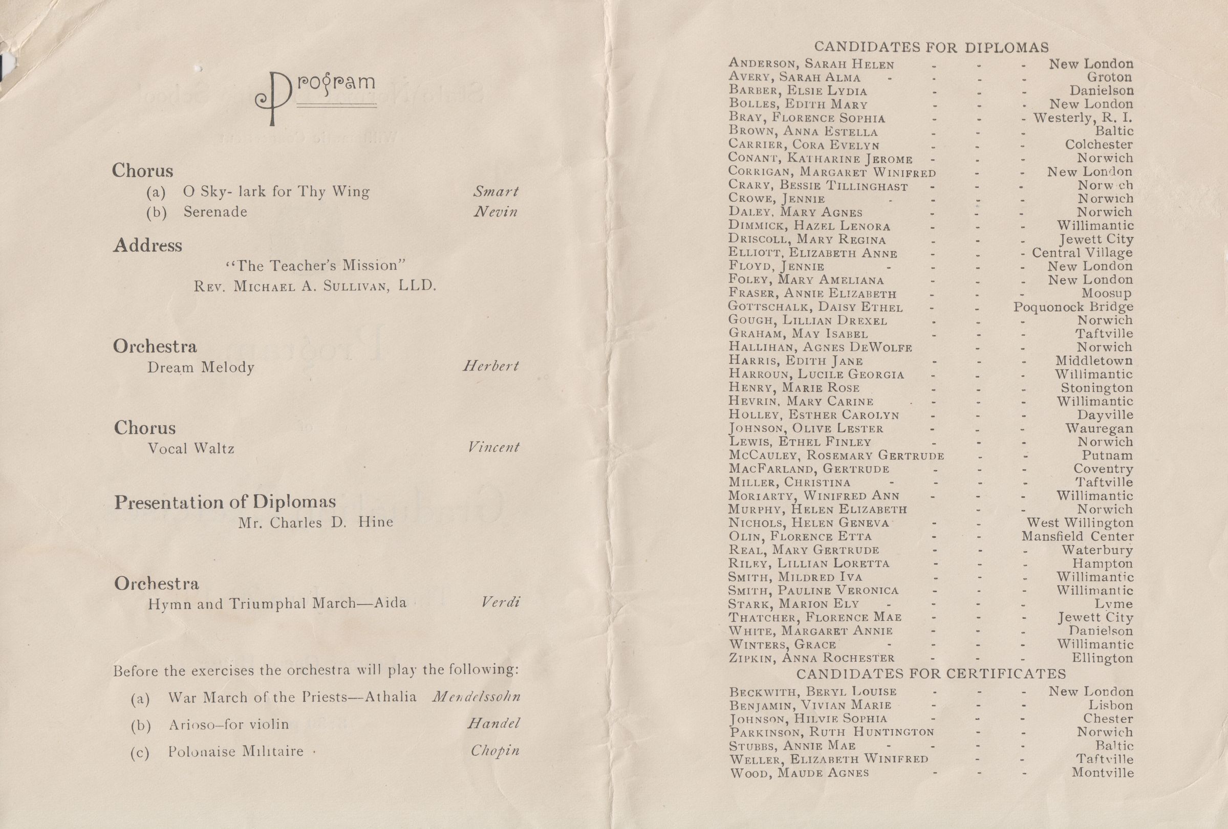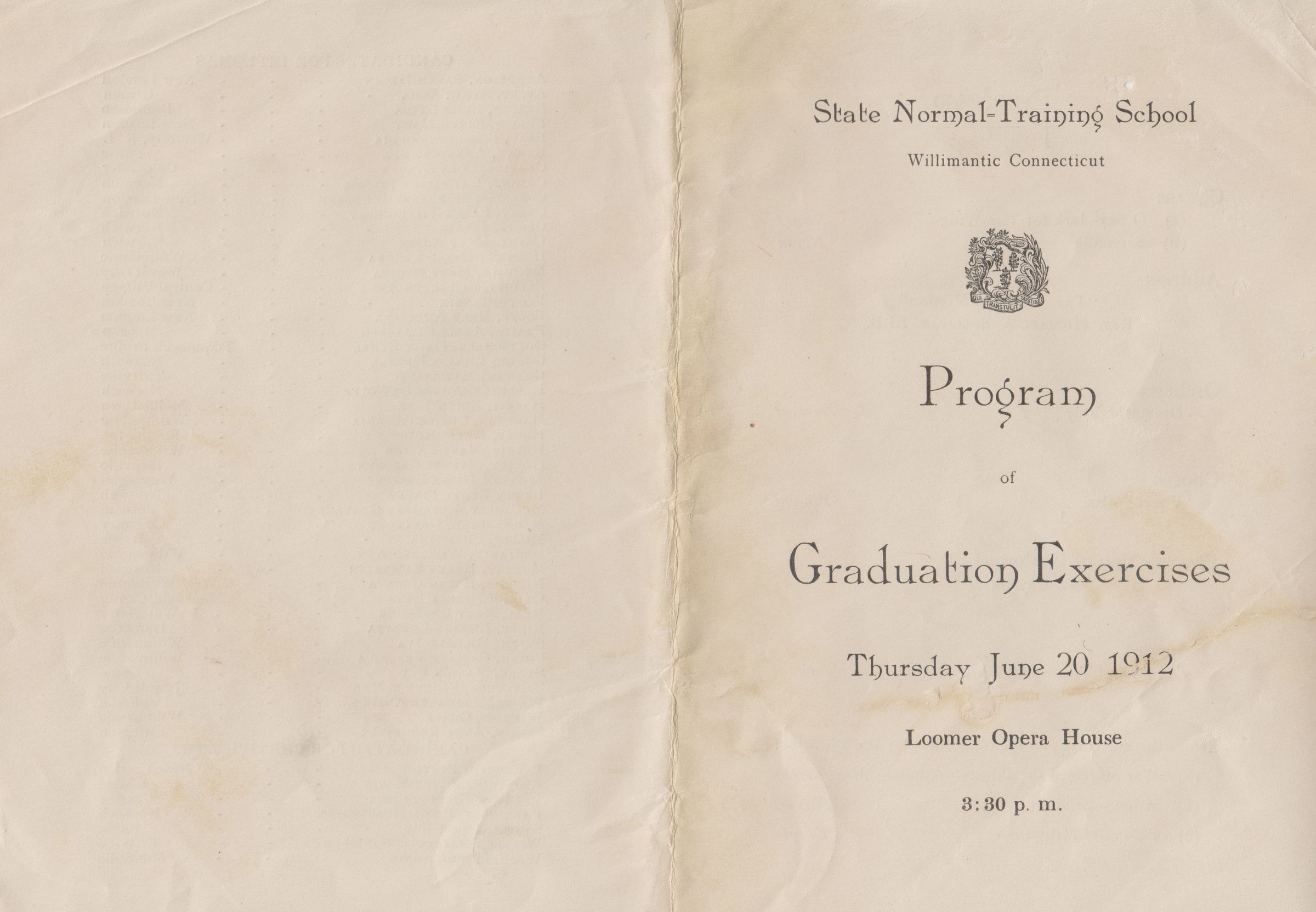 Program of Graduation Exercises, State Normal Training School, Willimantic, CT. Tuesday, June 20, 1912. Loomer Opera House. Among the candidates for diplomas was Pauline Veronica Smith.Collection