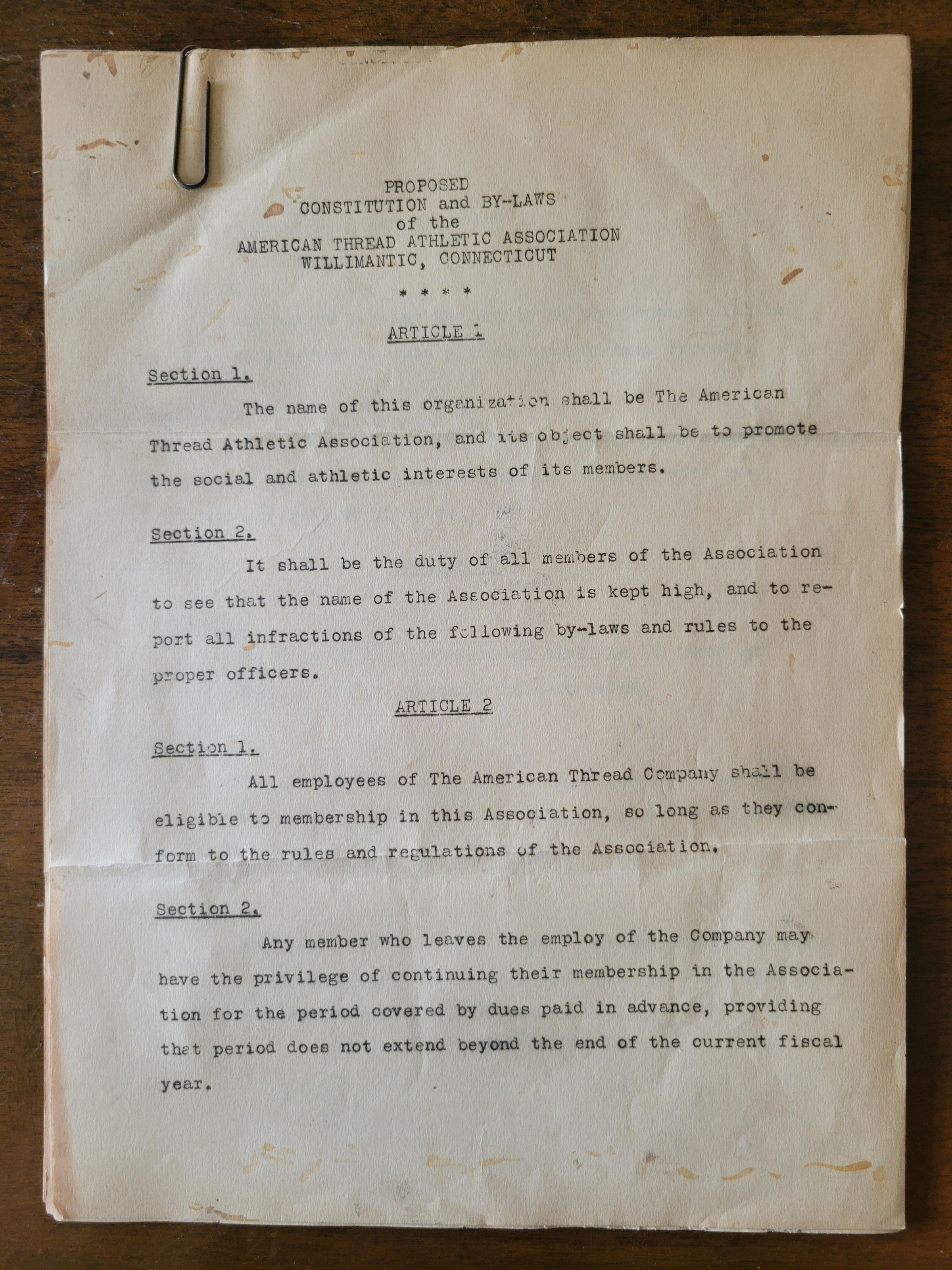 The proposed constitution and by-laws of the American Thread Athletic Association of Willimantic, Connecticut. Charles W. Hill spearheaded the athletic association of the American Thread Company, this document is his proposal of how it might be run. The pages are creased from being folded in thirds, and are yellowed and stained, held together by a paperclip in the upper left hand corner. Seven pages total.Collection