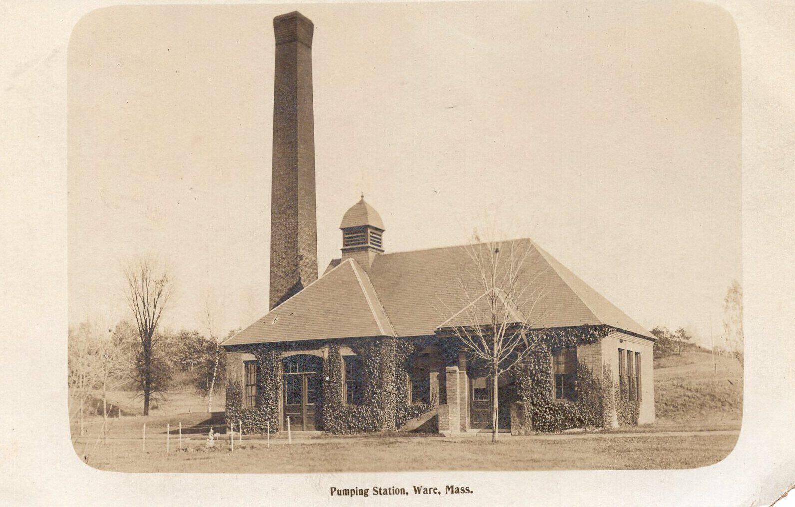 A black and white postcard of a pumping station in Ware, Mass.Condition