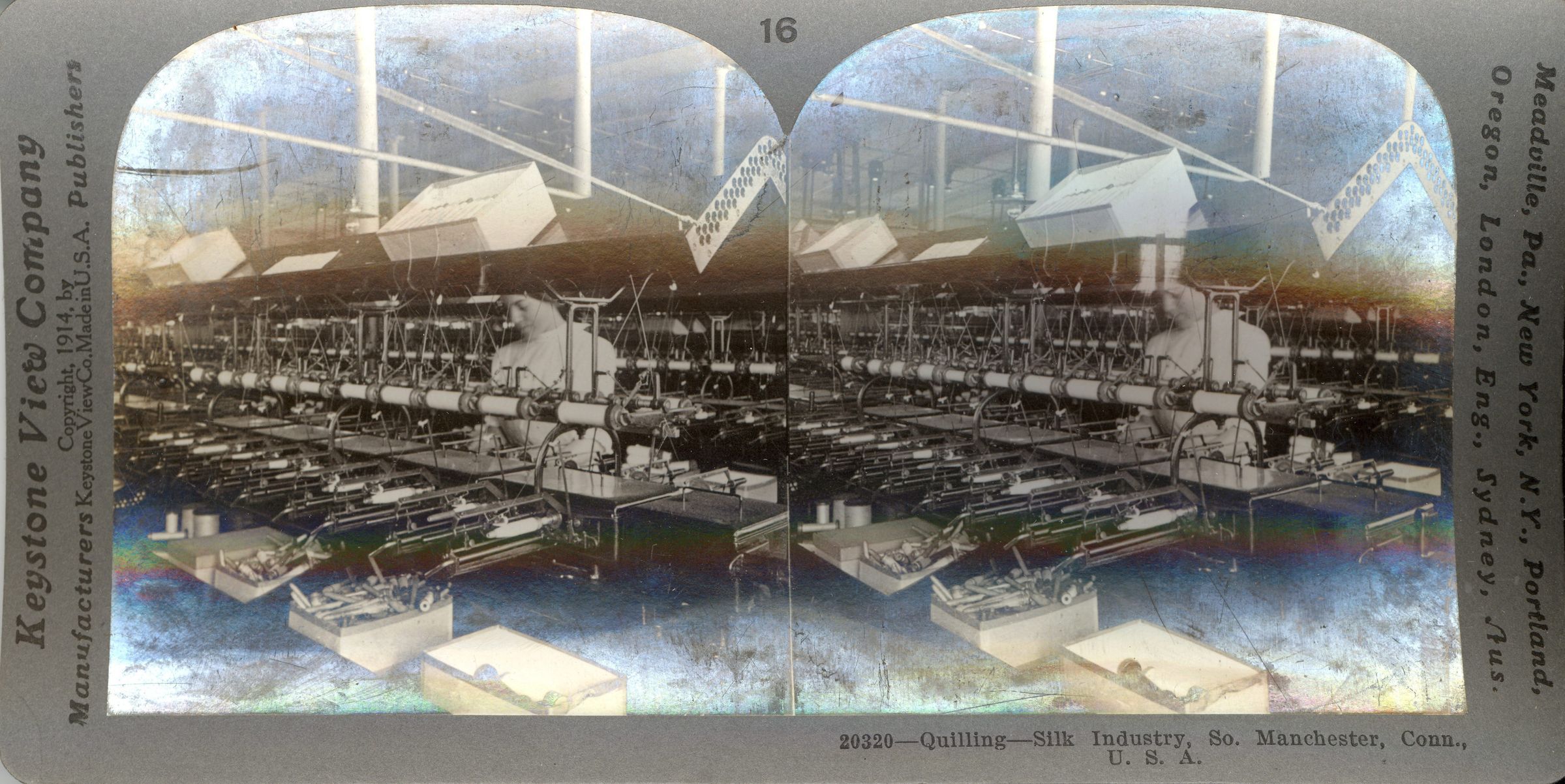 Stereograph of a worker at a quilling station. Quilling is the process of winding the silk thread onto the shuttle bobbins, commonly called quills, to be used on the loom. Taken at Cheney Brothers silk mills in South Manchester, CT 1914. Black and white print on cardboard. Card is warped. Unknown photographer. Studio: Keystone View Company, Meadville, PA. Serial #20303Photograph Details