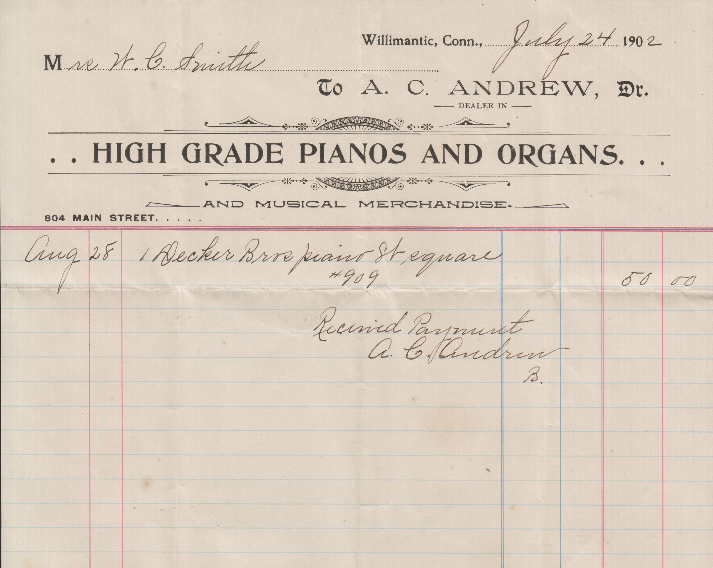 Receipt from Dr. A. C. Andrews, dealer in high grade pianos and organs and musical merchandise, 804 Main Street, Willimantic, CT, to Mrs. W. C. Smith. Payment made July 24, 1902. Receipt made August 28. 1 Decker Bros. piano [?] square #909. /s/ A. C. Andrew. $50.00.Collection