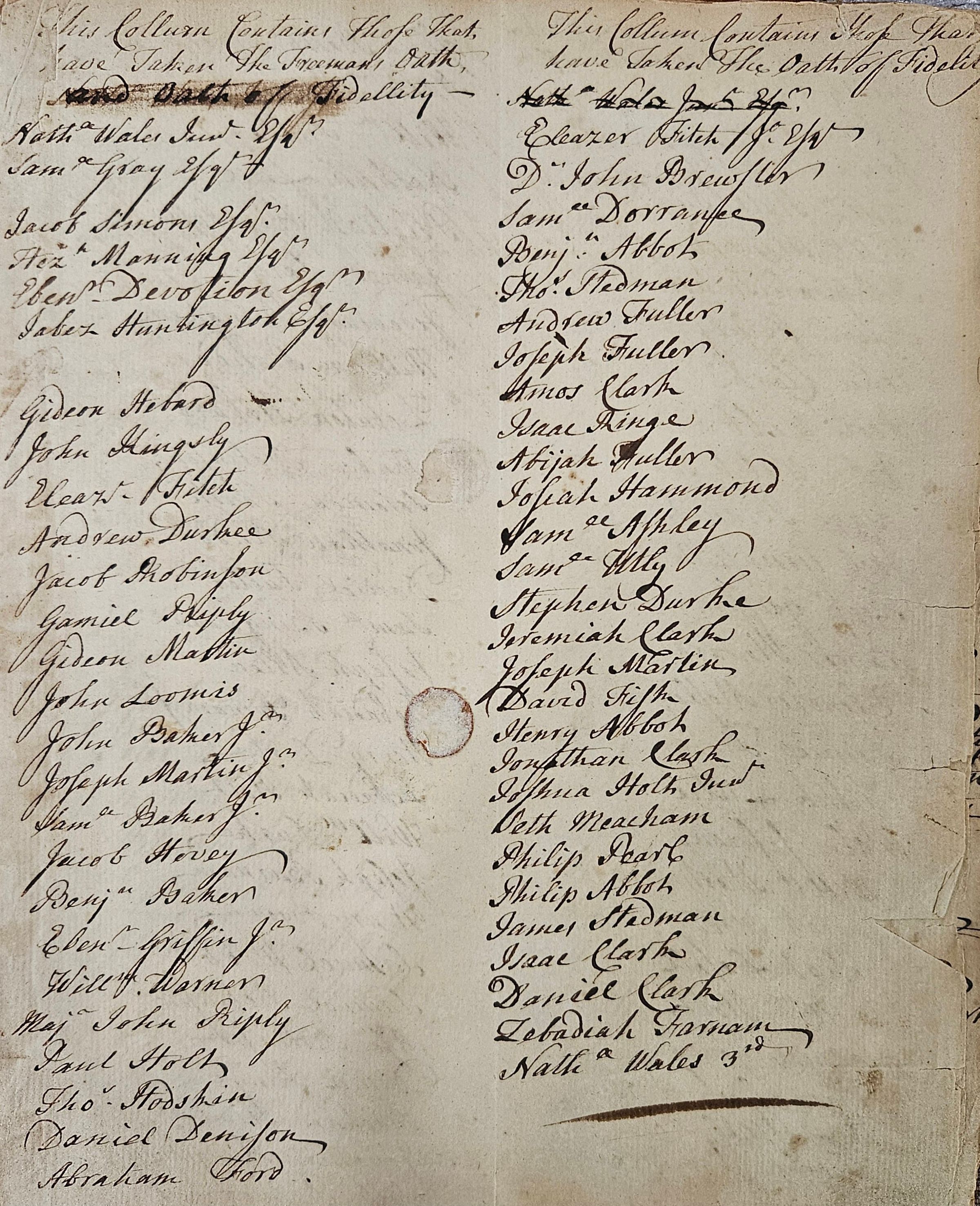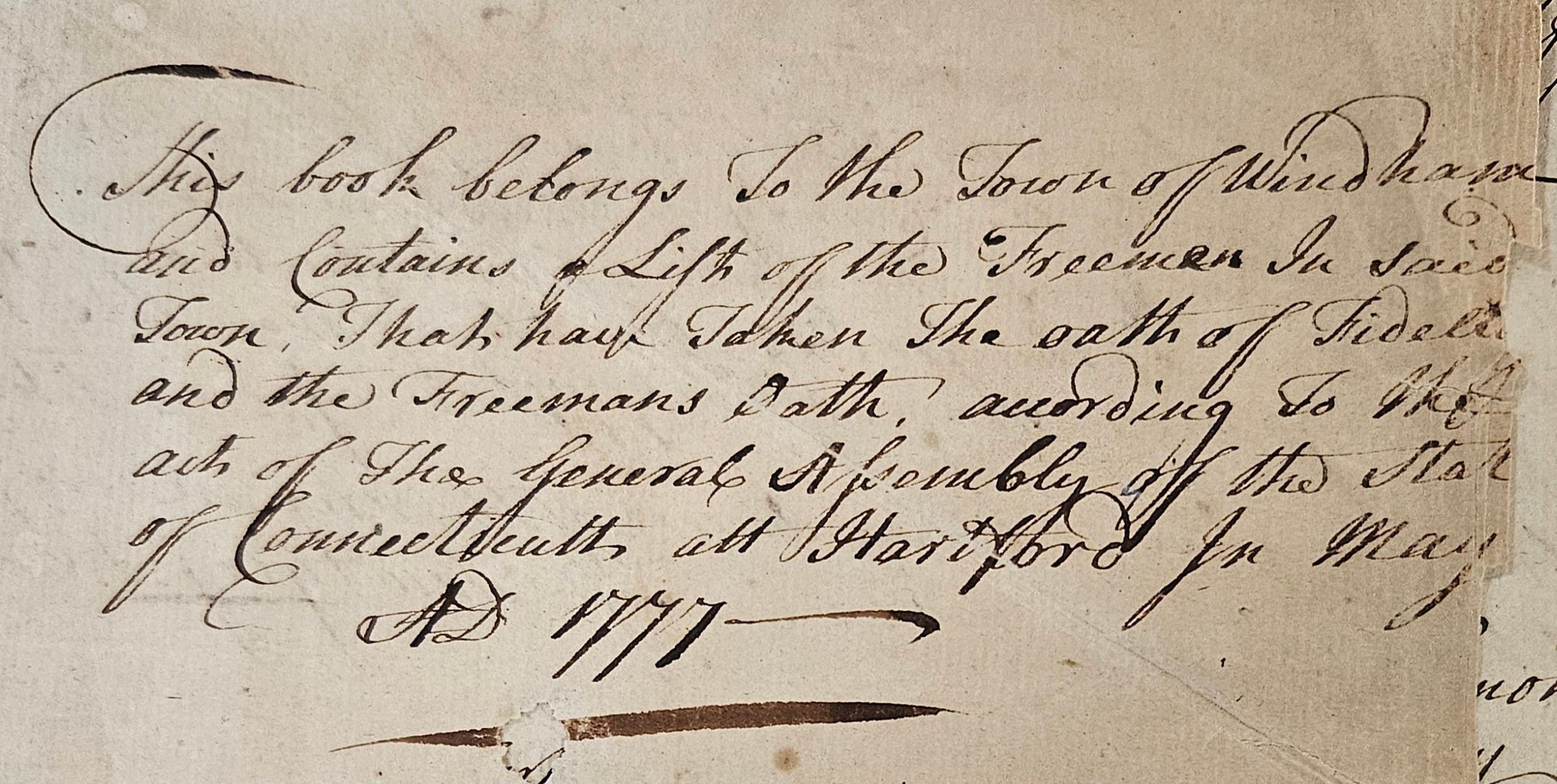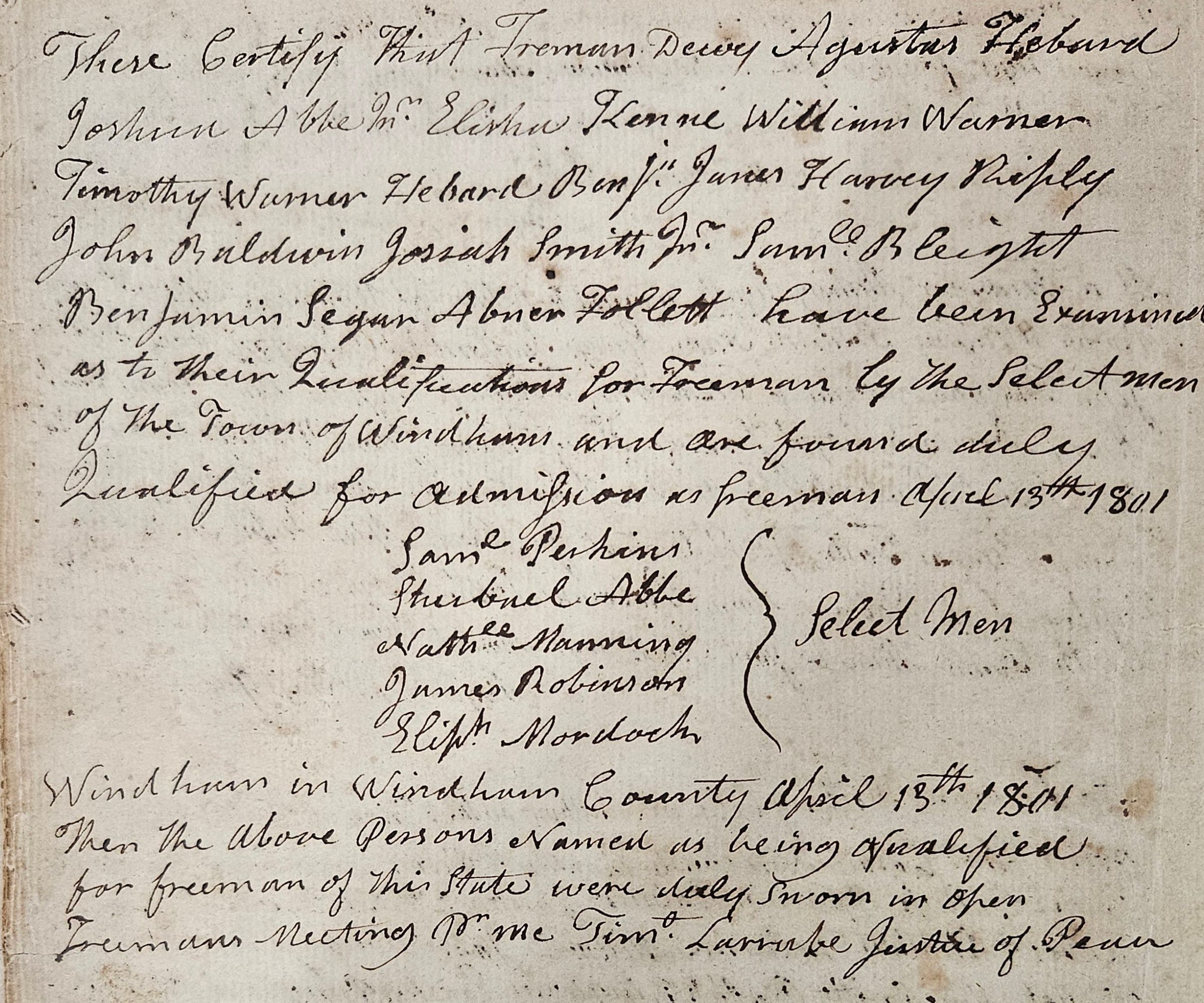 The definition of who could or could not be an elector changed over time. From 1638 until it was replaced by Connecticut's first Constitution in 1818, the Fundamental Orders restricted voting rights to property-owning males 21 or older. "Admitted inhabitants" were property-owning men who had been formally accepted by the town as inhabitants and therefore permitted to vote in town elections. Property qualifications in Connecticut and other British colonies were less stringent than in Britain itself, so the electorate was (in 17th- and 18th-century terms) relatively broad. "Freemen" also had to be members of the Puritan (Congregational) Church, and only they could hold most elective offices. While some changes in these rules were made over the years, major changes were made in 1818, when Connecticut became the last of the original Thirteen States to adopt a formal Constitution. The new Constitution removed religious qualifications for voting, but also restricted voting rights to white men only. (In fact, there is no evidence that nonwhite men had ever voted in Connecticut previously.) Property qualifications were retained, but as before, were set fairly low. Connecticut did removed property qualifications in the 1840s, as part of a broader, nationwide movement for universal white manhood suffrage. Shortly after, though, in 1855 Connecticut added the requirement that electors must pass a literacy test. In 1897, the law was amended to specify that the language of literacy must be English. The 1855 law also required citizenship and at least a year's residency, all designed to prevent Irish immigrant men from voting. Connecticut was the first state to enact literacy requirements. Several attempts were made over the years to extend voting rights to nonwhite men, and some were even passed by the legislature, but all failed to win a majority in statewide referenda. (The Connecticut Constitution requires that amendments to the State Constitution be passed both by a vote of the legislature and a statewide referendum.) Finally, the 15th Amendment to the U.S. Constitution (passed 1870) overrode the Connecticut Constitution by outlawing racial discrimination in voting, a fact that was recognized in 1876 by an amendment to the State Constitution to eliminate the word "white" from the definition of electors. Thus, for all but the last two years of the period covered by this record book, electors in Connecticut were restricted to white males 21 or older, and for most of that period also to property owners. And for several years, literacy requirements were also in effect. In Connecticut, women did not get the right to vote until 1920, with the passage of the 19th Amendment to the U.S. Constitution and subsequent enabling legislation by the state legislature. Literacy requirements remained in effect until 1970, when they were declared unconstitutional by the U.S. Supreme Court.Collection