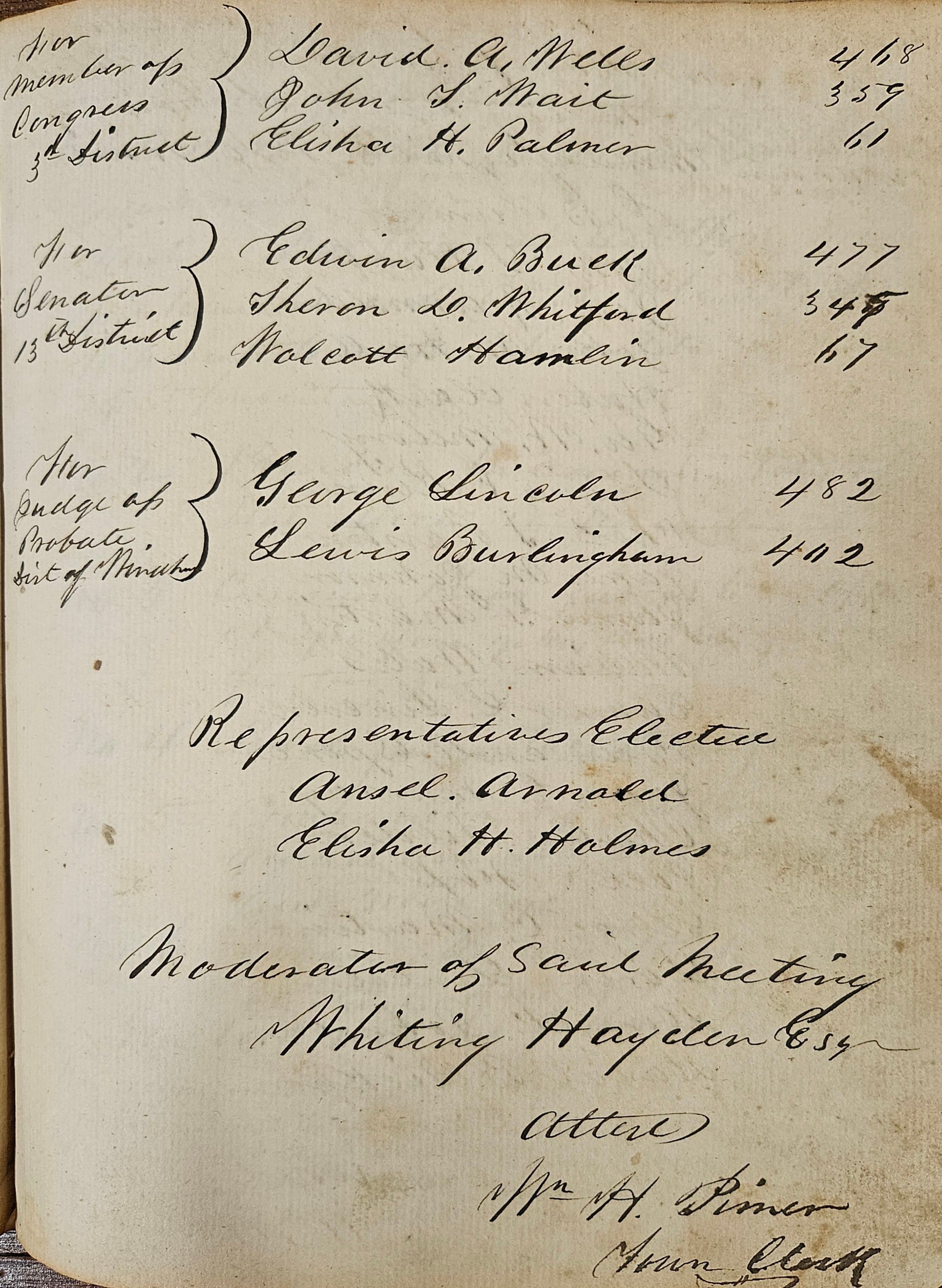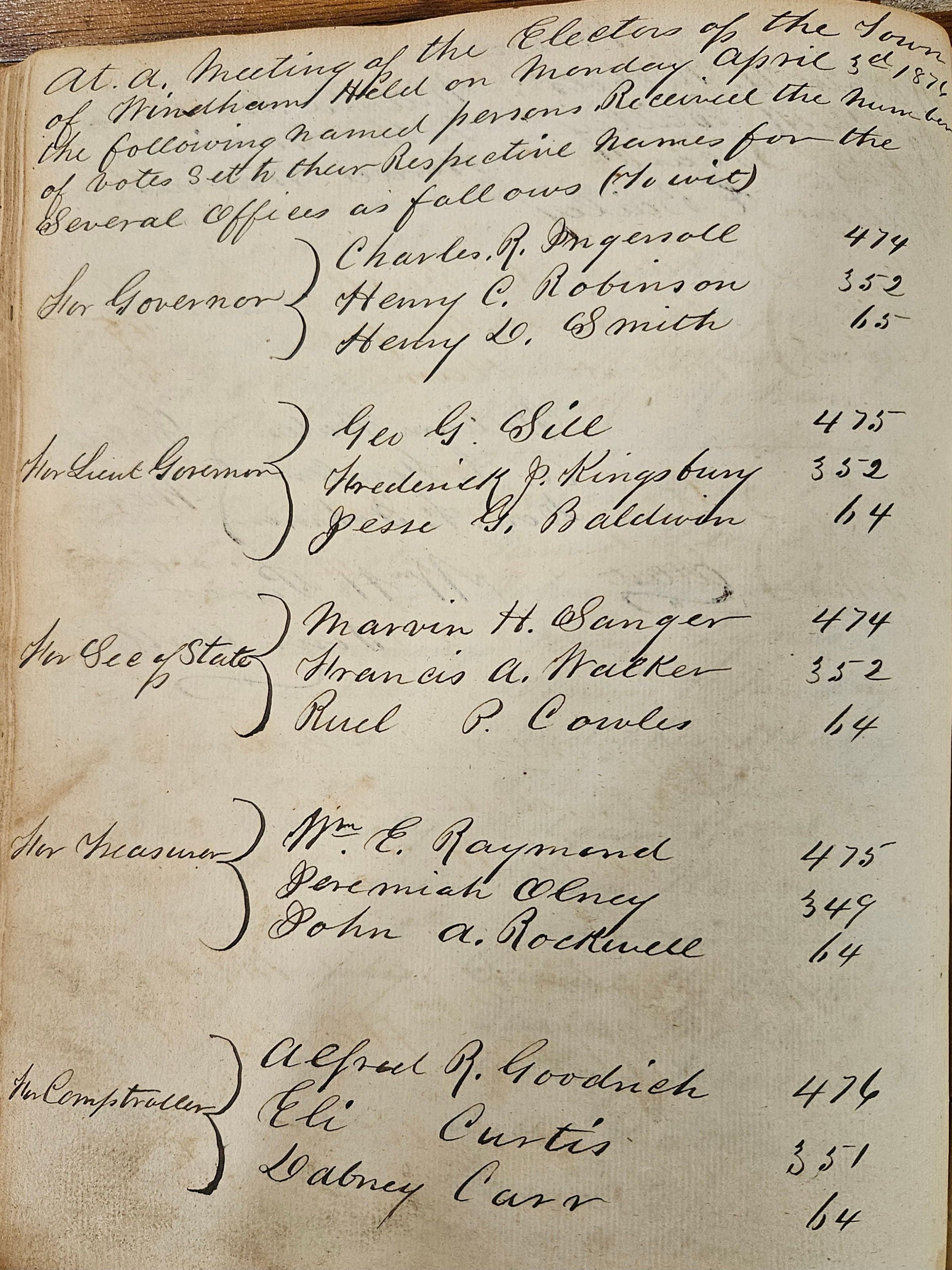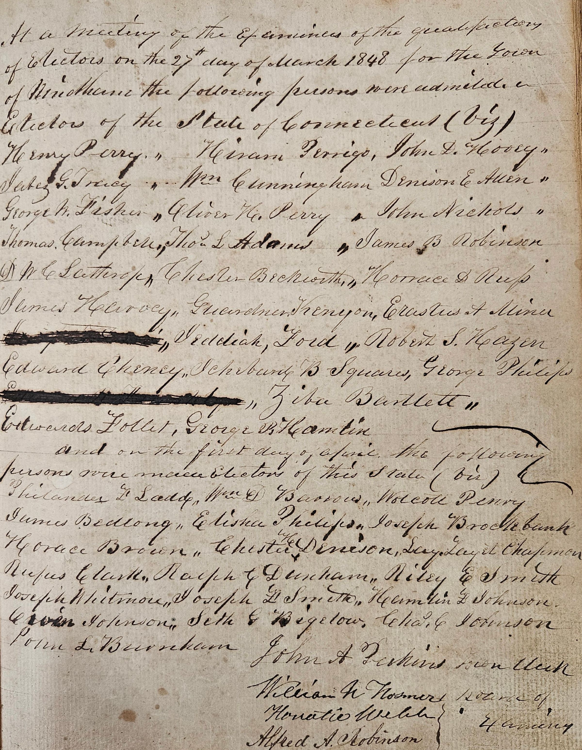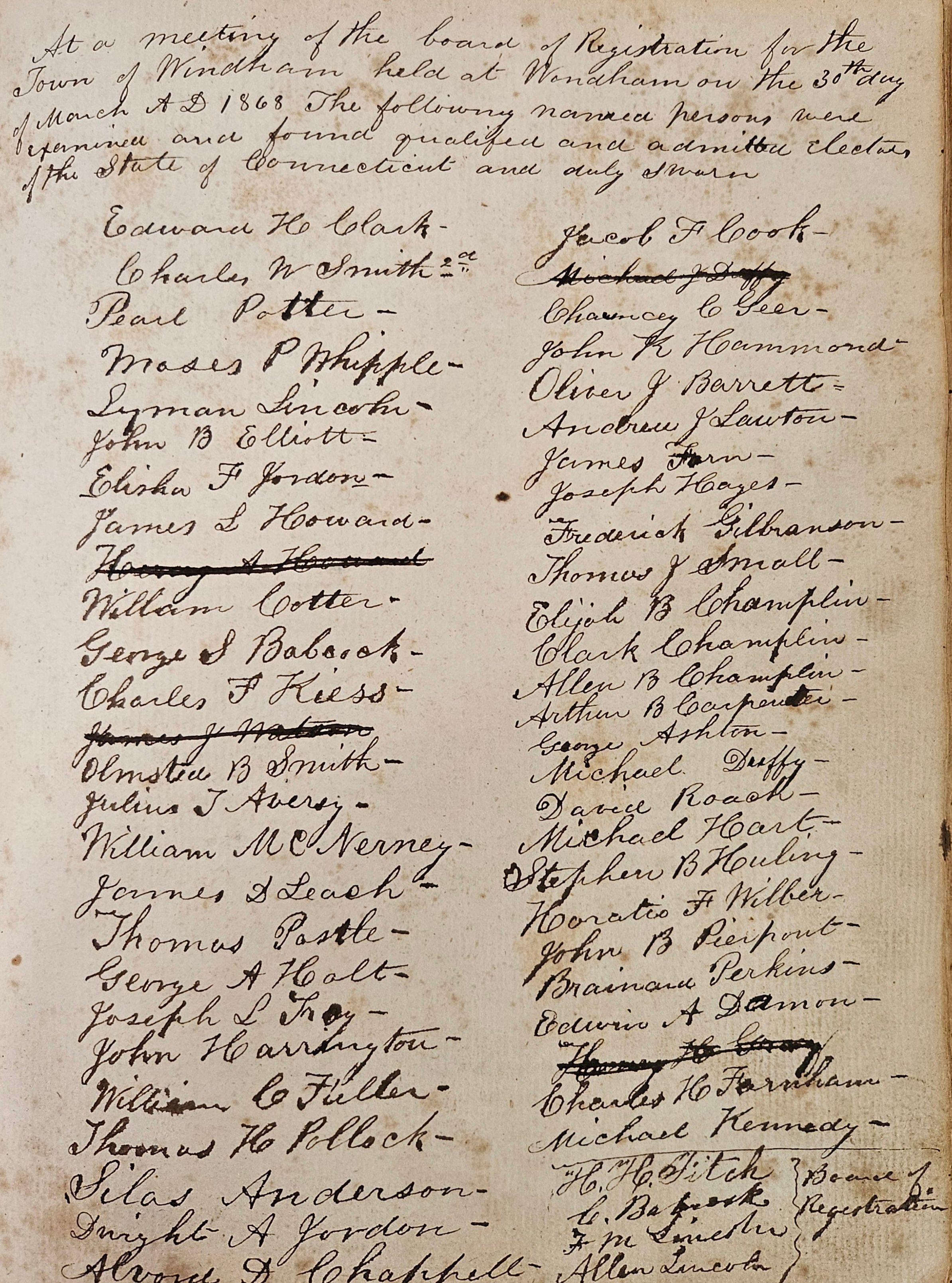 The electors of a town were those individuals who were entitled and registered to vote. Voting rights included the right to participate in town meetings (also known as electors' meetings) and run for office. Under the New England Town Meeting Government in effect at the time, electors' meetings played a central role in local government. It was at these meetings that town officials (selectmen, Town Clerk, etc.) were chosen, town budgets were ratified, and many town ordinances were passed. Town government should not be confused with borough government. In the 19th century, the Connecticut General Assembly granted residents of urban areas the right to set themselves off as "boroughs" (later "cities") with limited self government, mostly over such urban concerns and issues as fire protection, police protection, paving streets, etc. -- and which in time were extended to include sewer and water services -- and tax themselves for the costs. Boroughs were thus governments within governments, as town government continued to handle wider, town-wide concerns such as education. The borough of Willimantic was established in the 1830s for the urban area of Willimantic in the northwest part of Windham. This record is a Town of Windham -- not a borough of Willimantic -- document, although all of the Windham electors who lived in Willimantic could also vote for borough officers, such as aldermen, as well as for Town officials.