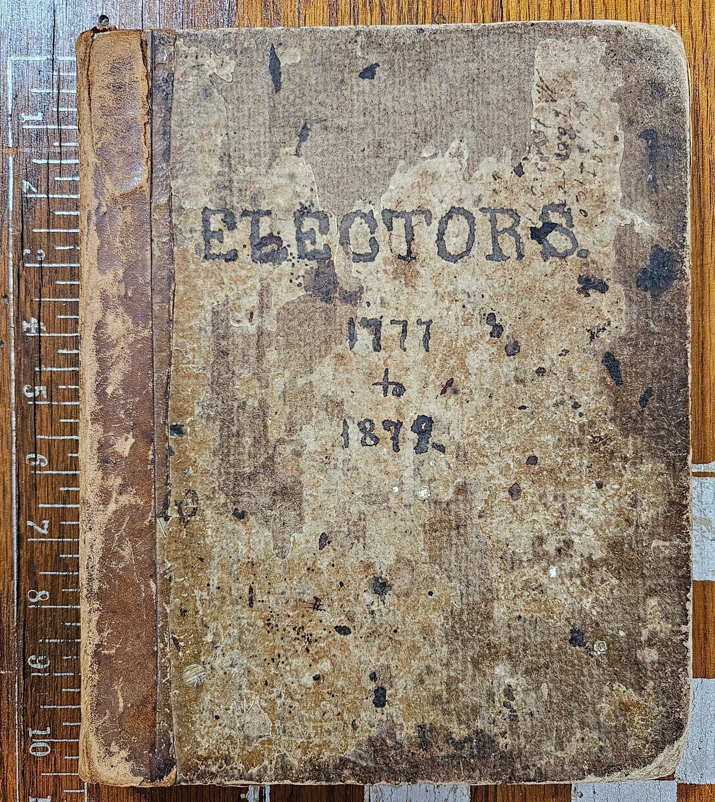 "Electors, 1777 to 1878." Records of electors of the Town of Windham, CT, 1777-1878. Includes lists of electors and minutes of electors' meetings. Handwritten on blank white pages in several different hands. Possibly kept by the Windham Town Clerk. Brown cardboard covers with leather spine.Context