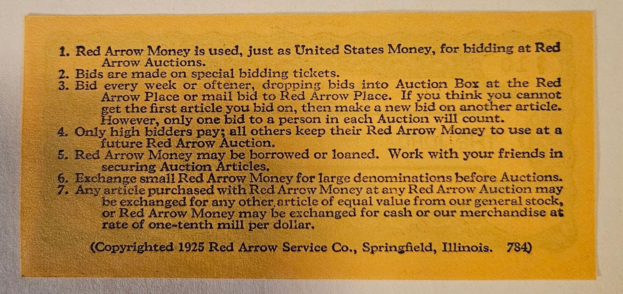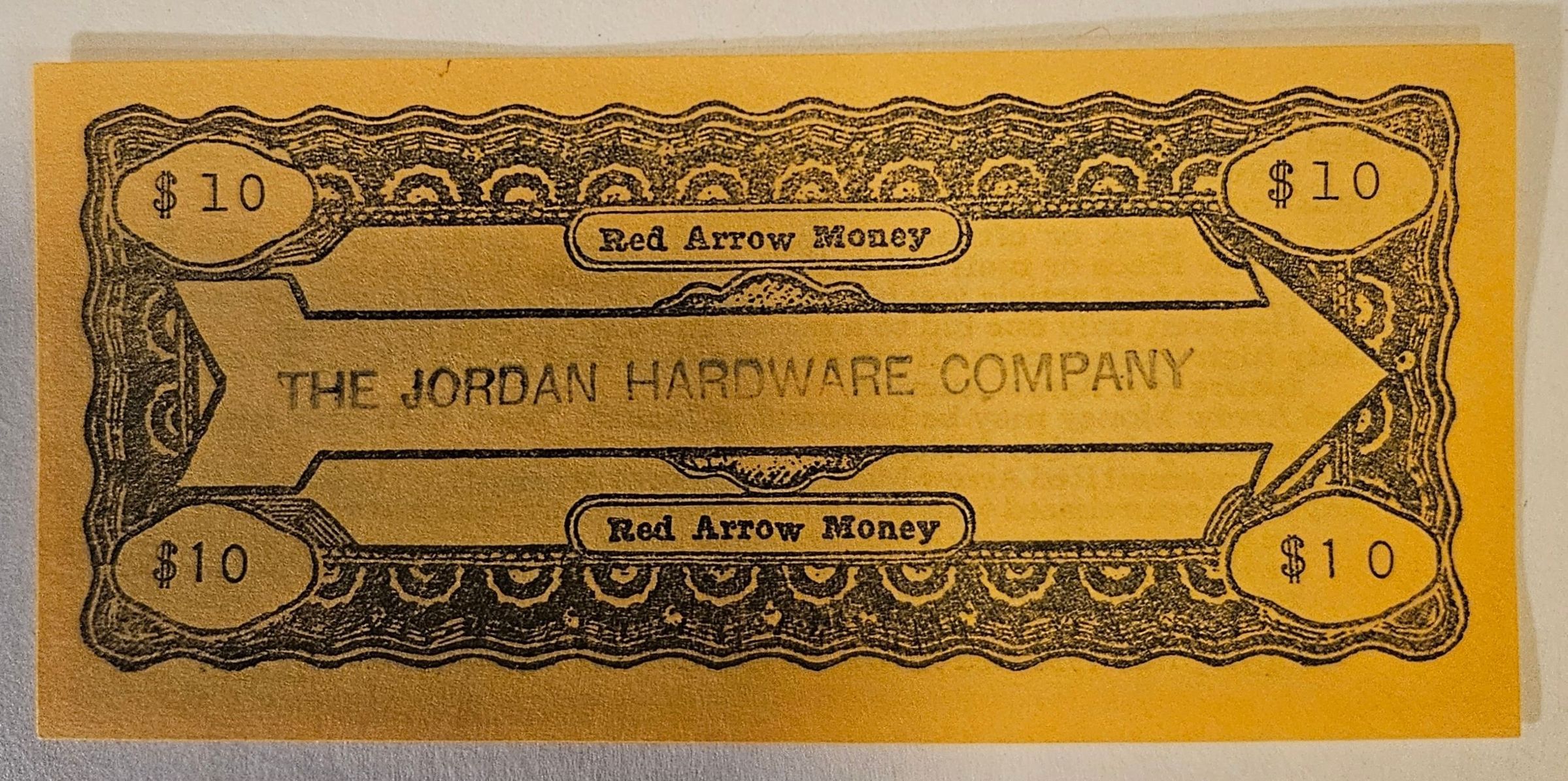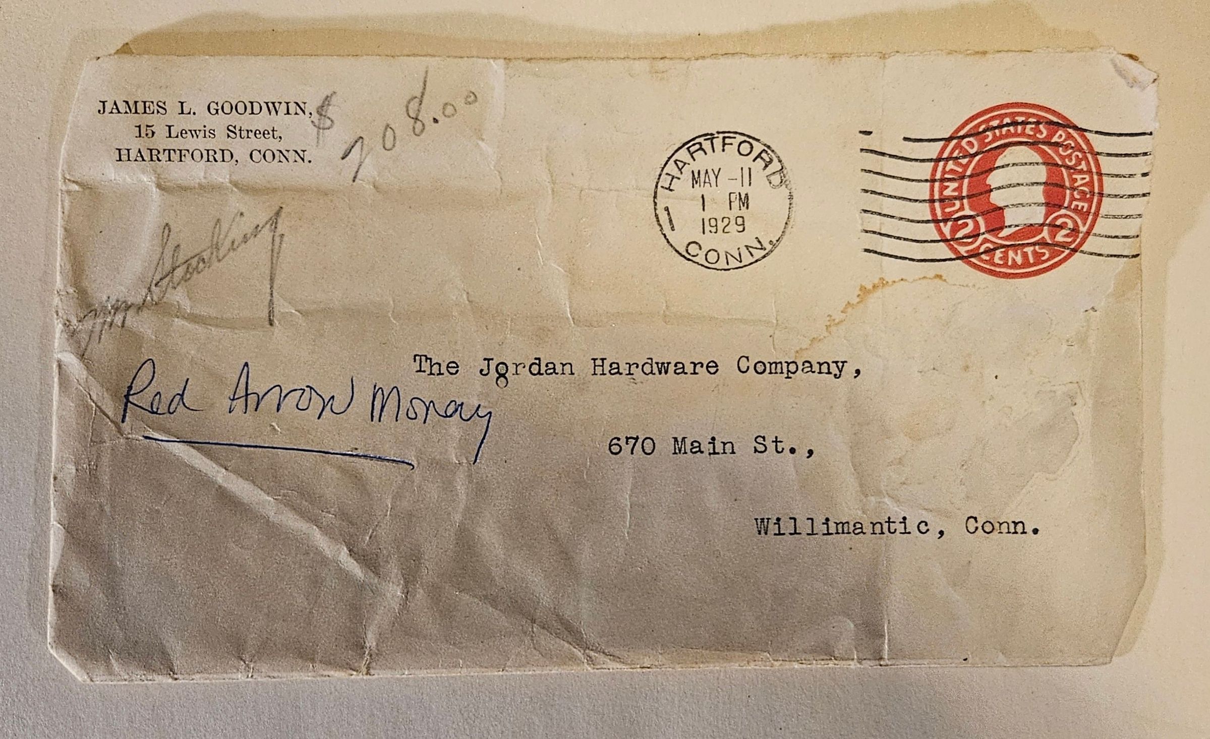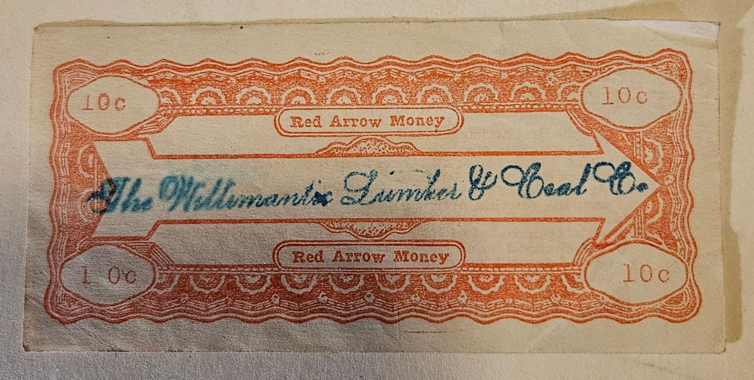 Envelope filled with "Red Arrow Money," scrip printed by the Red Arrow Service Co., and auction company, and stamped with the names of two local Willimantic businesses: the Jordan Hardware Company and the Willimantic Lumber & Coal Co. The "money" comes in several different denominations, ranging from 10 cents to ten dollars. There are 29 pieces of scrip in the envelope. On the reverse of each scrip is printed a description of what Red Arrow Money was (It was to be used to bid for items at auction) and a note that it was copyrighted 1925 by the Red Arrow Service Co. of Springfield, Illinois. The envelope was addressed to The Jordan Hardware Company, 670 Main St., Willimantic, Conn. and carried a return address of James L. Goodwin, 15 Lewis Street, Hartford, Conn. It has a postal stamp of Hartford, Conn., May 11, 1 PM, 1929. Canceled postage was 2 cents.Use