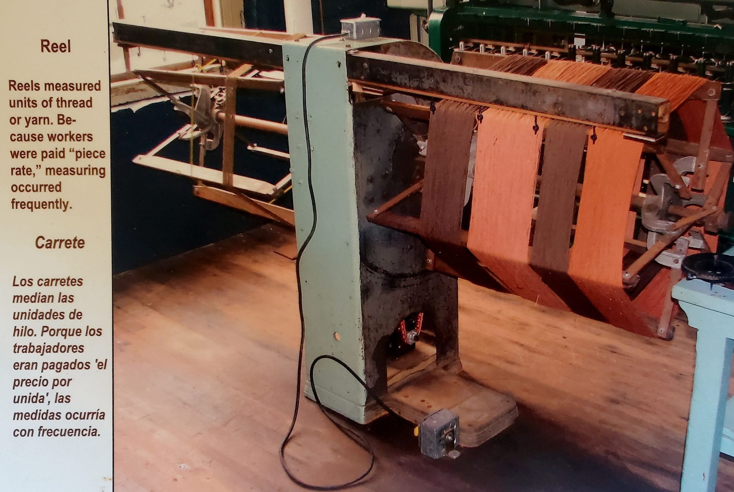Industrial reel. Reels measured units of thread or yarn. This reel is powered by electricity. Date unknown.Use