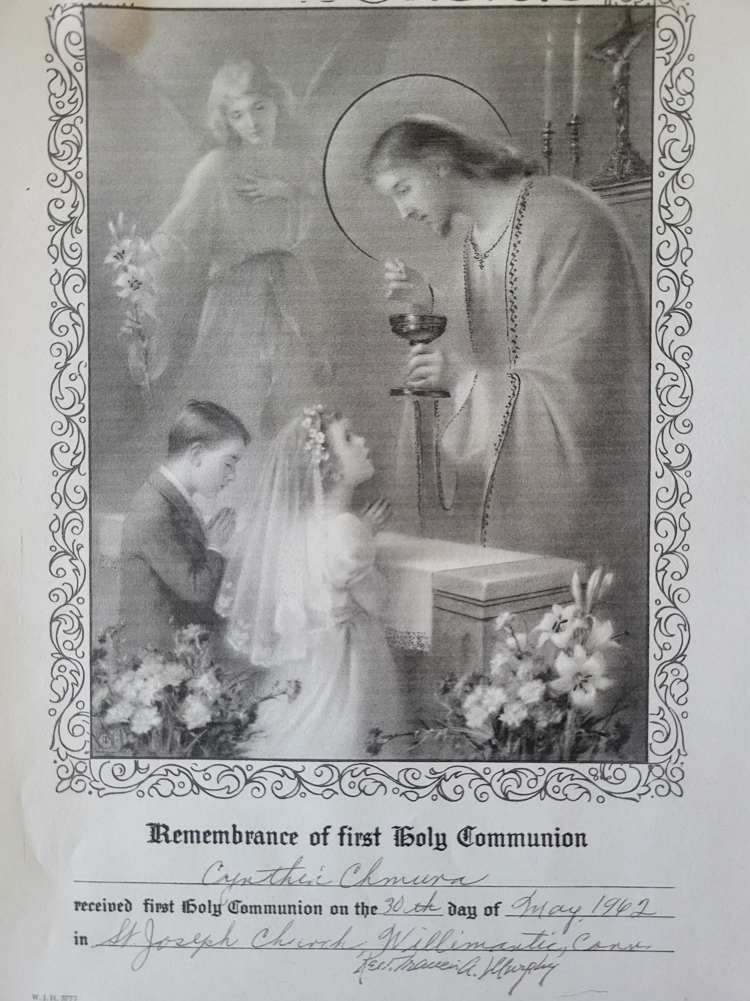 Photocopy of document featuring an artist's rendering of Jesus presenting the Eucharist to two children. Below is typed/written: Remembrance of first Holy Communion; Cynthia Chmura; received first Holy Communion on the 30th day of May, 1962; in St Joseph Church, Willimantic, Conn.Collection