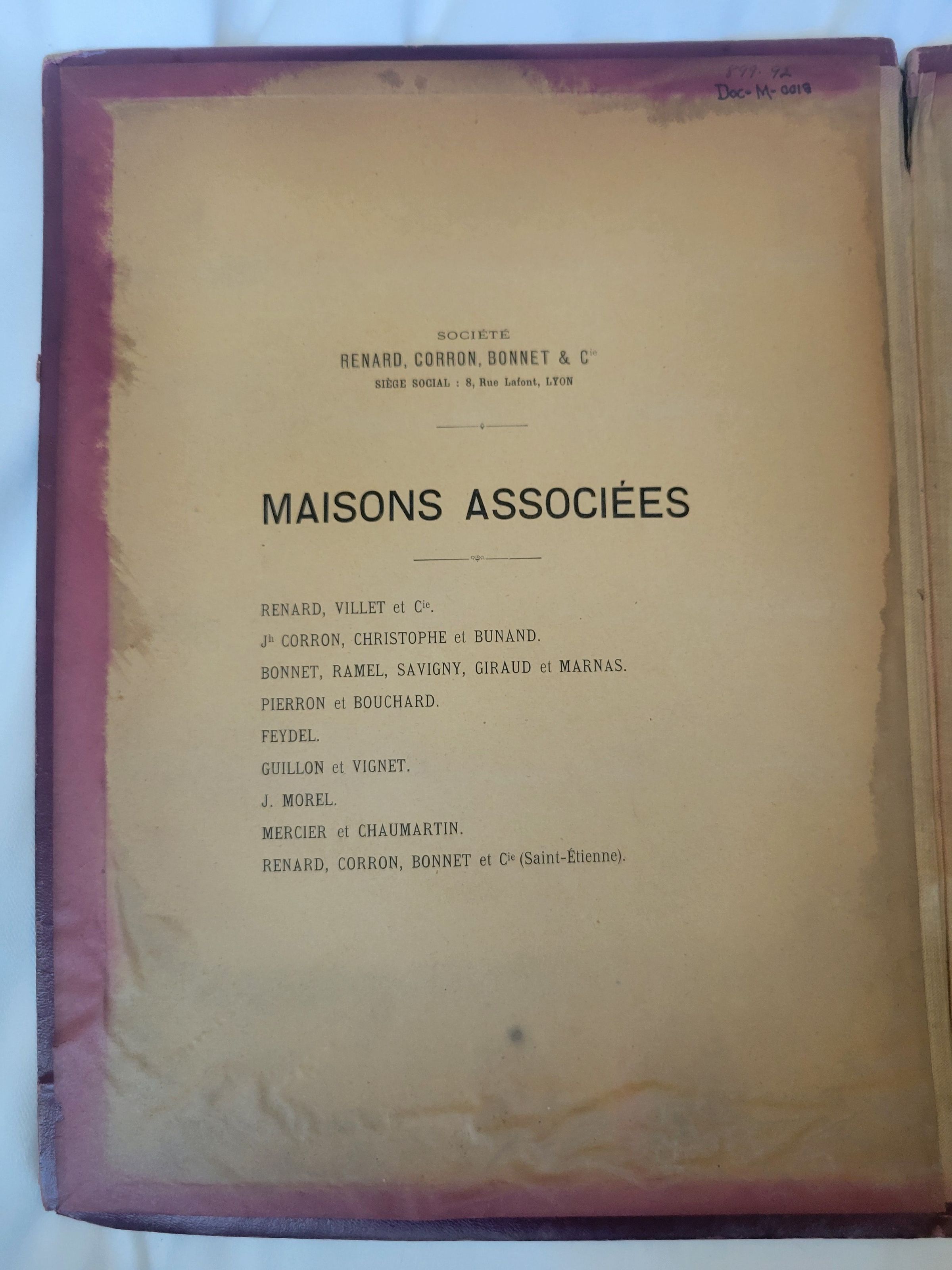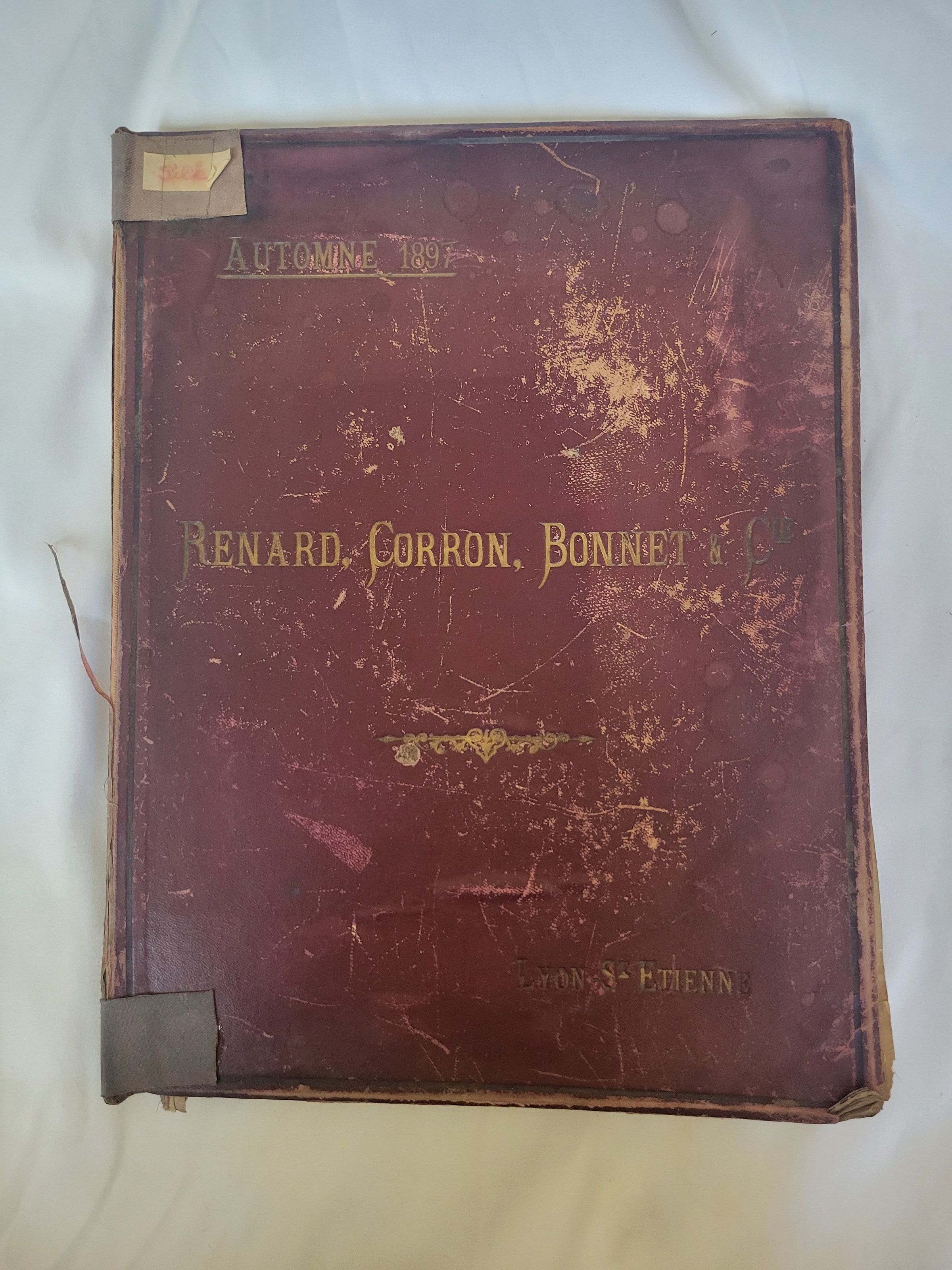 A red leather sample book of thread from French dye company Renard, Corron, Bonnet et Cie. This book is from the Autumn 1897 collection. Books were produced for the Spring and Autumn season and distributed from the Lyon-Saint Etienne area in France, the company's head office being in Lyon. The inside front cover features a list of associated firms from which the company's wares could be purchased, and the rest of the book is dedicated to wrapped samples of thread, listed with their collection name and number. While the numbers are printed, the collection names appear to be handwritten. The book is heavily water damaged and has significant scratch and rub damage on the covers. The binding is delicate and has been repaired in part by two pieces of book tape, one at the top and one at the bottom. Some of the dyes from the threads have run and many of the samples are loose in the book or missing entirely.Use