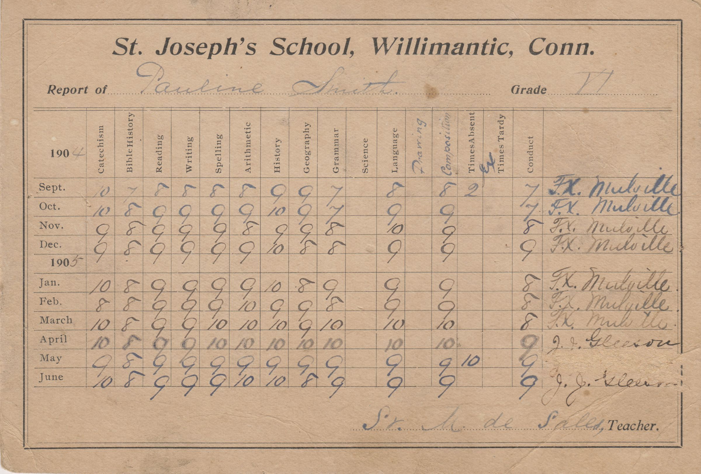 Report card from St. Joseph's School in Willimantic, CT, for Pauline Smith. Grade II. Circa 1899. Signed by Sr. M. de Sales, teacher.Collection